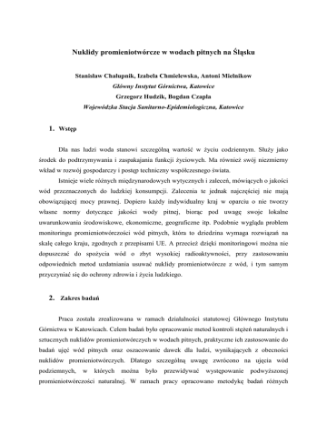 Nuklidy promieniotwórcze w wodach pitnych na Śląsku Stanisław Chałupnik, Izabela Chmielewska, Antoni Mielnikow Główny Instytut Górnictwa, Katowice Grzegorz Hudzik, Bogdan Czapla Wojewódzka Stacja Sanitarno-Epidemiologiczna, Katowice 1. Wstęp Dla nas ludzi woda stanowi szczególną wartość w Ŝyciu codziennym. SłuŜy jako środek do podtrzymywania i zaspakajania funkcji Ŝyciowych. Ma równieŜ swój niezmierny wkład w rozwój gospodarczy i postęp techniczny współczesnego świata. Istnieje wiele róŜnych międzynarodowych wytycznych i zaleceń, mówiących o jakości wód przeznaczonych do ludzkiej konsumpcji. Zalecenia te jednak najczęściej nie mają obowiązującej mocy prawnej. Dopiero kaŜdy indywidualny kraj w oparciu o nie tworzy własne normy dotyczące jakości wody pitnej, biorąc pod uwagę swoje lokalne uwarunkowania środowiskowe, ekonomiczne, geograficzne itp. Podobnie wygląda problem monitoringu promieniotwórczości wód pitnych, która to dziedzina wymaga rozwiązań na skalę całego kraju, zgodnych z przepisami UE. A przecieŜ dzięki monitoringowi moŜna nie dopuszczać do spoŜycia wód o zbyt wysokiej radioaktywności, przy zastosowaniu odpowiednich metod uzdatniania usuwać nuklidy promieniotwórcze z wód, i tym samym przyczyniać się do ochrony zdrowia i Ŝycia ludzkiego. 2. Zakres badań Praca została zrealizowana w ramach działalności statutowej Głównego Instytutu Górnictwa w Katowicach. Celem badań było opracowanie metod kontroli stęŜeń naturalnych i sztucznych nuklidów promieniotwórczych w wodach pitnych, praktyczne ich zastosowanie do badań ujęć wód pitnych oraz oszacowanie dawek dla ludzi, wynikających z obecności nuklidów promieniotwórczych. Dlatego szczególną uwagę zwrócono na ujęcia wód podziemnych, w których moŜna było przewidywać występowanie podwyŜszonej promieniotwórczości naturalnej. W ramach pracy opracowano metodykę badań róŜnych nuklidów promieniotwórczych w próbkach wód, wykonano pobór próbek z wytypowanych wraz z Wojewódzką Stacją Sanitarno-Epidemiologiczną (WSSE) ujęć, przeprowadzono ich badania a następnie oszacowano ich wpływ na potencjalnych konsumentów. Artykuł zawiera wyniki badań niektórych ujęć wód pitnych na Górnym Śląsku i został przesłany do publikacji w Postępach Techniki Jądrowej. Monitoring wód prowadzony był przez Laboratorium Radiometrii Głównego Instytutu Górnictwa we współpracy z Wojewódzką Stacją Sanitarno-Epidemiologiczną w Katowicach, zgodnie z wymaganiami Dyrektywy dla Wód Pitnych [Drinking Water Directive, 1998] a zarazem Rozporządzeniem Ministra Zdrowia [Rozporządzenie, 2007]. 3. Przegląd zaleceń i wymagań odnoszących się do jakości wód pitnych pod względem promieniotwórczości Jednym z wiodących autorytetów w dziedzinie jakości wody pitnej jest Światowa Organizacja Zdrowia WHO. Podejście ekspertów z WHO zgodnie z „Guidelines for Drinking Water Quality” [trzecie wydanie 2004r.] w sprawie promieniotwórczości jest dwuetapowe: • wstępne badanie przesiewowe w celu określenia całkowitej aktywności alfa i/lub beta [w Bq/l]. JeŜeli otrzymane wartości nie przekraczają 0,5 Bq/l dla całkowitej aktywności alfa oraz 1 Bq/l dla beta, nie jest wymagane podejmowanie dalszych analiz. Woda nadaje się do picia. • w przypadku przekroczenia którejś z wartości naleŜy określić stęŜenie promieniotwórcze poszczególnych radionuklidów, a następnie oszacować sumaryczną dawkę pochodzącą od ich wchłonięcia. JeŜeli nie przekracza ona wartości 0,1 mSv/rok woda jest zdatna do picia. JeŜeli obliczona dawka przekracza zalecaną wartość, woda nie powinna być spoŜywana. W tym wypadku naleŜy przeprowadzić dodatkowe procesy uzdatniania, mające na celu usunięcie nuklidów promieniotwórczych z wody. W Unii Europejskiej aktami regulującymi tę tematykę są dyrektywy, z których najwaŜniejsza jest Dyrektywa dla Wód Pitnych uchwalona przez Komisję Europejską w 1998 roku [Drinking Water Directive, 1998]. Dyrektywa nie róŜnicuje nuklidów ze względu na pochodzenie (naturalne lub antropogeniczne), jak równieŜ nie określa wprost, które z izotopów radioaktywnych powinny być brane pod uwagę. Jedyny wyjątek stanowi izotop trytu 3H, którego dopuszczalna wartość jest wymieniona wprost i wynosi 100 Bq/l. Dyrektywa określa natomiast tak zwaną całkowitą dawkę wskaźnikową (ang. TID – total indicative dose) na poziomie 0,1 mSv/rok od izotopów promieniotwórczych zawartych w wodzie. Korzystając z wartości obciąŜających dawek skutecznych (podanych w Dyrektywie Rady Unii Europejskiej Nr 96/29 Euratom) [Euratom, 1996], dla jednostkowego wniknięcia nuklidu promieniotwórczego dla osób z poszczególnych grup wiekowych, przy załoŜonym limicie dawki 0,1 mSv/rok, moŜna wyliczyć maksymalne dopuszczalne stęŜenie aktywności danego izotopu w wodzie. Dodatkowym aktem prawnym, określającym dopuszczalne zawartości nuklidów promieniotwórczych w wodach jest Dyrektywa 2001/928/Euratom, zatytułowana The Protection of the Public against Exposure to Radon in Drinking Water Supplies [Dyrektywa 2001/928/Euratom, 2001]. Dotyczy ona dodatkowej ochrony społeczeństwa przed moŜliwymi skutkami wysokich stęŜeń radonu w wodach pitnych ze względu na moŜliwość podwyŜszonych stęŜeń tego nuklidu w powietrzu mieszkań, gdzie takie wody są uŜywane do celów toaletowych. W Dyrektywie tej zawarte są dwa poziomy stęŜeń radonu - referencyjny, równy 100 Bq/l i zaradczy - 1000 Bq/l. W przypadku przekroczenia poziomu referencyjnego, wymagana jest dodatkowo kontrola stęŜeń radonu w mieszkaniach, do których dostarczana jest woda o takim stęŜeniu radonu, natomiast przy przekroczeniu 1000 Bq/l wymagane jest podjęcie środków w celu obniŜenia stęŜenia radonu w uzdatnionej wodzie. Dyrektywa ta podaje równieŜ dodatkowo poziomy referencyjne dla nuklidów pochodnych o długim okresie