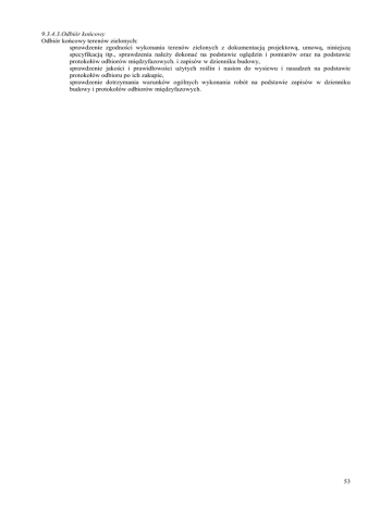 9.3.4.3.Odbiór końcowy Odbiór końcowy terenów zielonych: sprawdzenie zgodności wykonania terenów zielonych z dokumentacją projektową, umową, niniejszą specyfikacją itp., sprawdzenia naleŜy dokonać na podstawie oględzin i pomiarów oraz na podstawie protokołów odbiorów międzyfazowych. i zapisów w dzienniku budowy, sprawdzenie jakości i prawidłowości uŜytych roślin i nasion do wysiewu i nasadzeń na podstawie protokołów odbioru po ich zakupie, sprawdzenie dotrzymania warunków ogólnych wykonania robót na podstawie zapisów w dzienniku budowy i protokołów odbiorów międzyfazowych. 53 9.2.2. MATERIAŁ 10.2.2.1. Kostka betonowa grubości 6 cm. 10.2.2.2. ObrzeŜe betonowe o wymiarach 8x30xl00cm. 9.2.3.TECHNOLOGIA WYKONANIA Wokół modernizowanego budynku wykonać chodniki z kostki betonowej oraz plac utwardzony od strony frontowej budynku równieŜ z kostki betonowej. Chodniki wykonać z kostki betonowej POLBRUKU grubości 6 cm, na podsypce z piasku stabilizowanego cementem grubości 10cm. Projektowane chodniki i place obramować krawęŜnikiem drogowym betonowym 15x30x 100 na ławie betonowej z betonu B - 15 oraz obrzeŜem wymiarach 8x30x100 posadowionej na podsypce piaskowej grubości 10 cm, Chodniki wykonać ze spadkiem poprzecznym 0,5 - 2 % od budynku na zewnętrz, celem odprowadzenia wód opadowych na zewnątrz budynku w kierunku powierzchni utwardzonych lub terenów zielonych istniejących. 9.2.4. ODBIÓR ROBÓT 9.2.4.1. Odbiór materiałów Odbiór materiałów powinien być dokonany bezpośrednio po ich dostarczeniu na budowę, Odbiór materiałów powinien obejmować sprawdzenie ich właściwości technicznych zgodnie wymaganiami odpowiednich norm przedmiotowych, aprobat technicznych, dokumentacji i innych dokumentów odniesienia. 9.2.4.2. Odbiory międzyfazowe (częściowe i elementów zanikających lub ulegających zakryciu) Odbiór międzyfazowy robót powinien obejmować wydzielone fazy prac remontowych przy wymianie chodników i powinien obejmować: sprawdzenie przygotowania podłoŜa piaskowego pod chodniki, sprawdzenie sposobu ułoŜenia płytek chodnikowych, sprawdzenie wykonania gotowych chodników w tym,: prawidłowości przylegania płyt chodnikowych do podłoŜa piaskowego, prawidłowości ułoŜenia płyt, prawidłowości i równości ułoŜenia powierzchni, spadków, wizualna ocena szerokości styków i prawidłowości ich wypełnienia. Z wszystkich czynności wykonanych i przeprowadzonych na etapie odbiorów fazowych naleŜy sporządzić protokół. 9.2.4.3. Odbiór końcowy Odbiór końcowy robót elewacyjnych obejmuje: sprawdzenie zgodności wykonania z dokumentacją projektową, umową, niniejszą specyfikacją itp., sprawdzenia naleŜy dokonać na podstawie oględzin i pomiarów oraz na podstawie protokołów odbiorów międzyfazowych i zapisów w dzienniku budowy, sprawdzenie jakości i prawidłowości uŜytych materiałów na podstawie protokołów odbioru materiałów, sprawdzenie dotrzymania warunków ogólnych wykonania robót na podstawie zapisów w dzienniku budowy i protokołów odbiorów międzyfazowych, sprawdzenia prawidłowości wykonania prac remontowych na podstawie zapisów w dzienniku budowy i protokołów odbiorów międzyfazowych. 9.3. ZIELEŃ 9.3.1. WSTĘP Projekt przewiduje wykonanie trawników wzdłuŜ budynku od strony głównego wejścia oraz równolegle do budynku do strony tylnej obiektu. 9.3.2. MATERIAŁY trawa, humus. 9.3.3. TECHNOLOGIA WYKONANIA Po wykonaniu wszystkich robót modernizacyjnych związanych z remontem budynku naleŜy wymienić warstwę ziemi leŜącą równolegle do budynku na warstwę humusu grubości około 20-30 cm, a następnie wysiać trawę.Zwrócić naleŜy szczególną uwagę na właściwe zagospodarowanie terenu zielonego przy wejściu głównym do budynku. Projekt przewiduje wykonanie trawników. 9.3.4. ODBIÓR ROBÓT 9.3.4.1. Odbiór materiałów |Odbiór sadzonek oraz trawy i humusu powinien być dokonany bezpośrednio po ich dostarczeniu na budowę poprzez ocenę wizualną. 9.3.4.2. Odbiory terenów zielonych Odbiór międzyfazowy robót powinien obejmować fazy: sprawdzenie przygotowania podłoŜa pod tereny zielone, sprawdzenie nasadzeń oraz sposobu wysiewu trawy oraz pielęgnacji do chwili przyjęcia się nasadzeń i wyrośnięcia trawy, 52 8.1.3.10 MontaŜ Ŝaluzji elewacyjnych np. firmy Hunter Douglas – SL84R lub inne o podobnych parametrach. 8.1.4. ODBIÓR ROBÓT 8.1.4.1. Odbiór materiałów Odbiór materiałów powinien być dokonany bezpośrednio po ich dostarczeniu na budowę. odbiór materiałów powinien obejmować sprawdzenie ich właściwości technicznych zgodnie z wymaganiami odpowiednich norm przedmiotowych, aprobat technicznych, dokumentacji i innych dokumentów odniesienia. Jakość materiałów musi być potwierdzona właściwymi dokumentami dopuszczającymi materiały do obrotu i stosowania w budownictwie, którymi są: • certyfikat na znak bezpieczeństwa, • certyfikat zgodności lub deklaracja zgodności z dokumentem odniesienia (PN, aprobata techniczna, itp.). 8.1.4.2. Odbiory międzyfazowe (częściowe i elementów zanikających lub ulegających zakryciu) Odbiór międzyfazowy robót powinien obejmować: • sprawdzenie przygotowania podłoŜa ścian w tym: czystości, gładkości, wytrzymałości, równości i stanu zawilgocenia, • sprawdzenie dokładności obrobienia naroŜy budynku oraz naroŜników wokół otworów okiennych i drzwiowych, • sprawdzenie wykonania grubości, barwy, jakości tynków, w tym dopuszczalnego odchylenia powierzchni tynków, • sprawdzenie wykonania kolorystyki zgodnie z projektem kolorystyki Z wszystkich czynności wykonanych i przeprowadzonych na etapie odbiorów fazowych naleŜy sporządzić protokół. 8.1.4.3. Odbiór końcowy Odbiór końcowy robót elewacyjnych obejmuje: • sprawdzenie zgodności wykonania z dokumentacją projektową, umową, niniejszą specyfikacją itp., sprawdzenia naleŜy dokonać na pod