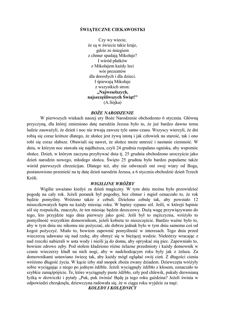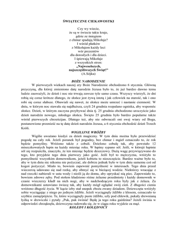 ŚWIĄTECZNE CIEKAWOSTKI Czy wy wiecie, że są w świecie takie kraje, gdzie ze śniegiem z chmur spadają Mikołaje? I wśród płatków z Mikołajem każdy leci wór prezentów dla dorosłych i dla dzieci. I śpiewają Mikołaje z wszystkich stron: „Najweselszych, najszczęśliwszych Świąt!” (A.Sójka) BOŻE NARODZENIE W pierwszych wiekach naszej ery Boże Narodzenie obchodzono 6 stycznia. Główną przyczyną, dla której zmieniono datę narodzin Jezusa było to, że już bardzo dawno temu ludzie zauważyli, że dzień i noc nie trwają zawsze tyle samo czasu. Wszyscy wierzyli, że dni robią się coraz krótsze dlatego, że słońce jest żywą istotą i jak człowiek na starość, tak i ono robi się coraz słabsze. Obawiali się nawet, że słońce może umrzeć i nastanie ciemność. W dniu, w którym noc stawała się najdłuższa, czyli 24 grudnia rozpalano ogniska, aby wspomóc słońce. Dzień, w którym zaczyna przybywać dnia tj. 25 grudnia obchodzono uroczyście jako dzień narodzin nowego, młodego słońca. Święto 25 grudnia było bardzo popularne także wśród pierwszych chrześcijan. Dlatego też, aby nie odwracali oni swej wiary od Boga, postanowiono przenieść na tę datę dzień narodzin Jezusa, a 6 stycznia obchodzić dzień Trzech Króli. WIGILIJNE WRÓŻBY Wigilie uważano kiedyś za dzień magiczny. W tym dniu można było przewidzieć pogodę na cały rok. Jeżeli poranek był pogodny, bez chmur i mgieł oznaczało to, że rok będzie pomyślny. Wróżono także z cebuli. Dzielono cebulę tak, aby powstało 12 miseczkowatych łupin na każdy miesiąc roku. W łupiny sypano sól. Jeśli, w którejś łupinie sól się rozpuściła, znaczyło, że ten miesiąc będzie deszczowy. Dużą wagę przywiązywano do tego, kto przyjdzie tego dnia pierwszy jako gość. Jeśli był to mężczyzna, wróżyło to pomyślność wszystkim domownikom, jeżeli kobieta to nieszczęście. Bardzo ważne było to, aby w tym dniu nic nikomu nie pożyczać, ale dobrze jednak było w tym dniu samemu coś od kogoś pożyczyć. Miało to, bowiem zapewnić pomyślność w interesach. Tego dnia przed wieczerzą udawano się nad rzekę, aby obmyć się w bieżącej wodzie. Niektórzy wracając z nad rzeczki nabierali w usta wody i nieśli ją do domu, aby opryskać nią piec. Zapewniało to, bowiem zdrowe zęby. Pod stołem kładziono różne żelazne przedmioty i każdy domownik w czasie wieczerzy kładł na nich nogi, aby w nadchodzącym roku były jak z żelaza. Za domownikami ustawiano świecę tak, aby każdy mógł oglądać swój cień. Z długości cienia wróżono długość życia. W kącie izby stał snopek zboża zwany dziadem. Dziewczęta wróżyły sobie wyciągając z niego po jednym źdźble. Jeżeli wyciągnęły źdźbło z kłosem, oznaczało to szybkie zamążpójście. Te, które wyciągnęły puste źdźbło, szły pod chlewik, pukały drewnianą łyżką w drzwiczki i pytały „Puk, puk świnia! Będę ja tego roku gaździna? Jeżeli świnia w odpowiedzi chrząknęła, dziewczyna radowała się, że w ciągu roku wyjdzie za mąż. KOLEDY I KOLĘDNICY Dawno temu kolędą nazywano pierwszy dzień nowego roku i obchodzono go 24 grudnia. Hucznie żegnając stary rok i witając nowy, obdarowywano się kolędami, czyli prezentami. Kiedy wprowadzono do Polski chrześcijaństwo wyraz kolęda zrósł się na stałe z Bożym Narodzeniem. W wigilię tego święta - tak jak i dzisiaj – składano sobie życzenia i ofiarowywano podarki, czyli kolędę. Królowie i możni obdarowywali swoich dworzan bardzo hojnie, ale także ubodzy ludzie wręczali sobie drobne upominki. Starano się pamiętać o wszystkich, a zwłaszcza o biednych, którzy podobnie jak nowonarodzony Pan Jezus żyli w wielkim ubóstwie. Od Bożego Narodzenia do Trzech Króli, co wieczór śpiewano kolędy czyli pieśni religijne opowiadające o narodzinach Pana Jezusa, a młodzież, przebrana w różnorodne stroje, chodziła od domu do domu po kolędzie, niosąc szopkę lub gwiazdę. Wśród kolędników był król Herod, jego hetman, żołnierze, śmierć, diabeł, koza, turoń i wiele innych postaci. Kolędnicy przedstawiali krótkie scenki zwane „Herodami”, śpiewali pieśni, składali domownikom życzenia w zamian otrzymywali poczęstunek i drobne pieniądze. WIGILIA W POLSCE Wigilia rozpoczyna Święta Bożego Narodzenia – rodzinne święta pełne pięknych tradycji i podniosłego nastroju. Wieczór wigilijny jest najbardziej uroczystym i najbardziej wzruszającym wieczorem roku. Od niepamiętnych czasów kolacja wigilijna składała się z potraw postnych, zasiadała do niej parzysta liczba osób. Wieczerza wigilijna rozpoczynała się zawsze wspólną modlitwą i do końca miała charakter uroczysty i poważny. Najważniejszym momentem wigilijnej wieczerzy jest dzielenie się opłatkiem. Jedną z najmłodszych tradycji wigilijnych jest strojenie choinki. Choinka… najczęściej zielony, pachnący świerk, czasem kłująca jodła… zawsze nieomylny znak nadchodzących świąt, uczestniczka Wigilii, świadek najgorętszych życzeń, strażniczka ukrytych pod nią prezentów, zasłuchana w śpiew kolęd… BOŻE NARODZENIE W INNYCH KRAJACH Gwiazdka to czas radości, prezentów życzeń. Cieszymy się już na samą myśl o tych grudniowych dniach: W czeskich domach kolację wigilijną kończy specjalny deser. Gospodyni podaje 12 rodzajów ciasteczek, oznaczających 12 miesięcy. Gospodarz zaś rozcina na pół jabłko. Z układu jego pestek rodzina wróży sobie przyszłość… USA ogarnia szał pisania kartek z życzeniami. Każdy Amerykanin wysyła ich kilkadziesiąt, ostatnio za pomocą poczty elektronicznej; W Wenezueli podczas Świąt Bożego Narodzenia panuje gorące lato. Ludzie nie dzielą się tam opłatkiem tak jak u nas, lecz… kiścią winogron. Każdy odrywa sobie z tej kiści 12 gron i kolejno je zjada, wypowiadając życzenia na nadchodzące miesiące Nowego Roku; Szwedzi wie