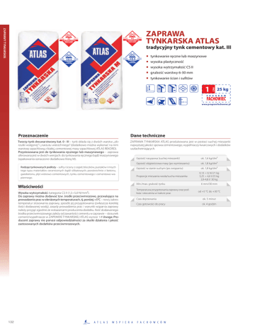 Zaprawy tynkarskie ZAPRAWA TYNKARSKA ATLAS tradycyjny tynk cementowy kat. III tynkowanie ręczne lub maszynowe wysoka plastyczność wysoka wytrzymałość CS II grubość warstwy 6-30 mm tynkowanie ścian i sufitów 1 Przeznaczenie Dane techniczne Tworzy tynk dwuwarstwowy kat. 0 - III – tynk składa się z dwóch warstw: „obrzutki wstępnej” i „narzutu wierzchniego” (dodatkowo można wykonać na nim warstwę szpachlową z białej, cementowej masy szpachlowej ATLAS REKORD). Przystosowana jest do tynkowania ręcznego lub maszynowego – zaprawa oferowana jest w dwóch wersjach: do tynkowania ręcznego bądź maszynowego (opakowania oznaczone dodatkowo literą M). ZAPRAWA TYNKARSKA ATLAS produkowana jest w postaci suchej mieszanki najwyższej jakości spoiwa cementowego, wypełniaczy kwarcowych i dodatków uszlachetniających. Rodzaje tynkowanych podłoży – sufity i ściany z cegieł, bloczków, pustaków i innych tego typu materiałów ceramicznych bądź silikatowych; powierzchnie z betonu, gazobetonu, płyt wiórowo-cementowych, tynku cementowego i cementowo-wapiennego. Właściwości Wysoka wytrzymałość: kategoria CS II (1,5÷5,0 N/mm²). Do zaprawy można dodawać tzw. środki przeciwmrozowe, pozwalające na prowadzenie prac w obniżonych temperaturach, tj. poniżej +5°C – nowy zakres temperatur stosowania zaprawy, sposób jej przygotowania (zwłaszcza korektę ilości dodawanej wody), zasady prowadzenia prac i warunki wiązania zaprawy należy przyjąć zgodnie ze wskazaniami producenta dodatku. Ilość dodawanego środka przeciwmrozowego zależy od zawartości cementu w zaprawie – stosunek cement/wypełniacze w ZAPRAWIE TYNKARSKIEJ ATLAS wynosi 1:4 Uwaga: Producent zaprawy nie ponosi odpowiedzialności za skutki działania i jakość zastosowanych dodatków przeciwmrozowych. 132 25 kg Gęstość nasypowa (suchej mieszanki) ok. 1,6 kg/dm³ Gęstość objętościowa masy (po wymieszaniu) ok. 1,8 kg/dm³ Gęstość w stanie suchym (po związaniu) ok. 1,8 kg/dm³ Proporcje mieszania woda/sucha mieszanka Min./max. grubość tynku Temperatura przygotowania zaprawy oraz podłoża i otoczenia w trakcie prac 0,13 ÷ 0,16 l/1 kg 3,25 ÷ 4,0 l/25 kg 3,9-4,8 l/ 30 kg 6 mm/30 mm od +5 °C do +30 °C Czas dojrzewania ok. 5 minut Czas gotowości do pracy ok. 4 godzin wymagania techniczne pielęgnacja 05 PN-EN 998-1 Zaprawa tynkarska o określonych właściwościach, wytwarzana w zakładzie, ogólnego przeznaczenia (GP), do stosowania wewnątrz i na zewnątrz Klasa reakcja na ogień A1 Przyczepność 0,5 N/mm² - FP:B Wytrzymałość na ściskanie Kategoria CS II (1,5÷5,0 N/mm²) Współczynnik przepuszczalności pary wodnej Współczynnik przewodzenia ciepła (średnia wartość tabelaryczna P=50%) Gęstość brutto w stanie suchym μ 15 / 35 0,83 W / mK (λ10, dry) ≤ 1800 kg/m³ Trwałość – ubytek masy po cyklach zamrażania i rozmrażania Trwałość – kategoria wytrzymałości na ściskanie po cyklach zamrażania i rozmrażania Zawartość substancji niebezpiecznych ≤ 3% CS II (1,5 ÷ 5,0 N/mm²) Patrz Karta Charakterystyki Mieszaniny Niebezpiecznej (MSDS) Wyrób posiada Świadectwo z zakresu higieny radiacyjnej. tynkowanie przygotowanie podłoża Podłoże powinno być suche, stabilne, równe i nośne, tzn. odpowiednio mocne, oczyszczone z warstw mogących osłabić przyczepność zaprawy, zwłaszcza z kurzu, brudu, wapna, olejów, tłuszczów, wosku, resztek środków antyadhezyjnych i farb. Słabo związane fragmenty powierzchni należy odkuć, zaś elementy luźne lub osypliwe usunąć szczotką stalową. Krawędzie styku płyt wiórowo-cementowych przed tynkowaniem należy wzmocnić pasami z nierdzewnej siatki metalowej. Narożniki oraz krawędzie przy otworach okiennych i drzwiowych należy zabezpieczyć poprzez osadzenie ocynkowanych profili stalowych. Jeżeli istnieje potrzeba redukcji chłonności podłoża, zaleca się stosowanie emulsji ATLAS UNI-GRUNT. przygotowanie zaprawy Zaprawy tynkarskie ZAPRAWA TYNKARSKA ATLAS spełnia wymagania PN-EN 998-1. Deklaracja Zgodności WE nr 006-1 oraz 006-2 (wersja do nakładania mechanicznego). W czasie wysychania należy zapewnić dobrą wentylację pomieszczeń. Tynki zewnętrzne chronić przed zbyt szybkim wysychaniem, np. zraszając je wodą. Malowanie Otynkowane podłoża można malować dowolnymi farbami elewacyjnymi (np. ATLAS ARKOL S, ATLAS ARKOL N, ATLAS FASTEL-NOVA i ATLAS ARKOL E). Rozpoczęcie prac malarskich możliwe jest po upływie 2÷6 tygodni od zakończenia tynkowania (zależnie od rodzaju i koloru farby). Jedynie malowanie farbą silikatową ATLAS ARKOL S można rozpocząć po wyschnięciu tynku, nie wcześniej jednak niż po upływie 48 godzin. Zużycie Z jednego opakowania 25 kg możemy wykonać ok. 1,3-1,4 m² tynku grubości 10 mm. ważne informacje dodatkowe • Proporcje dodawanej wody należy skorygować doświadczalnie, kierując się pożądaną konsystencją zaprawy, rodzajem podłoża i warunkami atmosferycznymi. Stosowanie niewłaściwej ilości wody do przygotowania masy prowadzi do obniżenia parametrów wytrzymałościowych tynku. • Narzędzia należy czyścić czystą wodą, bezpośrednio po użyciu. Trudne do usunięcia resztki związanej zaprawy zmywa się środkiem ATLAS SZOP. • Preparat drażniący – zawiera cement. Działa drażniąco na drogi oddechowe i skórę. Ryzyko poważnego uszkodzenia oczu. Może powodować uczulenie w kontakcie ze skórą. Ze względu na swoją postać – pył – preparat może mechanicznie podrażniać oczy i układ oddechowy. Chronić przed dziećmi. Nie wdychać pyłu. Zanieczyszczone oczy przemyć natychmiast dużą ilością wody i zasięgnąć porady lekarza. Nosić odpowiednią odzież ochronną, odpowiednie rękawice ochronne i okulary lub ochronę twarzy. W razie połknięcia niezwłocznie zasięgnij porady lekarza – pokaż opakowanie lub etykietę. Postępować zgodnie z Kartą Charakterystyki. • Zaprawę należy przewozić i pr
