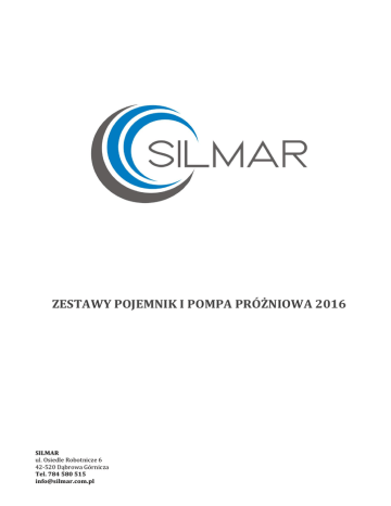 ZESTAWY POJEMNIK I POMPA PRÓŻNIOWA 2016 SILMAR ul. Osiedle Robotnicze 6 42-520 Dąbrowa Górnicza Tel. 784 580 515 [email protected] 2 POJEMNIKI I POMPY PRÓŻNIOWE: Uzupełnieniem oferty płynnych tworzyw sztucznych są zestawy pojemnik + pompa próżniowa. Oferowane zestawy umożliwiają odpowietrzanie płynnych materiałów i aplikację bez pęcherzy powietrza. Zastosowanie odpowietrzania próżniowego w prawidłowy sposób umożliwia otrzymanie idealnych odlewów, co z kolei podnosi parametry techniczne i żywotność formy/odlewu. Odlewanie materiałów płynnych bez zastosowania odpowietrzania próżniowego może powodować powstawanie pęcherzy powietrza, które znacząco obniżają parametry techniczne produktu. Ewentualne zapowietrzenia powstałe na powierzchni wzoru w miejscu łączenia z wylewanym materiałem są praktycznie nie do usunięcia i będą powielane przy każdym odlewie. W CELU UZYSKANIA IDEALNEGO ODLEWU O PARAMETRACH TECHNICZNYCH OKREŚLONYCH W FISZCE TECHNICZNEJ NIEZBĘDNE JEST ODPOWIETRZANIE PRÓŻNIOWE. PROCES ODPOWIETRZANIA PRÓŻNIOWEGO UMOŻLIWIA W WIĘKSZOŚCI PRZYPADKÓW MIESZANIE MECHANICZNE. SILMAR ul. Osiedle Robotnicze 6 42-520 Dąbrowa Górnicza Tel. 784 580 515 3 KOMORY PRÓŻNIOWE: Komora próżniowa 4,2l ze stali nierdzewnej: Komora próżniowa 4,2l. znajduje zastosowanie w procesie odgazowywania produktów formierskich takich jak: silikon, żywica, gips. Zbiornik komory wykonany jest ze stali nierdzewnej, jego pojemność to 4.2l, a wymiary wewnętrzne to: średnica 16cm na 21cm wysokości. Wieko komory zrobione jest z grubego poliwęglanu. Zbiornik zaopatrzony jest w kładzioną na rant uszczelkę silikonową. Zastosowana uszczelka jest trwała i wykazuje niską podatność na odkształcenia mechaniczne. Doskonała transparentność wieka pozwala na obserwację procesu odgazowywania. Dwa zawory kulowe pozwalają dowolnie sterować przebiegiem procesu odgazowywania, a zamontowany glicerynowy wakuometr wskazuje aktualną wartość podciśnienia w komorze. Komora wyposażona jest w filtr powietrza dolotowego, który skutecznie uniemożliwia dostanie się zanieczyszczeń do odgazowywanego materiału. Komora przyłączana jest do pompy przy pomocy króćca, na który założony jest wzmocniony wąż o średnicy wewnętrznej 8mm i długości 1.5m. Całość wykonana jest z materiałów najwyższej jakość oraz markowego szczeliwa do gwintów. SILMAR ul. Osiedle Robotnicze 6 42-520 Dąbrowa Górnicza Tel. 784 580 515 4 Powyższy komora przy zastosowaniu odpowiedniej pompy pozwala na osiągnięcie próżni na poziomie -0.98bar (-29.0inHg). A jego doskonała szczelność gwarantuje utrzymywanie się próżni co najmniej przez kolejne kilkadziesiąt godzin po odłączeniu pompy. Wszystkie nasze systemy próżniowe, przed wysyłką do klienta, są sprawdzane i weryfikowane. Zawartość zestawu: zbiornik ze stali nierdzewnej 160mm x 210mm w 100% silikonowa uszczelka o twardości 60°ShA i odporności temperaturowe 190°C szczelna wyspa zaworowa z wakuometrem glicerynowym oraz filtrem powietrza wzmocniony wąż pneumatyczny ze złączką umożliwiającą połączenia do pompy próżniowej SILMAR ul. Osiedle Robotnicze 6 42-520 Dąbrowa Górnicza Tel. 784 580 515 5 Komora próżniowa 12,5l aluminiowa: Komora próżniowa 12,5l. znajduje zastosowanie w procesie odgazowywania produktów formierskich takich jak: silikon, żywica, gips. Zbiornik komory wykonany jest z aluminium, jego pojemność to 12.5l, a wymiary wewnętrzne to: średnica 25cm na 23cm wysokości. Wieko komory zrobione jest z grubego poliwęglanu. Zbiornik zaopatrzony jest w wulkanizowaną uszczelkę silikonową. Zastosowana uszczelka jest trwała i wykazuje niską podatność na odkształcenia mechaniczne. Doskonała transparentność wieka pozwala na obserwację procesu odgazowywania. Dwa zawory kulowe pozwalają dowolnie sterować przebiegiem procesu odgazowywania, a zamontowany glicerynowy wakuometr wskazuje aktualną wartość podciśnienia w komorze. Komora wyposażona jest w filtr powietrza dolotowego, który skutecznie uniemożliwia dostanie się zanieczyszczeń do odgazowywanego materiału. Komora przyłączana jest do pompy przy pomocy króćca, na który założony jest wzmocniony wąż o średnicy wewnętrznej 8mm i długości 1.5m. Całość wykonana jest z materiałów najwyższej jakość oraz markowego szczeliwa do gwintów. Powyższy komora przy zastosowaniu odpowiedniej pompy pozwala na osiągnięcie próżni na poziomie -0.98bar (-29.0inHg). A jego doskonała szczelność gwarantuje utrzymywanie się próżni co najmniej przez kolejne kilkadziesiąt godzin po odłączeniu pompy. Wszystkie nasze systemy próżniowe, przed wysyłką do klienta, są sprawdzane i weryfikowane. SILMAR ul. Osiedle Robotnicze 6 42-520 Dąbrowa Górnicza Tel. 784 580 515 6 Zawartość zestawu: zbiornik aluminiowy 250mm x 230mm przemysłowa, wulkanizowana, w 100% silikonowa uszczelka o twardości 60°ShA i odporności temperaturowe 190°C szczelna wyspa zaworowa z wakuometrem glicerynowym oraz filtrem powietrza wzmocniony wąż pneumatyczny ze złączką umożliwiającą połączenia do pompy próżniowej SILMAR ul. Osiedle Robotnicze 6 42-520 Dąbrowa Górnicza Tel. 784 580 515 7 Komora próżniowa 15,5l aluminiowa: Komora próżniowa 15,5l. znajduje zastosowanie w procesie odgazowywania produktów formierskich takich jak: silikon, żywica, gips. Zbiornik komory wykonany jest z aluminium, jego pojemność to 15.5l, a wymiary wewnętrzne to: średnica 28cm na 25cm wysokości. Wieko komory zrobione jest z grubego poliwęglanu. Zbiornik zaopatrzony jest w wulkanizowaną uszczelkę silikonową. Zastosowana uszczelka jest trwała i wykazuje niską podatność na odkształcenia mechaniczne. Doskonała transparentność wieka pozwala na obserwację procesu odgazowywania. Dwa zawory kulowe pozwalają dowolnie sterować przebiegiem procesu odgazowywania, a zamontowany glicerynowy wakuometr wskazuje aktualną 