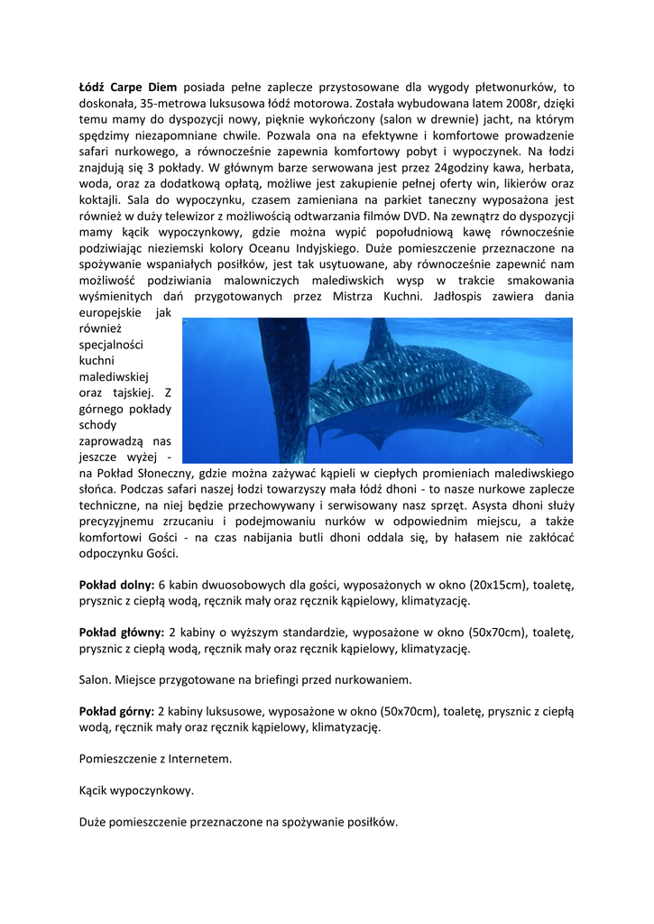 Łódź Carpe Diem posiada pełne zaplecze przystosowane dla wygody płetwonurków, to doskonała, 35-metrowa luksusowa łódź motorowa. Została wybudowana latem 2008r, dzięki temu mamy do dyspozycji nowy, pięknie wykończony (salon w drewnie) jacht, na którym spędzimy niezapomniane chwile. Pozwala ona na efektywne i komfortowe prowadzenie safari nurkowego, a równocześnie zapewnia komfortowy pobyt i wypoczynek. Na łodzi znajdują się 3 pokłady. W głównym barze serwowana jest przez 24godziny kawa, herbata, woda, oraz za dodatkową opłatą, możliwe jest zakupienie pełnej oferty win, likierów oraz koktajli. Sala do wypoczynku, czasem zamieniana na parkiet taneczny wyposażona jest również w duży telewizor z możliwością odtwarzania filmów DVD. Na zewnątrz do dyspozycji mamy kącik wypoczynkowy, gdzie można wypić popołudniową kawę równocześnie podziwiając nieziemski kolory Oceanu Indyjskiego. Duże pomieszczenie przeznaczone na spożywanie wspaniałych posiłków, jest tak usytuowane, aby równocześnie zapewnić nam możliwość podziwiania malowniczych malediwskich wysp w trakcie smakowania wyśmienitych dań przygotowanych przez Mistrza Kuchni. Jadłospis zawiera dania europejskie jak również specjalności kuchni malediwskiej oraz tajskiej. Z górnego pokłady schody zaprowadzą nas jeszcze wyżej na Pokład Słoneczny, gdzie można zażywać kąpieli w ciepłych promieniach malediwskiego słońca. Podczas safari naszej łodzi towarzyszy mała łódź dhoni - to nasze nurkowe zaplecze techniczne, na niej będzie przechowywany i serwisowany nasz sprzęt. Asysta dhoni służy precyzyjnemu zrzucaniu i podejmowaniu nurków w odpowiednim miejscu, a także komfortowi Gości - na czas nabijania butli dhoni oddala się, by hałasem nie zakłócać odpoczynku Gości. Pokład dolny: 6 kabin dwuosobowych dla gości, wyposażonych w okno (20x15cm), toaletę, prysznic z ciepłą wodą, ręcznik mały oraz ręcznik kąpielowy, klimatyzację. Pokład główny: 2 kabiny o wyższym standardzie, wyposażone w okno (50x70cm), toaletę, prysznic z ciepłą wodą, ręcznik mały oraz ręcznik kąpielowy, klimatyzację. Salon. Miejsce przygotowane na briefingi przed nurkowaniem. Pokład górny: 2 kabiny luksusowe, wyposażone w okno (50x70cm), toaletę, prysznic z ciepłą wodą, ręcznik mały oraz ręcznik kąpielowy, klimatyzację. Pomieszczenie z Internetem. Kącik wypoczynkowy. Duże pomieszczenie przeznaczone na spożywanie posiłków. Harmonogram posiłków: 6.30 - kawa, herbata, ciastka 8.00 - 10.00 śniadanie 13.00 - 14.30 obiad 19.00 - 21.00 kolacja Dodatkowo dwa razy dziennie przekąski z kuchni tajskiej oraz malediwskiej. Dane techniczne łodzi: Rok budowy: 2008 Port rejestracji: Male, republika Malediwów Długość: 35 m Szerokość: 10 m Maksymalna liczba gości: 20 Liczba kabin: 10 (1 apartament, 1 deluxe, 2 wysokiego standardu, 2 wyższego standardu, 4 standardowe) Liczba łazienek: 13 Klimatyzacja: w każdym pokoju i w każdym miejscu na łodzi Liczba załogi: 10 + 3 na łódce dhoni Silnik: Doosan Daewood Diesel Engine 650 Hp Pojemność silnika: 7,000 litrów Nawigacja: GPS, Sounder Komunikacja: Radio VHS, internet, GSM Generatory: 2xDoosan Daewood Marine Soundproof, 50 Hz, 380V, 45 KW Prąd elektryczny: 220/50 Hz, 24h na dobę Zbiornik wody: 5000 litrów Stacja odsalania: 16000 litrów/dziennie (2xOsmotic Treatment Plants-Wasco Atlantic 400) Pralnia: tak Łódź do nurkowania dhoni: tak Nitrox na pokładzie: tak Kompresory HP: 2XMCH 16 Coltri Sub (53 L/min, 18CFM), Bauer M320 Nitrox Gen: Coltri Sub LP280 Rotary Silent, Nuvair Membrane Tlen FA na pokładzie: tak, 10,500 litrów Wypożyczalnia sprzętu nurkowego: tak, wraz z aparatem i kamerą Szkoła nurkowania: tak Inne aktywności: Windsurfing, Jet Ski, O-ring, lekcje salsy Wirtualne zwiedzanie łodzi: https://www.carpediemmaldives.com/virtualtour/carpediem/ https://www.carpediemmaldives.com/virtualtour/carpediem/?tour=dining https://www.carpediemmaldives.com/virtualtour/carpediem/?tour=sundeck Kabiny: https://www.carpediemmaldives.com/virtualtour/carpediem/?tour=cabin_sun Film - co możemy zobaczyć pod wodą: https://vimeo.com/65621278 Film - Malediwy: https://vimeo.com/142464215 DWIE TRASY SAFARI: 1. North Male - South Ari - Meemu - Vaavu - South Male 2. North Male - Ari - Vaavu - South Male Ari Atoll - ma do zaoferowania różnorodne nurkowiska, na których spotkanie większych gatunków ryb jest niemal pewne. - Maaya Thila: należy do najlepszych nurkowisk na całych Malediwach.W płytszych częściach thili znajdziemy mureny, ślimaki nagoskrzelne, skrzydlice, czy ośmiornice. Natomiast najbardziej interesująca jest głębsza część ściany, gdzie znajdują się jaskinie i przewieszenia niemal całkowicie pokryte pięknymi, zdrowymi, kolorowymi gąbkami i koralowcami. Wokół thili znajdziemy ławice ryb z gatunku: batfish, unicornfish, soldierfish czy triggerfish. Możliwe, że pomiędzy nimi znajdzie się również kilka orleni, czy rekinów rafowych. Naprawdę wyjątkowe miejsce! - Fish Head (zwane również Shark Point lub Mushimasmingili Thila): zaliczana do pierwszej 10 najlepszych nurkowisk na Malediwach. Jest to niewielka thila, a jej ściany są dość gęsto usiane niewielkimi jaskiniami i przewieszeniami, pięknie pokryte gorgoniami, koralami i gąbkami. Pośród nich znajdziemy ogromne ławice snapperów. Jednak prawdopodobnie najciekawszym wydarzeniem będzie obserwowanie licznie tu występujących szarych rekinów rafowych. - Broken Rock: to kolejna „zatopiona rafa”. Pośrodku niej znajduje się ogromne pęknięcie, przypominające kanion, skąd też pochodzi nazwa nurkowiska. To właśnie możliwość przepłynięcia przez ten podwodny kanion przyciąga tu rzesze nurków. Znajdziemy tu cheliny napoleońskie, snappery i barakudy a w sezonie od maja do listopada częstym gościem jest również rekin wielorybi. North Male Atoll - jeden z najpopularniejszych wśród nurków, poło