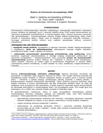 Wybory do Parlamentu Europejskiego 2009 Apel o spójną europejską politykę na rzecz walki z głodem i zrównoważonego rolnictwa w krajach Południa STRESZCZENIE Promowanie zrównoważonego rolnictwa chłopskiego, szanującego środowisko naturalne, prawa rolników do godnego życia z owoców własnej pracy oraz prawa konsumentów do zdrowych produktów żywnościowych w wystarczającej ilości, stanowi kluczowe wyzwanie dla sprawiedliwego i zrównoważonego rozwoju krajów półkuli południowej, które może pomóc w zwalczaniu głodu i biedy. Jest to związane z uznaniem specyfiki rolnictwa i wymaga wdrożenia polityk rolnych oraz nadania specjalnego statusu umowom handlowym. Domagamy się, aby Unia Europejska: - uspójniła swoje polityki, szczególnie w zakresie rolnictwa, handlu międzynarodowego i współpracy, wraz ze zobowiązaniami dotyczącymi rozwoju krajów Południa, zmniejszenia biedy i walki z głodem na świecie. - ustanowiła suwerenność żywnościową priorytetową osią polityczną, która powinna znajdować odzwierciedlenie w różnego rodzaju działaniach politycznych na poziomie europejskim i międzynarodowym oraz przyznała prawo do suwerenności żywnościowej zarówno krajom Północy jak i Południa w ramach umów handlowych, które zawiera. Powinno to zostać ujęte w konkretnych działaniach w ramach WPR, zewnętrznej polityki handlowej, a także działań na rzecz współpracy międzynarodowej i rozwoju. WSTĘP: Obrona zrównoważonego rolnictwa chłopskiego stanowi kluczowe wyzwanie dla przyszłości 6 miliardów ludzi żyjących obecnie na Ziemi. Ten model rolnictwa pozwala jak największej liczbie rolników w różnych zakątkach świata na godne życie z owoców swojej pracy – rolnictwo z ludzką twarzą, produkujące zdrową żywność o dobrej jakości, z poszanowaniem zasobów środowiska naturalnego. Takie rolnictwo powinno budować więzi między rolnikami a innymi mieszkańcami, tak aby środowisko wiejskie ożyło, by stało się miejscem życia przyjaznym dla wszystkich, a także powinno szanować prawa konsumentów do zdrowego pożywienia w wystarczającej ilości i po przystępnej cenie. Ten model jest tym ważniejszy, że w 2050 roku ludność świata wyniesie 9 miliardów osób. W gospodarstwach rodzinnych, które w wielu przypadkach reprezentują właśnie zrównoważone rolnictwo chłopskie, pracuje 2,8 miliardów ludzi, czyli 45% światowej populacji.1 Takie gospodarstwa posiadają wiele atutów2: o optymalizują wykorzystanie rodzinnej siły roboczej i pozwalają ograniczyć ucieczkę ludności wiejskiej do miasta, a tym samym anarchiczny rozwój skupisk miejskich; o często uzyskują znaczną wydajność z hektara; o nakierowane na produkcję artykułów rolnych i żywności, bardziej skutecznie przyczyniają się do walki z głodem i biedą, gdyż podział produkowanych dóbr jest bardziej sprawiedliwy; 1 Dane CIRAD (Centrum współpracy międzynarodowej w zakresie rolnictwa i ekonomii na rzecz rozwoju): „Rolnictwo rodzinne, świat, który należy zbudować”. Wg FAO z 854 mln ofiar głodu 80% stanowią chłopi i ich rodziny. 2 Koordynacja Południe: « Jakich gospodarstw chłopskich bronić i dlaczego », Paryż, grudzień 2007 (http://www.coordinationsud.org/spip.php?article5849). Jako przykład można podać przypadek Brazylii. 1 o ich działalność jest często bardziej zdywersyfikowana (uprawa wielu gatunków roślin plus hodowla), najczęściej prowadzona z większym poszanowaniem środowiska naturalnego niż duże gospodarstwa oparte na monokulturze. A jednak presja na coraz większą liberalizację światowej gospodarki zagraża takiemu rolnictwu. Zarówno na Północy jak i na Południu pogłębiająca się liberalizacja rynków rolnych oraz brak inwestycji w tym sektorze sprawiają, że coraz więcej małych, zrównoważonych gospodarstw rolnych znika (600 tysięcy rocznie). Zmusza to wiele milionów chłopów do migracji do miast i innych krajów, które nie są w stanie zapewnić wszystkim godnej pracy. Ponadto, brak światowych regulacji rynków rolnych najbardziej naraża takie gospodarstwa na spekulacje. Taka sytuacja nie sprzyja ani rolnikom, ani konsumentom. Deregulacja jest w dużej mierze odpowiedzialna za obecny kryzys. Ogromny wzrost cen niektórych produktów rolnych (zbóż, produktów mlecznych, itp.), wzmożona przez działania spekulacyjne, uderza mocno w kraje rozwijające się, które, zrezygnowawszy w ostatnich dziesięcioleciach z rolnictwa, w zbyt dużym stopniu zależne są od importu. Zamieszki na tle głodowym przetoczyły się już przez wiele miast w Kamerunie, Senegalu, czy na Haiti. Z kolei kraje, które wspierały swoje rolnictwo i produkują podstawowe produkty żywnościowe, są na ogół mniej dotknięte kryzysem. Właśnie dlatego, w obliczu powagi sytuacji, Organizacja Narodów Zjednoczonych do spraw wyżywienia i rolnictwa (FAO) ustanowiła „szybkie pobudzenie wzrostu produkcji żywności w dotkniętych krajach”3 swoim priorytetem. Takie stanowisko łączy się z tym, którego bronią od lat organizacje chłopskie głównie w Afryce. Aby osiągnąć ten cel, kraje Południa powinny, podobnie jak Unia Europejska, móc wzmocnić integrację regionalną, chronić swoje rolnictwo, wprowadzić politykę rolną, która pozwalałaby im dążyć do niezależności żywnościowej, a także stosować zasadę preferencji regionalnej. Takie działania polityczne powinny mieć na uwadze szczególnie rolników prowadzących rodzinne gospodarstwa rolne i ich rodziny, gdyż są oni pierwszymi ofiarami głodu i biedy. Na początku lat sześćdziesiątych ubiegłego stulecia, aby rozwiązać problem deficytu żywności, kraje europejskie zdecydowały się wprowadzić w życie wspólną politykę rolną opartą na dotowaniu europejskiej produkcji rolnej i na zabezpieczeniach przeciwko importowi z krajów trzecich. Pozwoliło to Europie osiągnąć samowystarczalność żywnościową już w latach