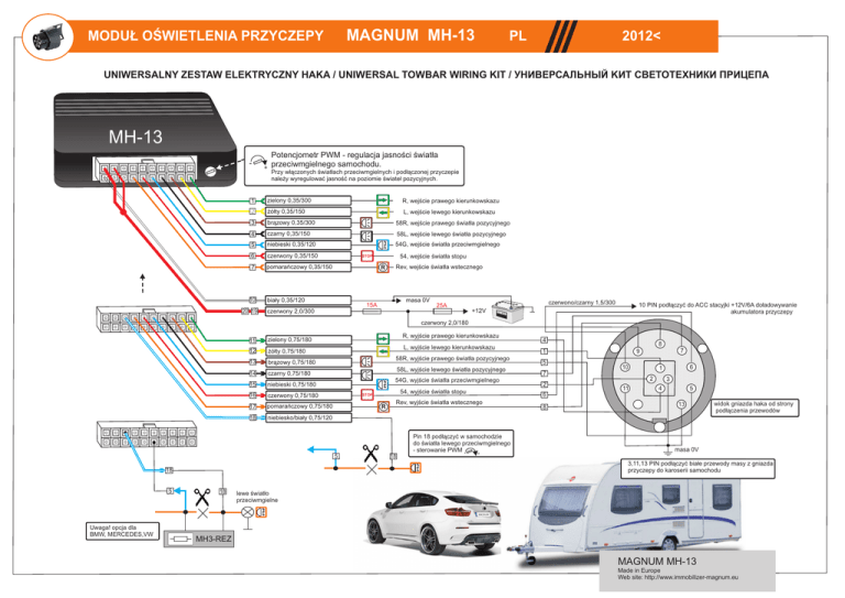 MAGNUM MH-13 MODU£ OŒWIETLENIA PRZYCZEPY PL 2012< UNIWERSALNY ZESTAW ELEKTRYCZNY HAKA / UNIWERSAL TOWBAR WIRING KIT / ÓÍÈÂÅÐÑÀËÜÍÛÉ KÈT ÑÂÅÒÎÒÅÕÍÈÊÈ ÏÐÈÖÅÏÀ MH-13 - + Potencjometr PWM - regulacja jasnoœci œwiat³a przeciwmgielnego samochodu. Przy w³¹czonych œwiat³ach przeciwmgielnych i pod³¹czonej przyczepie nale¿y wyregulowaæ jasnoœæ na poziomie œwiate³ pozycyjnych. 1 zielony 0,35/300 2 ¿ó³ty 0,35/150 3 br¹zowy 0,35/300 R, wejœcie prawego kierunkowskazu L, wejœcie lewego kierunkowskazu 58R, wejœcie prawego œwiat³a pozycyjnego 4 czarny 0,35/150 58L, wejœcie lewego œwiat³a pozycyjnego 5 niebieski 0,35/120 54G, wejœcie œwiat³a przeciwmgielnego 6 czerwony 0,35/150 7 pomarañczowy 0,35/150 10 20 19 54, wejœcie œwiat³a stopu STOP R bia³y 0,35/120 Rev, wejœcie œwiat³a wstecznego masa 0V 15A czerwony 2,0/300 25A czerwono/czarny 1,5/300 10 PIN pod³¹czyæ do ACC stacyjki +12V/6A do³adowywanie akumulatora przyczepy +12V czerwony 2,0/180 11 zielony 0,75/180 12 ¿ó³ty 0,75/180 13 br¹zowy 0,75/180 14 czarny 0,75/180 15 niebieski 0,75/180 16 czerwony 0,75/180 17 pomarañczowy 0,75/180 18 niebiesko/bia³y 0,75/120 R, wyjœcie prawego kierunkowskazu L, wyjœcie lewego kierunkowskazu 58R, wyjœcie prawego œwiat³a pozycyjnego 58L, wyjœcie lewego œwiat³a pozycyjnego 54G, wyjœcie œwiat³a przeciwmgielnego R 5 Uwaga! opcja dla BMW, MERCEDES,VW Rev, wyjœcie œwiat³a wstecznego 18 Pin 18 pod³¹czyæ w samochodzie do œwiat³a lewego przeciwmgielnego - sterowanie PWM + 8 5 10 7 2 7 9 11 6 1 2 3 5 4 6 8 13 widok gniazda haka od strony pod³¹czenia przewodów masa 0V 3,11,13 PIN pod³¹czyæ bia³e przewody masy z gniazda przyczepy do karoserii samochodu 18 5 54, wyjœcie œwiat³a stopu STOP 4 1 18 lewe œwiat³o przeciwmgielne MH3-REZ MAGNUM MH-13 Made in Europe Web site: http://www.immobilizer-magnum.eu MAGNUM MH-13 MODU£ OŒWIETLENIA PRZYCZEPY 1.Schemat pod³¹czenia dla jednow³óknowej ¿arówki realizuj¹cej funkcje œwiat³a pozycyjnego i przeciwmgielnego 18 3 R 18 prawe œwiat³o pozycyjne i przeciwmgielne w samochodzie 5 4 L lewe œwiat³o pozycyjne i przeciwmgielne w samochodzie 2.Schemat pod³¹czenia dla jednow³óknowej ¿arówki realizuj¹cej funkcje œwiat³a pozycyjnego i stopu prawe œwiat³o pozycyjne i stop w samochodzie STOP 3 R 4 6 STOP L 18 lewe œwiat³o pozycyjne i stop w samochodzie 5 L lewe œwiat³o przeciwmgielne w samochodzie 3.Schemat pod³¹czenia dla ¿arówki realizuj¹cej funkcje œwiat³a przeciwmgielnego z obci¹¿eniem rezystancyjnym w samochodach BMW, MERCEDES, VW 18 prawe œwiat³o przeciwmgielne w samochodzie R 18 MH3-REZ 5 L Uwaga! opcja dla BMW, MERCEDES,VW lewe œwiat³o przeciwmgielne w samochodzie MH3-REZ PL 2012< Opis modu³ów oœwietlenia przyczepy serii MH-7, MH-7s, MP-13, MH-13s na rynki EU, UK, RU Modu³ realizujê wszystkie funkcje sterowania oœwietleniem przyczep. W wersjach S dodatkowo posiada funkcje alarmow¹ ALARM INFO ochrony przyczepy dla systemów alarmowych oraz funkcje steruj¹c¹ PARK SENSOR czujnikami parkowania. Modu³ jest zaprojektowany do wspó³pracy z ka¿dym typem instalacji nowoczesnych samochodów do wspó³pracy z oœwietleniem samochodu zarówno jedno-w³óknowym, dwu-w³óknowym oraz lampami LED. Modu³ pod³¹czamy do tylnego oœwietlenia samochodu bez obawy wykrycia b³êdu obci¹¿enia dla modu³ów testuj¹cych stan oœwietlenia samochodu (test przeci¹¿enia obwodu). Funkcja - TEST POD£¥CZENIA PRZYCZEPY Urz¹dzenie wykrywa pod³¹czenie przyczepy i po tym pod³¹czeniu przeprowadza test wszystkich ¿arówek zapalaj¹c pojedynczo ka¿d¹ ¿arówkê w przyczepie. Funkcja - alarmowa ALARM INFO W funkcji tej mamy zapewnion¹ ochronê przyczepy w przypadku próby jej kradzie¿y. Urz¹dzenie posiada wyjœcie do sterowania systemem alarmowym samochodu lub monitoringu GPS/GSM. Wyjœcie ALARM INFO nale¿y pod³¹czyæ na przyk³ad do w³¹cznika oœwietlenia drzwi lub baga¿nika. Po od³¹czeniu przyczepy jest wystawiany impuls 1 sekundowy masy symuluj¹cy zadzia³anie w³¹cznika co spowoduje zadzia³anie systemu alarmowego. Funkcja - PARK SENSOR Funkcja ta zapewnia nam wspó³pracê z zainstalowanym ultradŸwiêkowym czujnikiem parkowania. Po pod³¹czeniu przyczepa staje siê sta³¹ przeszkod¹, wówczas mamy mo¿liwoœæ blokowania pracy czujników parkowania przy pod³¹czonej przyczepie. Modu³ ma wyjœcie park sensor, na którym jest za³¹czona „MASA” gdy nie ma pod³¹czonej przyczepy. W³¹czenie wstecznego biegu wy³¹cza nam na wyjœciu park sensor „MASÊ”. Do wyjœcia park sensor nale¿y pod³¹czyæ biegun ujemny zasilania centrali czujnika parkowania. Funkcja - STEROWANIE LEWYM ŒWIAT£EM POZYCYJNYM Funkcja ta jest przeznaczona dla jedno-w³óknowych ¿arówek realizuj¹cych jednoczeœnie funkcje pozycji i przeciwmgielnego œwiat³a lub pozycji i stopu ( patrz rys 1 i 2 ). Funkcja - STEROWANIE LEWYM SWIATLEM PRZECIWMGIELNYM Funkcja ta zapobiega zjawisku oœlepiania kierowcy, œwiat³em przeciwmgielnym samochodu odbijanym od przedniej powierzchni przyczepy. Zadanie to realizuje wyjœcie PWM umo¿liwiaj¹ce regulacjê jego jasnoœci œwiat³a przeciwmgielnego podczas w³¹czenia œwiate³ przeciwmgielnych samochodu i jednoczesnym sterowaniu œwiat³em w przyczepie. Regulacjê intensywnoœci œwiecenia œwiat³a w samochodzie przeprowadza siê potencjometrem, dobieraj¹c jego ustawienie tak, aby modu³ œwiate³ samochodu nie wyœwietla³ b³êdu zwi¹zanego z tylnym oœwietlaniem przeciwmgielnym samochodu. W celu poprawnej instalacji nale¿y przeci¹æ obwód elektryczny ¿arówki œwiat³a przeciwmgielnego samochodu i po³¹czyæ przewód od strony instalacji samochodu do wejœcia modu³u a przewód od strony ¿arówki do wyjœcia modu³u (patrz rys.3). Uwaga: Do prawid³owego dzia³ania modu³u œwiate³ samochodu producentów: BMW, VW ,MERCEDES wymagany jest monta¿ dodatkowego modu³u obci¹¿aj¹cego MH3-REZ. Rozwi¹zanie to