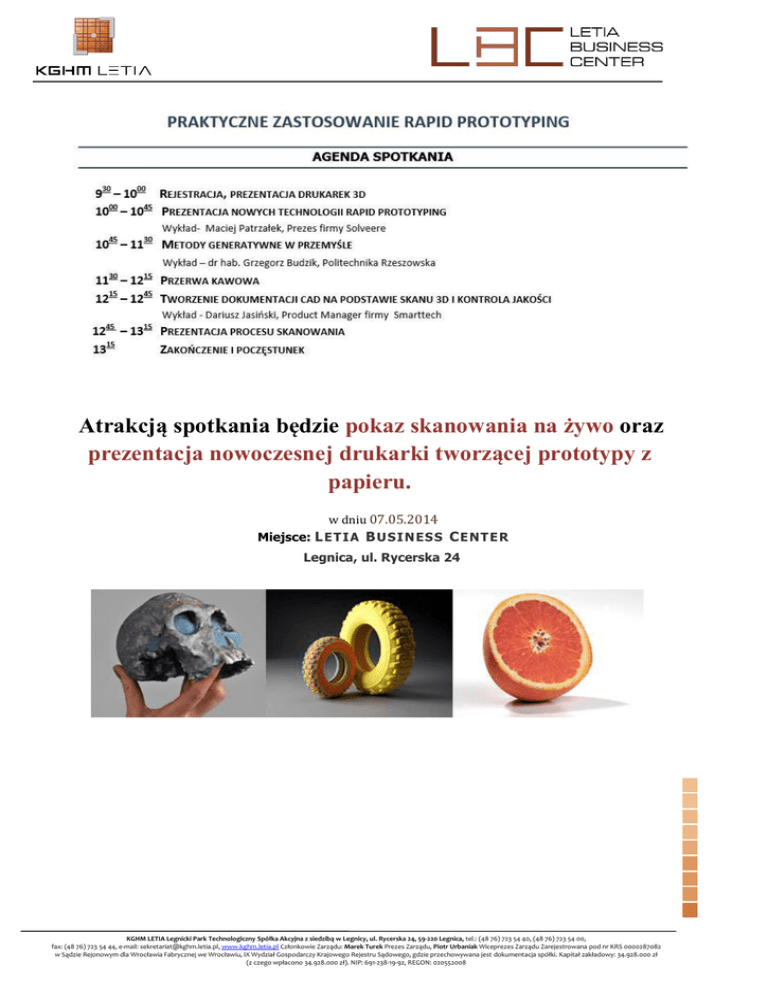 Atrakcją spotkania będzie pokaz skanowania na żywo oraz prezentacja nowoczesnej drukarki tworzącej prototypy z papieru. w dniu 07.05.2014 Miejsce: L ET IA B U S I N ES S C E NT E R Legnica, ul. Rycerska 24 KGHM LETIA Legnicki Park Technologiczny Spółka Akcyjna z siedzibą w Legnicy, ul. Rycerska 24, 59-220 Legnica, tel.: (48 76) 723 54 40, (48 76) 723 54 00, fax: (48 76) 723 54 44, e-mail: [email protected], www.kghm.letia.pl Członkowie Zarządu: Marek Turek Prezes Zarządu, Piotr Urbaniak Wiceprezes Zarządu Zarejestrowana pod nr KRS 0000287082 w Sądzie Rejonowym dla Wrocławia Fabrycznej we Wrocławiu, IX Wydział Gospodarczy Krajowego Rejestru Sądowego, gdzie przechowywana jest dokumentacja spółki. Kapitał zakładowy: 34.928.000 zł (z czego wpłacono 34.928.000 zł). NIP: 691-238-19-92, REGON: 020552008