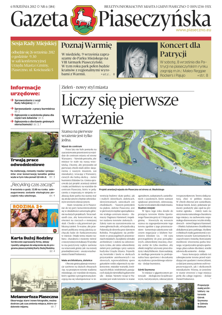 6 WRZEŚNIA 2012 NR 6 (184) BIULETYN INFORMACYJNY MIASTA I GMINY PIASECZNO ISSN 1234-351X Gazeta Sesja Rady Miejskiej odbędzie się 26 września 2012 o godzinie 9.30 w sali konferencyjnej Urzędu Miasta i Gminy, Piaseczno, ul. Kościuszki 5 Informacje urzędowe: Piaseczyńska www.piaseczno.eu Poznaj Warmię W niedzielę, 9 września zapraszamy do Parku Miejskego na VIII Jarmark Piaseczyński. W tym roku park pełen będzie kramów z regionalnymi wyrobami z Warmii. str. 8 Koncert dla Patrycji W sobotę, 8 września dla Patrycji na piaseczyńskim rynku zagrają m.in.: Maleo Reggae Rockers i Pajujo str. 8 Zieleń - nowy styl miasta Sprawozdanie z sesji Rady Miejskiej str. 2 Sprawozdanie z pracy burmistrza str. 2 Ogłoszenie o wyłożeniu planu dla części wsi Julianów str. 6 Ogłoszenia o dierżawie gminnych nieruchomości str. 3, 7 Liczy się pierwsze wrażenie Szansa na pierwsze wrażenie jest tylko jedna. Trwają prace odwodnieniowe Na meliorację, remonty rowów i przepustów oraz konserwację kanałów gmina wyda w tym roku ponad 4,8 mln zł. str. 3 „Recykling czas zacząć” 9 września o godz. 12.00 na rynku zainaugurowany zostanie ekologiczny początek roku szkolnego. str. 4 Karta Dużej Rodziny Serdecznie zapraszamy firmy, sklepy i punkty usługowe do włączenia się do programu piaseczyńskiej Karty Dużej Rodziny. str. 4 Wjazd do centrum Przez lata nie było pomysłu na zaaranżowanie przestrzeni na wjeździe do centrum miasta od strony Warszawy. – Niewiele potrzeba, aby miejsce to stało się naszą wizytówką. Chcemy, aby przyjezdni od pierwszej chwili mieli dobre skojarzenia z naszym miastem, zaś mieszkańcy, wracając z Warszawy, cieszyli oko ładną okolicą – mówi burmistrz Zdzisław Lis. Gmina opracowała już projekt aranżacji zieleni i małej architektury na wjeździe do centrum Piaseczna, który w połączeniu z rozpoczętą w sierpniu realizacją skate parku ma szansę stać się atrakcyjnym i chętnie odwiedzanym terenem rekreacyjnym. – Mam wrażenie, że w Piasecznie do tej pory koncentrowaliśmy się w działalności samorządu głównie na dużych projektach. Teraz nadszedł czas, aby koncentrować się również na rzeczach o mniejszej skali. Chodzi o całą przestrzeń publiczną i zieleń. To ważne, aby przestrzeń publiczna swoją jakością zachęcała ludzi do funkcjonowania w mieście. Dzięki temu miasto nabiera charakteru i możemy mówić o rzeczywistej rewitalizacji. Wszystko to ma pozytywny wpływ zarówno na wizerunek gminy jak i na rozwój przedsiębiorczości – uważa wiceburmistrz Daniel Putkiewicz. Mała architektura, zieleńce Obecnie gmina planuje renowacje zarówno na dużych obszarach (np. na przejętym terenie stadionu miejskiego, czy wjeździe do miasta, który zgodnie z przygotowaną koncepcją ma się wkomponować w in- Metamorfoza Piaseczna Obserwując stare i nowe fotografie, można dostrzec jak czas zmienia miejsca, które codziennie mijamy. str. 7 Projekt aranżacji wjazdu do Piaseczna od strony ul. Okulickiego westycję budowy skate parku), jak i małych (skwerkach, zieleńcach, skrzyżowaniach, zatoczkach czy chodnikach). – Naszym pomysłem na piękne, zielone Piaseczno, jest w pierwszym rzędzie uporządkowanie ścisłego centrum miasta – tłumaczy Dagmara Hammerl, inspektor nadzoru terenów zielonych. – Zależy nam na zaaranżowaniu na nowo głównych ulic, od wjazdu ulicą Puławską do skwerku przy dawnym Rolniku. Przyglądamy się problemom w poszczególnych przestrzeniach miejskich. Zaczęliśmy od małej architektury i zieleni na odnowionym rynku, ale także odnowiliśmy zieleń przy parkingu i przy samym budynku Urzędu Miasta. Pojawiły się kwietniki i ławki w okolicach przystanków autobusowych i na skwerach, wprowadziliśmy sporo gatunków roślin odpornych na niekorzystne, miejskie warunki, kwitnących obficie, wieloletnich, pasujących skalą do niewielkich gabarytów ulic – dodaje. Niestety wciąż w Piasecznie jest wiele terenów w stanie agonalnym, zadeptanych, zaniedbanych i zasolonych, które zamiast upiększać przestrzeń, odstraszają. Są one wyzwaniem dla władz miasta. Stadion miejski W lipcu tego roku doszło do przejęcia terenów Klubu Sportowego Piaseczno przy ul. 1 Maja przez gminę. – Stworzyła się wreszcie szansa na zagospodarowanie tego terenu zgodnie z jego przeznaczeniem – komentuje zakończone sukcesem negocjacje z klubem burmistrz Zdzisław Lis. – Od razu przystąpiliśmy do prac porządkowych, odnowiliśmy murawę, chcemy zrobić ile tylko możliwe, aby obiekt mógł być używany przez drużyny i służył kibicom. Mam nadzieję, że niedługo powstanie tu profesjonalna baza sportowa i doczekamy się stadionu z prawdziwego zdarzenia – dodaje burmistrz. Górki Szymona To miejsce o gigantycznym potencjale ekologiczno-krajobrazowym, turystycznym, rekreacyjnym i wypoczynkowym. Teren z dziką naturą, choć w pobliżu miasta. W chwili obecnej jest zaniedbany, brakuje ławek, koszy, połamane pomosty posłużyły jako opał na prywatne ogniska. – Zależy nam na utrzymaniu naturalnego charakteru tego miejsca, na zachowaniu wspaniałego drzewostanu i wydm śródlądowych – mówi Dagmara Hammerl. – Obiekty kubaturowe chcielibyśmy zlokalizować przy parkingu. Myślimy o obiektach małej gastronomii z systemem tarasów kawiarnianych łączących stawy i Jeziorkę. Rozważamy możliwość stworzenia parku linowego, wypożyczalni sprzętu sportowego, placu zabaw dla dzieci, ścieżki zdrowia dla seniorów – dodaje. – Nasza koncepcja zakłada też zabezpieczenie terenu przed wjeżdżającymi quadami i motocyklami, co dziś jest zmorą zarówno osób wypoczywających, jak i okolicznych mieszkańców. Wierzę, że jesteśmy w stanie stworzyć z tego miejsca perłę dla całego regionu – dodaje Daniel Putkiewicz. * Propozycje małej architektury na terenie Górek Szymona w Zalesiu Dolnym 2 aktualności Gazeta Piaseczyńska 6 września 2012, nr 6 (184) Sprawozdan