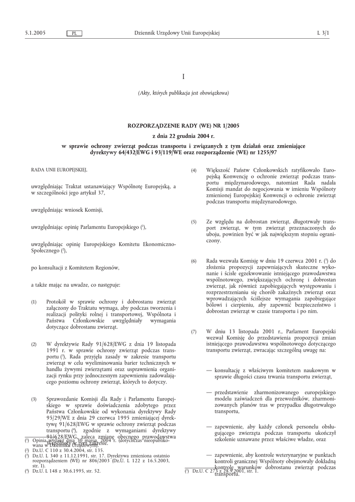 5.1.2005 PL Dziennik Urzędowy Unii Europejskiej L 3/1 I (Akty, których publikacja jest obowiązkowa) ROZPORZĄDZENIE RADY (WE) NR 1/2005 z dnia 22 grudnia 2004 r. w sprawie ochrony zwierząt podczas transportu i związanych z tym działań oraz zmieniające dyrektywy 64/432/EWG i 93/119/WE oraz rozporządzenie (WE) nr 1255/97 RADA UNII EUROPEJSKIEJ, (4) Większość Państw Członkowskich ratyfikowało Europejską Konwencję o ochronie zwierząt podczas transportu międzynarodowego, natomiast Rada nadała Komisji mandat do negocjowania w imieniu Wspólnoty zmienionej Europejskiej Konwencji o ochronie zwierząt podczas transportu międzynarodowego. (5) Ze względu na dobrostan zwierząt, długotrwały transport zwierząt, w tym zwierząt przeznaczonych do uboju, powinien być w jak największym stopniu ograniczony. (6) Rada wezwała Komisję w dniu 19 czerwca 2001 r. (5) do złożenia propozycji zapewniających skuteczne wykonanie i ścisłe egzekwowanie istniejącego prawodawstwa wspólnotowego, zwiększających ochronę i dobrostan zwierząt, jak również zapobiegających występowaniu i rozprzestrzenianiu się chorób zakaźnych zwierząt oraz wprowadzających ściślejsze wymagania zapobiegające bólowi i cierpieniu, aby zapewnić bezpieczeństwo i dobrostan zwierząt w czasie transportu i po nim. (7) W dniu 13 listopada 2001 r., Parlament Europejski wezwał Komisję do przedstawienia propozycji zmian istniejącego prawodawstwa wspólnotowego dotyczącego transportu zwierząt, zwracając szczególną uwagę na: uwzględniając Traktat ustanawiający Wspólnotę Europejską, a w szczególności jego artykuł 37, uwzględniając wniosek Komisji, uwzględniając opinię Parlamentu Europejskiego (1), uwzględniając opinię Europejskiego Komitetu EkonomicznoSpołecznego (2), po konsultacji z Komitetem Regionów, a także mając na uwadze, co następuje: (1) (2) Protokół w sprawie ochrony i dobrostanu zwierząt załączony do Traktatu wymaga, aby podczas tworzenia i realizacji polityki rolnej i transportowej, Wspólnota i Państwa Członkowskie uwzględniały wymagania dotyczące dobrostanu zwierząt. W dyrektywie Rady 91/628/EWG z dnia 19 listopada 1991 r. w sprawie ochrony zwierząt podczas transportu (3), Rada przyjęła zasady w zakresie transportu zwierząt w celu wyeliminowania barier technicznych w handlu żywymi zwierzętami oraz usprawnienia organizacji rynku przy jednoczesnym zapewnieniu zadowalającego poziomu ochrony zwierząt, których to dotyczy. Sprawozdanie Komisji dla Rady i Parlamentu Europejskiego w sprawie doświadczenia zdobytego przez Państwa Członkowskie od wykonania dyrektywy Rady 95/29/WE z dnia 29 czerwca 1995 zmieniającej dyrektywę 91/628/EWG w sprawie ochrony zwierząt podczas transportu (4), zgodnie z wymaganiami dyrektywy 91/628/EWG, zaleca zmianę obecnego prawodawstwa (1) Opinia wydana dnia 30 marca, 2004 r. (dotychczas nieopublikow tym zakresie. wana wWspólnoty Dzienniku Urzędowym). (3) (2) Dz.U. C 110 z 30.4.2004, str. 135. (3) Dz.U. L 340 z 11.12.1991, str. 17. Dyrektywa zmieniona ostatnio rozporządzeniem (WE) nr 806/2003 (Dz.U. L 122 z 16.5.2003, str. 1). 4 ( ) Dz.U. L 148 z 30.6.1995, str. 52. — konsultację z właściwym komitetem naukowym w sprawie długości czasu trwania transportu zwierząt, — przedstawienie zharmonizowanego europejskiego modelu zaświadczeń dla przewoźników, zharmonizowanych planów tras w przypadku długotrwałego transportu, — zapewnienie, aby każdy członek personelu obsługującego zwierzęta podczas transportu ukończył szkolenie uznawane przez właściwe władze, oraz — zapewnienie, aby kontrole weterynaryjne w punktach kontroli granicznej Wspólnoty obejmowały dokładną kontrolę warunków dobrostanu zwierząt podczas 5 ( ) Dz.U. C 273 z 28.9.2001, str. 1. transportu. L 3/2 PL Dziennik Urzędowy Unii Europejskiej (8) Komitet Naukowy ds. Zdrowia i Dobrostanu Zwierząt wydał opinię w sprawie dobrostanu zwierząt podczas transportu dnia 11 marca 2002 r. W związku z tym, prawodawstwo wspólnotowe powinno zostać zmienione tak, aby uwzględnić nowe dowody naukowe uznając za priorytetową potrzebę zapewnienia właściwego egzekwowania w najbliższej przyszłości. (9) Szczegółowe przepisy dotyczące drobiu, kotów i psów zostaną określone w odpowiednich propozycjach po otrzymaniu odpowiednich opinii od Europejskiego Urzędu ds. Bezpieczeństwa Żywności (EFSA). (10) (11) (12) W świetle doświadczenia zdobytego w ramach dyrektywy 91/628/EWG w harmonizacji prawodawstwa wspólnotowego dotyczącego transportu zwierząt, oraz trudności napotkanych w transpozycji dyrektywy do prawa krajowego, bardziej wskazane będzie ustanowienie reguł wspólnotowych w tym zakresie w formie rozporządzenia.W oczekiwaniu na przyjęcie szczegółowych przepisów dotyczących niektórych gatunków mających szczególne potrzeby oraz stanowiących niewielką część zwierząt Wspólnoty, należy umożliwić Państwom Członkowskim ustanowienie lub utrzymanie dodatkowych przepisów krajowych dotyczących transportu zwierząt należących do tych gatunków. Aby zagwarantować spójne i skuteczne stosowania niniejszego rozporządzenia we Wspólnocie w świetle podstawowej zasady, zgodnie z którą zwierzęta nie mogą być transportowane w warunkach powodujących zranienia lub niepotrzebne cierpienia, należy ustanowić szczegółowe przepisy uwzględniające szczególne potrzeby w związku z wykorzystaniem różnych środków transportu. Tego rodzaju szczegółowe przepisy powinny być interpretowane i stosowane zgodnie z zasadą określoną powyżej oraz aktualizowane w odpowiednim terminie, w szczególności jeżeli w świetle nowych opinii naukowych nie gwarantują przestrzegania zasady określonej powyżej w odniesieniu do szczególnych gatunków lub szczególnych środków transportu. Transport w celach komercyjnych nie jest ograniczony do transportu związanego z jednoczesną wymianą pieniędzy, towarów lu