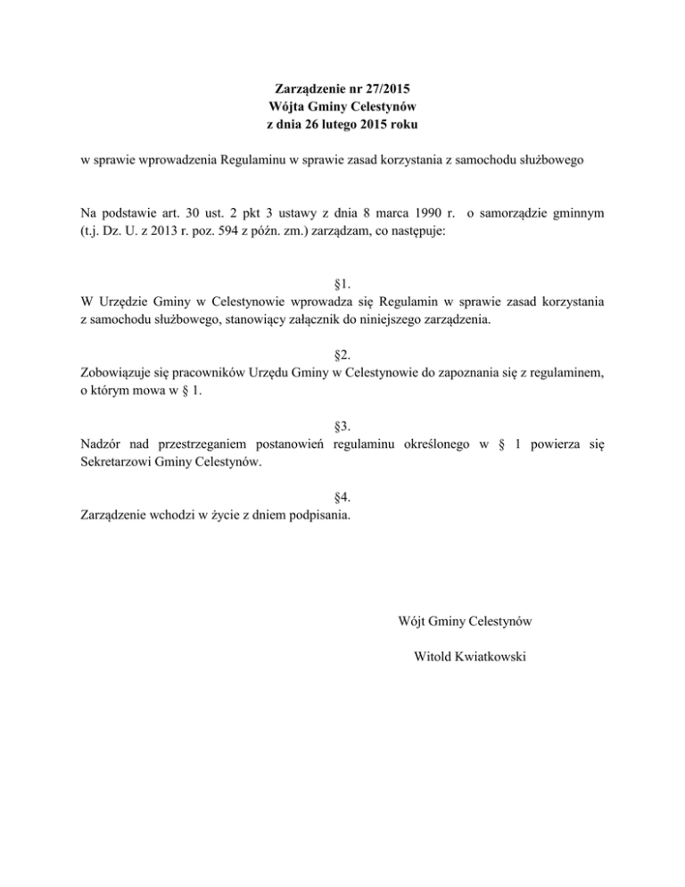 Zarządzenie nr 27/2015 Wójta Gminy Celestynów z dnia 26 lutego 2015 roku w sprawie wprowadzenia Regulaminu w sprawie zasad korzystania z samochodu służbowego Na podstawie art. 30 ust. 2 pkt 3 ustawy z dnia 8 marca 1990 r. o samorządzie gminnym (t.j. Dz. U. z 2013 r. poz. 594 z późn. zm.) zarządzam, co następuje: §1. W Urzędzie Gminy w Celestynowie wprowadza się Regulamin w sprawie zasad korzystania z samochodu służbowego, stanowiący załącznik do niniejszego zarządzenia. §2. Zobowiązuje się pracowników Urzędu Gminy w Celestynowie do zapoznania się z regulaminem, o którym mowa w § 1. §3. Nadzór nad przestrzeganiem postanowień regulaminu określonego w § 1 powierza się Sekretarzowi Gminy Celestynów. §4. Zarządzenie wchodzi w życie z dniem podpisania. Wójt Gminy Celestynów Witold Kwiatkowski Załącznik do zarządzenia nr 27/2015 z dnia 26 lutego 2015 roku REGULAMIN W SPRAWIE ZASAD KORZYSTANIA Z SAMOCHODU SŁUŻBOWEGO §1 Postanowienia ogólne Ilekroć mowa w Regulaminie o: 1) urzędzie - należy przez to rozumieć Urząd Gminy w Celestynowie z siedzibą przy ul. Reguckiej 3 w miejscowości Celestynów; 2) samochodzie służbowym - należy przez to rozumieć należący do Gminy Celestynów samochód marki Peugeot Partner Tepee, nr rejestracyjny WOT 11768, pojemność silnika 1598 cm3; 3) dysponencie - należy przez to rozumieć osobę, której przekazano do dyspozycji samochód służbowy; 4) kierującym - pracownik, który otrzymał od Wójta Gminy pisemne upoważnienie do kierowania samochodem służbowym stanowiące załącznik nr 1 do regulaminu. §2 Cel i zakres użytkowania 1. Samochód służbowy może być wykorzystywany przez kierującego lub dysponenta posiadającego pisemne polecenie wyjazdu służbowego wraz z precyzyjnie określonym celem i miejscem podróży. 2. Samochód służbowy pozostaje do dyspozycji kierującego lub dysponenta tylko i wyłącznie w czasie pracy lub w czasie wypełniania obowiązków na rzecz Gminy Celestynów. 3. Dysponent lub kierujący nie jest uprawniony do korzystania z samochodu w czasie wolnym od pracy lub w celach niezwiązanych z działalnością Gminy Celestynów. §3 Koszty eksploatacji 1. Koszty eksploatacji samochodu ponosi Urząd Gminy w Celestynowie. 2. Bieżącej kontroli technicznej przed użyciem samochodu, w szczególności: kontrola oświetlenia, stan ogumienia, poziom oleju silnikowego, płynu chłodniczego, płynu do spryskiwaczy, dokonuje kierujący. 1. 1) 2) 3) 4) 2. 3. 4. 5. 6. §4 Odpowiedzialność za samochód Kierujący samochodem służbowym zobowiązany jest do: używania pojazdu zgodnie z przeznaczeniem, w szczególności do przestrzegania przepisów o ruchu drogowym; nie używania samochodu w sposób mogący zwiększyć ryzyko jego uszkodzenia; nie użyczania samochodu osobom trzecim, z wyjątkiem szczególnych sytuacji losowych; dbania o pozostawienie samochodu w stanie nienaruszonym, w tym o jego czystość. W przypadku spowodowania lub uczestnictwa w wypadku drogowym, kierujący zobowiązany jest do niezwłocznego zawiadomienia Sekretarza Gminy Celestynów oraz dopełnienia w miejscu zdarzenia wszelkich formalności niezbędnych do uzyskania odszkodowania od ubezpieczyciela. Spowodowanie przez kierującego samochodem służbowym zawinionej szkody, która nie podlega zwrotowi z tytułu ubezpieczenia, może powodować odpowiedzialność majątkową tej osoby do wysokości spowodowanej szkody. W przypadku kradzieży samochodu służbowego lub elementów jego wyposażenia kierujący jest zobowiązany do zabezpieczenia miejsca zdarzenia, zawiadomienia organów ścigania oraz niezwłocznego poinformowania o zaistniałym wydarzeniu Sekretarza Gminy Celestynów. Koszty wynikające z naruszenia przepisów o ruchu drogowym, a także nieuiszczenia opłaty z tytułu postoju pojazdu w strefie płatnego parkowania pokrywa kierujący. Kierujący podpisuje deklarację odpowiedzialności materialnej, stanowiącą załącznik nr 2 do niniejszego regulaminu. §5 Miejsce parkowania samochodu Po godzinach pracy lub po wykonaniu zadań związanych z działalnością Gminy Celestynów kierujący jest zobowiązany do parkowania samochodu służbowego jedynie w następujących miejscach: 1) garażach lub miejscach parkingowych stanowiących własność Gminy Celestynów lub będących w jej dyspozycji; 2) miejscach garażowych należących do kierującego lub zamkniętej posesji; 3) na parkingach strzeżonych. §6 Dokumentacja 1. Karta drogowa samochodu służbowego stanowi druk ścisłego zarachowania. 2. Ewidencja korzystania z samochodu służbowego prowadzona jest przez kierowcę na numerowanej karcie drogowej stanowiącej załącznik nr 3 do niniejszego Regulaminu, z zachowaniem ciągłości zapisów w kolejnych dniach. 3. Kierujący samochodem zobowiązany jest do bieżącego i rzetelnego uzupełniania wpisów w karcie drogowej samochodu służbowego w celu szczegółowego wykazania sposobu korzystania z samochodu do celów służbowych. 4. Kartę drogową samochodu służbowego sprawdza pod względem formalno-rachunkowym pracownik referatu finansowego. 5. Kartę drogową samochodu służbowego zatwierdza Wójt. Załącznik nr 1 do Regulaminu w sprawie zasad korzystania z samochodu służbowego Celestynów, dnia ……………………………… Upoważnienie nr ……/……… do kierowania samochodem służbowym Upoważniam …………………………………………………………………..….., zatrudnionego(-nej) (Imię i nazwisko pracownika) na stanowisku ……………………………………………………………………..., legitymującego(-ej) (stanowisko służbowe) się dowodem osobistym seria …………………… nr ……………………….., wydanym przez ………………………………………………………………………………………….. oraz prawem jazdy kat. ……………………......... nr …………………………………