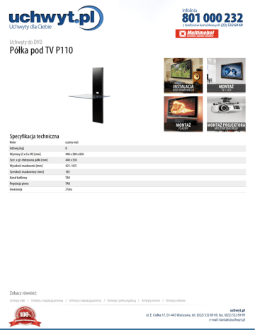 Uchwyty do DVD Półka pod TV P110 INSTALACJA MONTAŻ MONTAŻ MONTAŻ PROJEKTORA KINA DOMOWEGO PLAZMY TV / LCD MULTIMEDIALNEGO Specyfikacja techniczna Kolor czarny mat Udźwig [kg] 8 Wymiary (S x G x W) [mm] 440 x 380 x 856 Szer. x gł. efektywna półki [mm] 440 x 350 Wysokość maskownic [mm] 425 / 425 Szerokość maskownicy [mm] 185 Kanał kablowy TAK Regulacja pionu TAK Gwarancja 2 lata Zobacz również: Uchwyty stałe / Uchwyty z regulacją pionową / Uchwyty z regulacją poziomą / Uchwyty z pełną regulacją / Uchwyty ścienne / Uchwyty sufitowe uchwyt.pl ul. E. Ciołka 17, 01-445 Warszawa, tel. (022) 532 69 69, fax. (022) 532 69 99 e-mail: [email protected]