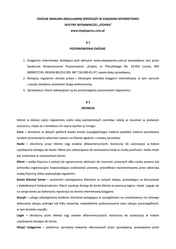 OGÓLNE WARUNKI (REGULAMIN) SPRZEDAŻY W KSIĘGARNI INTERNETOWEJ OFICYNY WYDAWNICZEJ „STOPKA” www.stopkapress.com.pl §1 POSTANOWIENIA OGÓLNE 1. Księgarnia internetowa działająca pod adresem www.stopkapress.com.pl prowadzona jest przez Społeczne Stowarzyszenie Prasoznawcze „Stopka, al. Piłsudskiego 83, 18-403 Łomża, KRS 0000072745, REGON 001251709, NIP 718-000-01-97, zwane dalej sprzedawcą. 2. Niniejszy regulamin określa prawa i obowiązki klientów księgarni internetowej, w tym warunki i zasady składania zamówień drogą elektroniczną. 3. Sprzedawca i klient zobowiązani są do przestrzegania postanowień regulaminu. §2 DEFINICJE Ilekroć w dalszej części regulaminu użyto niżej wymienionych zwrotów, należy je rozumieć w podanym znaczeniu, chyba że z kontekstu ich użycia wynika co innego: Cena – określona w złotych polskich kwota brutto (uwzględniająca należne podatki) należna sprzedawcy tytułem przeniesienia własności towaru na klienta zgodnie z umową sprzedaży; Hasło – określony przez klienta ciąg znaków alfanumerycznych, konieczny do autoryzacji w trakcie uzyskiwania dostępu do konta. Klient jest zobowiązany do zachowania hasła w ścisłej poufności. Hasło może być zmienione w ustawieniach konta; Klient – osoba fizyczna o pełnej lub ograniczonej zdolności do czynności prawnych albo osoba prawna lub jednostka organizacyjna nieposiadająca osobowości prawnej, prawidłowo reprezentowana przez właściwą osobę fizyczną, która zaakceptuje regulamin; Konto klienta/ konto – przestrzeń udostępniana klientowi w ramach sklepu, pozwalająca na korzystanie z dodatkowych funkcjonalności. Klient uzyskuje dostęp do konta klienta za pomocą loginu i hasła. Loguje się na swoje konto po dokonaniu rejestracji na stronie internetowej księgarni; Koszyk – usługa udostępniana każdemu klientowi polegająca w szczególności na umożliwieniu mu łatwego dokonania zakupu jednego lub kilku towarów, wyświetlenie podsumowania ceny zakupu poszczególnych, w tym kosztów wysyłki; Login – określony przez klienta ciąg znaków alfanumerycznych, konieczny do autoryzacji w trakcie uzyskiwania dostępu do konta; Sklep/ księgarnia – platforma sprzedaży towarów oferowanych przez sprzedawcę, prowadzona przez sprzedawcę, stanowiąca zespół połączonych ze sobą stron internetowych, dostępna za pośrednictwem adresu http://www.stopkapress.com.pl; Sprzedawca – Społeczne Stowarzyszenie Prasoznawcze „Stopka”, al. Piłsudskiego 83, 18-403 Łomża, KRS 0000072745, REGON 001251709, NIP 718-000-01-97; Towar – produkty prezentowane w księgarni internetowej pod adresem http://www.stopkapress.com.pl; Zamówienie – formularz udostępniony w ramach sklepu, określający towary, jakie zamierza kupić klient oraz jego dane. §2 OGÓLNE ZASADY KORZYSTANIA Z KSIĘGARNI INTERNETOWEJ 1. Akceptacja niniejszego regulaminu jest dobrowolna, ale konieczna w celu dokonania zakupu w księgarni. 2. Społeczne Stowarzyszenie Prasoznawcze „Stopka” udziela klientom informacji w zakresie prowadzonej działalności w dni robocze w godzinach od 8.00 do 16.00 pod numerem telefonu 862164261 oraz pod adresem e-mail: [email protected]. Opłata dla konsumenta za połączenie telefoniczne z pracownikiem SSP STOPKA pod wskazanym numerem jest równa opłacie za zwykłe połączenie telefoniczne, zgodnie z planem taryfowym dostawcy usług, z którego korzysta klient. 3. Kupujący może składać zamówienia 24 godziny na dobę za pośrednictwem strony internetowej księgarni. Zamówienie pociąga za sobą obowiązek zapłaty ceny podanej przy tytule towaru. 4. Przedmiotem umowy sprzedaży są rzeczy nowe, które sprzedawca jest zobowiązany dostarczyć bez wad. Ewentualne reklamacje można składać w sposób i w terminie określonym w rozdziale Reklamacje i prawo odstąpienia od umowy. 5. Konsument może zrezygnować z dokonanych zakupów i odstąpić od umowy sprzedaży bez podania przyczyny w sposób i w terminie określonym w rozdziale Reklamacje i prawo odstąpienia od umowy. W przypadku odstąpienia od umowy uważa się ją za niezawartą, a jeżeli konsument złoży oświadczenie o odstąpieniu od umowy – zanim sprzedawca przyjął jego ofertę, oferta przestaje wiązać. 6. Klient uzyskuje dostęp do konta klienta za pomocą loginu i hasła. Klient loguje się na swoje konto po dokonaniu rejestracji na stronie internetowej księgarni. 7. Klient ma możliwość zmiany i korygowania danych wprowadzonych podczas tworzenia konta. 8. Kupujący wybiera towar i składa zamówienie za pośrednictwem formularza dostępnego na stronie internetowej www.stopkapress.com.pl. Po przesłaniu zamówienia kupujący otrzymuje potwierdzenie przyjęcia zamówienia przez księgarnię. Zamówienia, w których dane kupującego będą niepełne, nie będą realizowane. 9. Zamówienie zostanie zrealizowane pod warunkiem, że towar jest aktualnie dostępny w magazynie księgarni. Kupujący jest niezwłocznie informowany, jeżeli całość lub część towarów objętych zamówieniem jest niedostępna. Po uzyskaniu takiej informacji kupujący decyduje o dalszym sposobie realizacji zamówienia. 10. Oprócz wskazania tytułu i liczby publikacji oraz wyboru formy płatności i dostawy zamówienie musi zawierać następujące dane: a. imię i nazwisko, b. adres do wysyłki, c. telefon. 11. Dane wprowadzane do zamówienia przez zamawiającego muszą być aktualne i zgodne z prawdą. §3 CENA TOWARU 1. Cena podana przy tytule towaru jest wyrażona w polskich złotych. 2. Każdy towar opatrzony jest ceną netto i brutto. 3. Cena podana przy towarze jest wiążąca w chwili złożenia zamówienia przez kupującego. 4. Cena nie obejmuje opłaty za dostawę. Koszt dostawy zostanie doliczony do wartości zakupionego towaru w momencie wyboru rodzaju dostawy przez kupującego. 5. Sprzedawca zastrzega sobie prawo do zmiany cen towarów, wprowadzania nowych towarów. 6. Uprawnienie do z