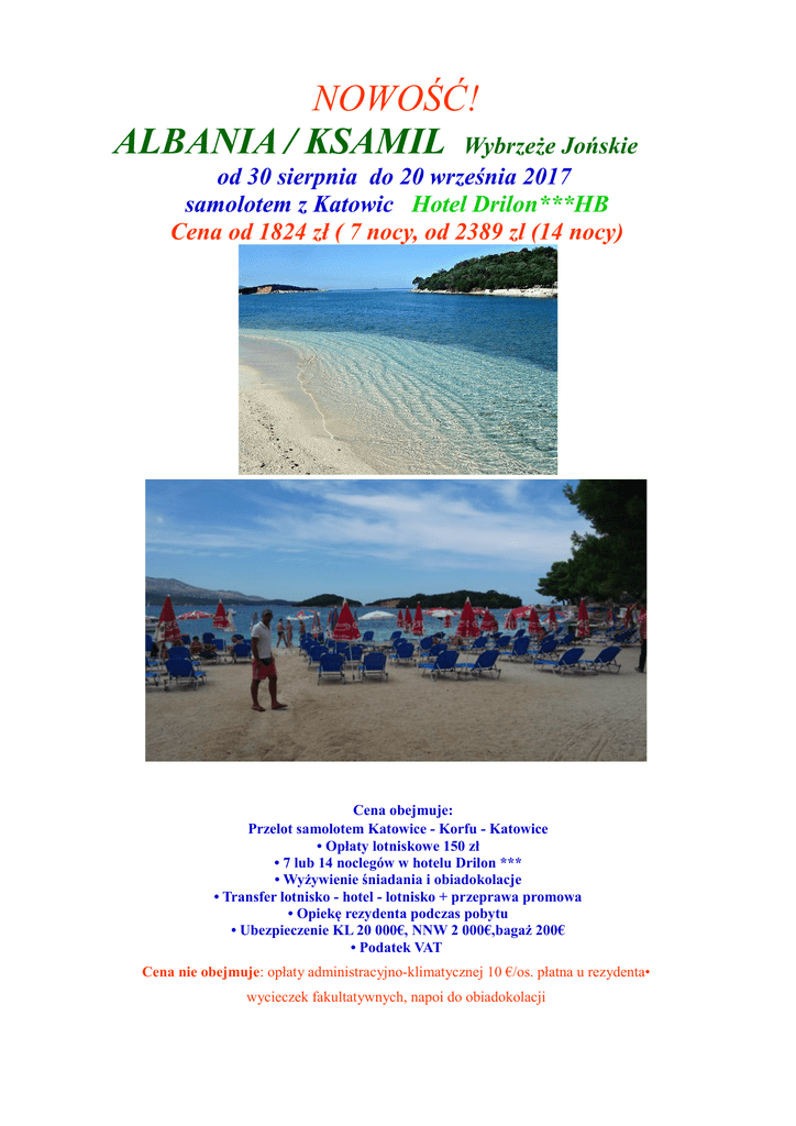 NOWOŚĆ! ALBANIA / KSAMIL Wybrzeże Jońskie od 30 sierpnia do 20 września 2017 samolotem z Katowic Hotel Drilon***HB Cena od 1824 zł ( 7 nocy, od 2389 zl (14 nocy) Cena obejmuje: Przelot samolotem Katowice - Korfu - Katowice • Opłaty lotniskowe 150 zł • 7 lub 14 noclegów w hotelu Drilon *** • Wyżywienie śniadania i obiadokolacje • Transfer lotnisko - hotel - lotnisko + przeprawa promowa • Opiekę rezydenta podczas pobytu • Ubezpieczenie KL 20 000€, NNW 2 000€,bagaż 200€ • Podatek VAT Cena nie obejmuje: opłaty administracyjno-klimatycznej 10 €/os. płatna u rezydenta• wycieczek fakultatywnych, napoi do obiadokolacji Ksamil to niewielka miejscowość położona na południu Albanii niedaleko granicy z Grecją, mniej więcej w połowie drogi między Sarandą a Butrinti. To, co czyni ją wyjątkową, to piękna zatoka urozmaicona czterema niewielkimi wysepkami. Po prostu raj na ziemi! Znajdziecie tu piękną, słoneczną pogodę, czystą, ciepłą wodę, przyjemne plaże, pyszne, tanie jedzenie. No i te widoki.. ATUTY: centrum miasteczka i blisko plaży, pokoje z bezpłatną klimatyzacją, lodówką i balkonem, możliwość zakwaterowania rodzin 4 osobowych Zajęcia animacyjne dostosowane są dla każdego odbiorcy bez względu na; płeć, wiek czy zainteresowania. Każdy turysta w ciągu dnia powinien znaleźć coś dla siebie. Wakacje to nie musi być tylko bierne leżakowanie. Takie aktywności jak na przykład; aerobik, rozciąganie, lekcje tańca, siatkówka czy piłka wodna pozwolą połączyć przyjemne z pożytecznym.