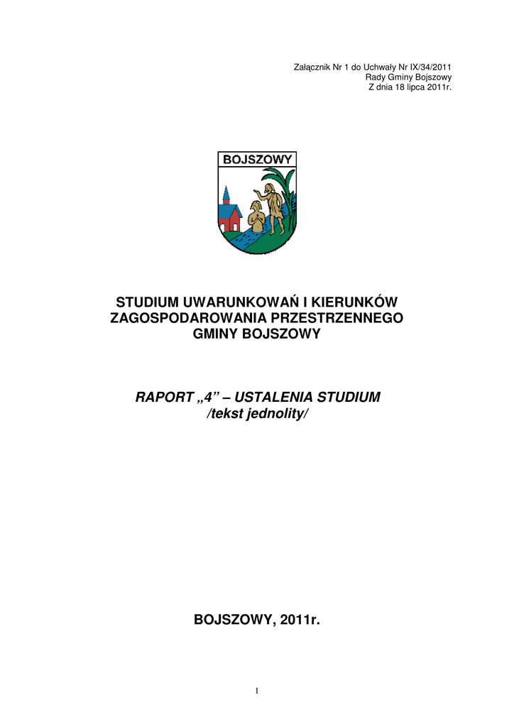 Załącznik Nr 1 do Uchwały Nr IX/34/2011 Rady Gminy Bojszowy Z dnia 18 lipca 2011r. STUDIUM UWARUNKOWAŃ I KIERUNKÓW ZAGOSPODAROWANIA PRZESTRZENNEGO GMINY BOJSZOWY RAPORT „4” – USTALENIA STUDIUM /tekst jednolity/ BOJSZOWY, 2011r. 1 SPIS TREŚCI: ROZDZIAŁ 1: Cele i uwarunkowania rozwoju. ROZDZIAŁ 2: Kierunki zagospodarowania przestrzennego. ROZDZIAŁ 3: Kierunki ochrony środowiska przyrodniczego i środowiska życia mieszkańców. ROZDZIAŁ 4: Kierunki rozwoju komunikacji i infrastruktury technicznej. ROZDZIAŁ 5: Jakość życia mieszkańców. ROZDZIAŁ 6: Wytyczne konserwatorskie. ROZDZIAŁ 7: Instrumenty polityki przestrzennego zagospodarowania gminy. ZAŁĄCZNIK NR 1: Lista proponowanych publicznych przedsięwzięć inwestycyjnych. 2 ROZDZIAŁ 1 CELE I UWARUNKOWANIA ROZWOJU GMINY TREŚĆ: 1. Misja 2. Generalne cele rozwoju gminy 3. Zewnętrzne uwarunkowania rozwoju 4. Wewnętrzne uwarunkowania rozwoju 3 1. MISJA GMINA BOJSZOWY ATRAKCYJNYM MIEJSCEM ZAMIESZKANIA, PRACY I WYPOCZYNKU Misję gminy, generalnego wizerunku charakteryzuje bliżej zbiór pożądanych cech gminy: końcowego efektu działań 1) dogodne warunki życia obejmujące: a) zdrowe i czyste środowisko, b) estetykę krajobrazu i zabudowy, c) bezpieczeństwo: fizyczne i socjalne, 2) materialny poziom życia oparty na wysokich dochodach, 3) dostępność do usług (zdrowotnych, edukacyjnych, kulturowych, handlowych i wypoczynkowych), 4) aktywność gospodarcza mieszkańców i przedsiębiorców, 5) konkurencyjność gminy i jej podmiotów gospodarczych, 6) sprawność funkcjonowania instytucji oraz systemów infrastruktury technicznej i komunikacji. 2. CELE GENERALNE ROZWOJU GMINY Ze sformułowania misji bezpośrednio wynikają dwa cele generalne. Są nimi: 1) Wzrost atrakcyjności Gminy dla społeczności lokalnej, 2) Wzrost atrakcyjności Gminy dla zewnętrznych gospodarczych. podmiotów Taka definicja podstawowych celów rozwoju pociąga za sobą potraktowanie jako priorytetowych funkcji dla gminy: 1) Funkcji mieszkaniowo – usługowej, 2) Funkcji gospodarczej. 3. ZEWNĘTRZNE UWARUNKOWANIA ROZWOJU Cel: wzrost atrakcyjności gminy dla społeczności lokalnej Szanse 1) Lokalizacja gminy w strefie oddziaływania Katowickiego Zespołu Metropolitalnego (KZM), 2) Atrakcyjność terenów gminy dla mieszkańców KZM, 3) Popyt na tereny mieszkaniowe w dobrych warunkach środowiska, 4) Dostępność do miejsc pracy i placówek usługowych w sąsiednich miastach, 5) Bliskość centrów specjalistycznych usług ponadpodstawowych, Tychy, Pszczyna, 6) Rozwój lokalnej bazy rozrywkowo – sportowej o charakterze regionalnym – ośrodek „Graf”, 7) Dobre stosunki z sąsiednimi gminami. 4 Zagrożenia 1) Stały wzrost ponad lokalnego i regionalnego tranzytu samochodowego, 2) Potoki stwarzające zagrożenie powodziowe, 3) Bezrobocie wywołane restrukturyzacja gospodarki, szczególnie kopalń oraz zakładów przemysłowych, 4) Degradacja wód i znacznej części doliny Gostynki, od niemal źródeł do ujścia, 5) Degradacja wód Pszczynki i po części Korzyńca, 6) Zagrożenia środowiska wywołane zbiornikiem wód słonych, 7) Dzikie składowiska odpadów a w szczególności wylewiska gnojowicy i fekaliów, 8) Obniżenie dotacji na przekazane gminom zadania publiczne, 9) Ograniczone środki finansowe na modernizację dróg wojewódzkich i powiatowych. Cel: Wzrost atrakcyjności gminy dla zewnętrznych podmiotów gospodarczych Szanse 1) Duży potencjalny popyt mieszkańców aglomeracji przemysłowych na usługi turystyczno – rekreacyjne stymulowany wzrostem ich zamożności, 2) Dogodne położenie gminy na skraju terenów uprzemysłowionych, 3) Istniejąca sieć dróg krajowych i wojewódzkich zapewnia powiązanie komunikacyjne lokalne i ponadlokalne (mimo braku normatywnych parametrów), 4) Naturalna możliwość stworzenia bazy usług specjalistycznych m.in. dla mieszkańców pobliskich, dużych miast, 5) Płaski, nieuciążliwy dla penetracji teren oraz urozmaicony krajobraz, 6) Malownicza dolina Wisły, Korzyńca i Pszczynki. Zagrożenia 1) Wpływ działalności KWK „Piast" i „Czeczott' na pogorszenie warunków budowlanych, aerosanitarnych, wodnych i glebowych, 2) Konkurencyjność sąsiednich gmin, 3) Ograniczenie finansowe na modernizację dróg wojewódzkich i powiatowych. 4. WEWNĘTRZNE UWARUNKOWANIA ROZWOJU Cel: wzrost atrakcyjności gminy dla społeczności lokalnej Siły 1) 2) 3) 4) Zrównoważone ruchy migracyjne, Stabilizujący się przyrost naturalny, Aktywność mieszkańców, Promowanie inwestycji oświatowych, 5 5) Stowarzyszenia i zespoły artystyczne, własna gazeta, liczne imprezy folklorystyczne świadczące o przywiązaniu do tradycji – do korzeni, 6) Rezerwy terenu dla zabudowy mieszkaniowej, 7) Nowoczesne urządzenia telekomunikacyjne zapewniające wysoki poziom obsługi abonenckiej, 8) Rozbudowujące się sieci infrastruktury technicznej, 9) Oczyszczalnia ścieków. Słabości 1) Niezaspokojone ilościowo potrzeby mieszkaniowe, 2) Ograniczony (odbiegający od średnich standardów wojewódzkich) poziom wyposażenia gminy w niektóre urządzenia obsługi ludności, 3) Utrzymujące się bezrobocie, szczególnie wśród kobiet, 4) Niski poziom obsługi mieszkańców w zakresie usług podstawowych, szczególnie z zakresu ochrony zdrowia (apteki, liczba lekarzy i pielęgniarek), 5) Brak usług specjalistycznych, wykorzystujące naturalne walory gminy, ograniczone środki finansowe na równomierne zaspokajanie wszystkich potrzeb i aspiracji mieszkańców w sferze usług, 6) Wydłużone ciągi zabudowy, 7) Wydłużone ciągi infrastruktury technicznej. Cel: Wzrost atrakcyjności gminy dla zewnętrznych podmiotów gospodarczych Siły 1) Postawy społeczności lokalnej (otwartość i gościnność), 2) Duże potencjalne możliwości wykorzystania terenów przywodnych, 3) Zachowanie się w gminie cennych zespołów i obiektów o walorach zabytkowych, 4) Znacznie łagodniejszy klimat lokalny niż na te
