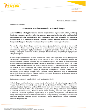 Warszawa,30sierpnia2016 Informacjaprasowa PowitanieszkołynawesołowGaleriiZaspa Już w najbliższą sobotę (3 września) Galeria Zaspa zamieni się w wesołą szkołę, w której lekcje to prawdziwa przyjemność. Gry, zabawy, quizy edukacyjne to tylko część atrakcji przygotowanych dla najmłodszych. Pilni uczniowie otrzymają pieczątki do szkolnych dzienniczków,azazebraniewszystkich„wpisów”wygrająnagrody!Rodzicewtymczasie będąmiećokazjędoskompletowaniaszkolnejwyprawkiwpromocyjnychcenach. W wesołej szkole Galerii Zaspa uczniowie przekonają się, że koniec wakacji to nie powód do smutku. Dzieci rozpoczną dzień od przygotowania pysznej i zdrowej kanapki śniadaniowej. Następnie będą uczestniczyć w zajęciach przyrody, plastyki oraz WF-u. Po każdej z lekcji pilni uczniowie dostaną pieczątki do dzienniczka, dzięki którym będą mogły otrzymaćnagrodę. GaleriaZaspaniezapominarównieżorodzicach,którzytakżebędąmiećokazjędowygrania atrakcyjnych upominków. Wystarczy zrobić zakupy za min. 50 zł w dowolnym sklepie na tereniecentrumipokazaćrachunek,bymócodebraćnagrodę.Cowięcej,wWesołejSzkole GaleriiZaspakompletowaniewyprawkiszkolnejtoprawdziwaprzyjemność.SklepyKiK,Textil Market, supermarket Intermarche oraz drogeria Rossmann przygotowały atrakcyjne oferty w związku z rozpoczynającym się rokiem szkolnym. Dodatkowo, zgodnie z zasadą „w zdrowym ciele, zdrowy duch” punkt ze zdrowymi przekąskami i sokami Zielona Wyspa przygotuje pyszne zielone koktajle, które na hasło „szkoła” dostępne będą w promocyjnej cenie. Dzięki centrum fitness Calypso będzie możliwość darmowego wykonania pomiaru masyciałaorazkonsultacjiztrenerem. Zabawarozpoczniesięogodz.11:00ipotrwadogodz.18:00. GaleriaZaspazostałaotwartapomodernizacjiwkwietniubr.Zajejrealizacjęodpowiadała Grupa Capital Park (inwestor) oraz Akron Group (właściciel obiektu). Wśród najemców centrum znajdują się znane, ogólnopolskie marki m.in. supermarket Intermarche, drogeria Rossmann, salon Euro RTV ADG, klub fitness Calypso, KiK, sklepy odzieżowe Textil Market i Exxelent, cukiernia Sowa, Domino’s Pizza, salon prasowy Inmedio oraz apteka Dbam o Zdrowie. Lokalnych najemców reprezentują m.in. piekarnia Szydłowski, ZOO Karina czy sklepkolonialnyCamellia.Galeriazapewniatakżedostępdousługpotrzebnychdorealizacji bieżących potrzeb klientów: pralnia, kwiaciarnia, usługi fotograficzne, usługi krawieckie, centrumdiagnostyczne. Dodatkoweinformacje: KarolinaGoczoł BiuroprasoweGaleriaZaspa tel.+48509757886 e-mail:[email protected] *** Galeria Zaspa (dawne ETC Gdańsk) to centrum handlowe zlokalizowane w gdańskiej dzielnicy Zaspa. W latach 2015/2016 obiekt przeszedł gruntowną modernizację, zrealizowaną przez Grupę Capital Park (inwestora) oraz Akron Group (właściciela obiektu). Aktualnie na powierzchni 8.800 mkw. mieści się 40punktówhandlowychiusługowych.Kliencimajądodyspozycjiparkingz215miejscamipostojowymi.Obiekt pierwotniepełniłfunkcjęhangarulotniczego.Doswojejhistoriinawiązujepoprzezelementyarchitektoniczne iwizualne.Elementykonstrukcyjneznajdującesięwgaleriisąstylizowanenaskrzydłasamolotu,anaścianach znajdują się grafiki z historycznymi zdjęciami. Także nowe logo Galerii Zaspa nawiązuje do historii miejsca, wykorzystującmotywskrzydełsamolotu,jakoodniesieniedopierwotnychfunkcjijakiepełniłbudynek. Więcejinformacji:www.galeriazaspa.pl GrupaCapitalParkjestinwestoremideweloperemdziałającymnarynkunieruchomościwPolsce.Specjalizuje sięwwyszukiwaniuiwykorzystywaniuokazjirynkowychorazmodernizacjiobiektówhandlowychiusługowych. Od rozpoczęcia działalności w 2003 roku grupa przeprowadziła ok. 100 transakcji inwestycyjnych i zarządza portfelemnieruchomościobejmującym76projektów,zlokalizowanychw39miastach. AkronGrouptoaustriackagrupaspecjalizującasięwinwestowaniuwnieruchomościbiurowe,handloweoraz logistyczne. Firma działa na rynku austriackim, polskim, węgierskim oraz holenderskim oferując możliwości inwestowaniam.in.dlainwestorówindywidualnychorazinstytucjonalnych.
