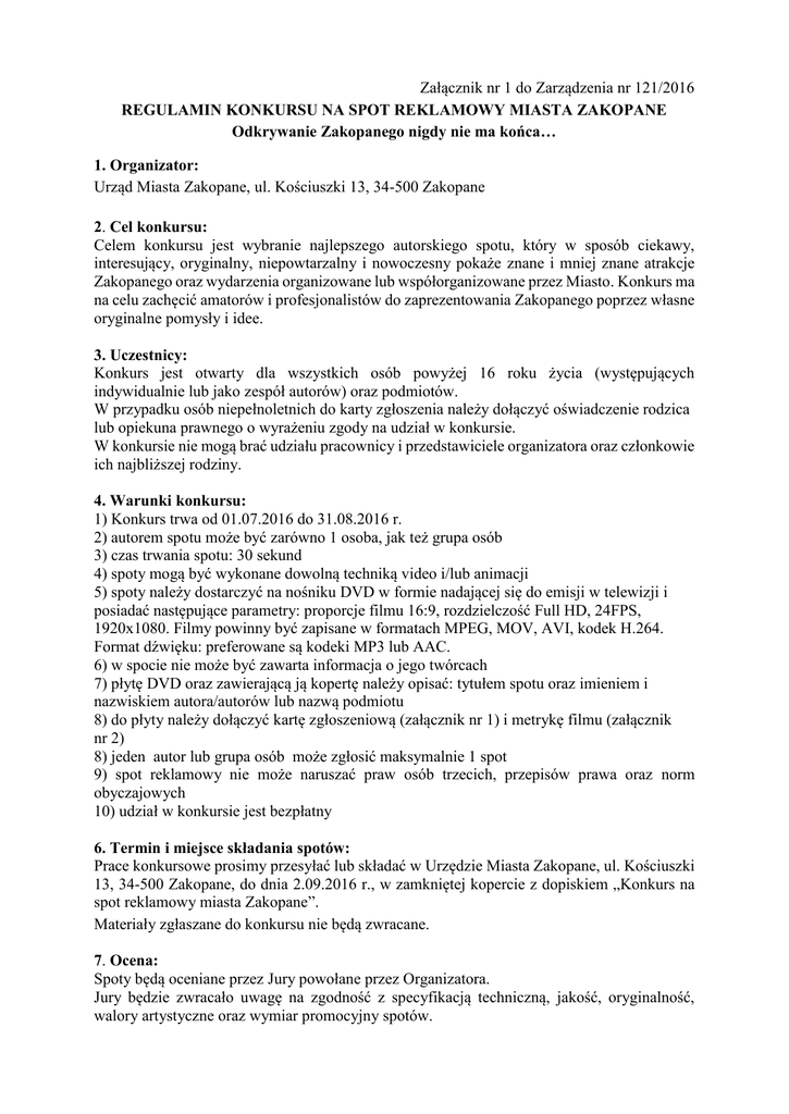 Załącznik nr 1 do Zarządzenia nr 121/2016 REGULAMIN KONKURSU NA SPOT REKLAMOWY MIASTA ZAKOPANE Odkrywanie Zakopanego nigdy nie ma końca… 1. Organizator: Urząd Miasta Zakopane, ul. Kościuszki 13, 34-500 Zakopane 2. Cel konkursu: Celem konkursu jest wybranie najlepszego autorskiego spotu, który w sposób ciekawy, interesujący, oryginalny, niepowtarzalny i nowoczesny pokaże znane i mniej znane atrakcje Zakopanego oraz wydarzenia organizowane lub współorganizowane przez Miasto. Konkurs ma na celu zachęcić amatorów i profesjonalistów do zaprezentowania Zakopanego poprzez własne oryginalne pomysły i idee. 3. Uczestnicy: Konkurs jest otwarty dla wszystkich osób powyżej 16 roku życia (występujących indywidualnie lub jako zespół autorów) oraz podmiotów. W przypadku osób niepełnoletnich do karty zgłoszenia należy dołączyć oświadczenie rodzica lub opiekuna prawnego o wyrażeniu zgody na udział w konkursie. W konkursie nie mogą brać udziału pracownicy i przedstawiciele organizatora oraz członkowie ich najbliższej rodziny. 4. Warunki konkursu: 1) Konkurs trwa od 01.07.2016 do 31.08.2016 r. 2) autorem spotu może być zarówno 1 osoba, jak też grupa osób 3) czas trwania spotu: 30 sekund 4) spoty mogą być wykonane dowolną techniką video i/lub animacji 5) spoty należy dostarczyć na nośniku DVD w formie nadającej się do emisji w telewizji i posiadać następujące parametry: proporcje filmu 16:9, rozdzielczość Full HD, 24FPS, 1920x1080. Filmy powinny być zapisane w formatach MPEG, MOV, AVI, kodek H.264. Format dźwięku: preferowane są kodeki MP3 lub AAC. 6) w spocie nie może być zawarta informacja o jego twórcach 7) płytę DVD oraz zawierającą ją kopertę należy opisać: tytułem spotu oraz imieniem i nazwiskiem autora/autorów lub nazwą podmiotu 8) do płyty należy dołączyć kartę zgłoszeniową (załącznik nr 1) i metrykę filmu (załącznik nr 2) 8) jeden autor lub grupa osób może zgłosić maksymalnie 1 spot 9) spot reklamowy nie może naruszać praw osób trzecich, przepisów prawa oraz norm obyczajowych 10) udział w konkursie jest bezpłatny 6. Termin i miejsce składania spotów: Prace konkursowe prosimy przesyłać lub składać w Urzędzie Miasta Zakopane, ul. Kościuszki 13, 34-500 Zakopane, do dnia 2.09.2016 r., w zamkniętej kopercie z dopiskiem „Konkurs na spot reklamowy miasta Zakopane”. Materiały zgłaszane do konkursu nie będą zwracane. 7. Ocena: Spoty będą oceniane przez Jury powołane przez Organizatora. Jury będzie zwracało uwagę na zgodność z specyfikacją techniczną, jakość, oryginalność, walory artystyczne oraz wymiar promocyjny spotów. Spoty niespełniające warunków regulaminu, zostaną automatycznie odrzucone. Decyzje Jury są ostateczne i niepodważalne. 8. Nagrody: Organizator przewiduje przyznanie następujących nagród: nagroda za I miejsce w wysokości 5.000 zł dwie nagrody za II miejsce w wysokości 3.000 zł dwie nagrody za III miejsce w wysokości 2.000 zł Od nagród zostanie pobrany należny podatek. Jury zastrzega sobie prawo do nie przyznania nagród lub innego ich podziału, a także przyznania nagród dodatkowych. 9. Wyniki konkursu: O wynikach konkursu oraz o terminie i miejscu wręczenia nagród, uczestnicy i laureaci zostaną powiadomieni telefonicznie i mailowo w terminie do 30.09.2016r. Informacje zostaną zamieszczone również na stronie www.zakopane.eu Autorzy prac, którzy zechcą uczestniczyć w uroczystości wręczenia nagród, przyjeżdżają na własny koszt. 10. Postanowienia ogólne: 1) Organizator przewiduje możliwość wykorzystania zwycięskich filmów w całości lub we fragmentach, a także zawartych w nich pomysłów i scenariusza, w kampaniach reklamowych miasta Zakopane. Warunkiem odebrania nagrody jest zawarcie odrębnych umów dotyczących przekazania praw autorskich i praw pokrewnych do spotu. Wynagrodzenie ze przeniesienie własności oryginalnego egzemplarza spotu oraz nabycie autorskich praw majątkowych do spotu stanowi przyznana nagroda. 2) Uczestnik załącza pisemną zgodę osób występujących w spocie, a których zgoda jest konieczna, na publikację ich wizerunku - także w ewentualnych kampaniach reklamowych miasta Zakopanego w szeroko rozumianych mediach 3) Organizator zastrzega sobie możliwość negocjowania ze zwycięzcą ostatecznego kształtu spotu. 4) Złożenie spotów do konkursu przez uczestników jest równoznaczne z oświadczeniem, że są oni ich autorami i w żaden sposób nie naruszyli praw autorskich osób trzecich. Organizatorzy nie ponoszą odpowiedzialności za nieprzestrzeganie przez autorów filmów postanowień ustawy o prawach autorskich. 5) Zgłoszenie prac na konkurs uważane będzie za wyrażenie zgody na publikowanie danych osobowych zgodnie z ustawą z dnia 28.08.1997 r. o ochronie danych osobowych (Dz.U. nr 133 poz. 883). Ponadto uczestnicy konkursu wyrażają zgodę na opublikowanie swojego imienia i nazwiska, miejscowości zamieszkania oraz informacji o otrzymanej nagrodzie na stronach organizatora, w innych środkach masowego przekazu, na potrzeby promocji miasta Zakopane. Uczestnikom przysługuje prawo dostępu do treści swoich danych oraz ich poprawiania. 6) Organizator zastrzega sobie możliwość zmian w regulaminie oraz do unieważnienia konkursu bez podania przyczyny. 7) Udział w konkursie oznacza jednocześnie akceptację niniejszego regulaminu. 8)Wszelkie pytania oraz wątpliwości dotyczące konkursu prosimy kierować na adres [email protected].