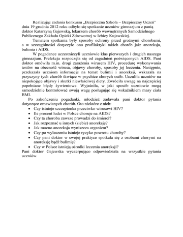Realizując zadania konkursu „Bezpieczna Szkoła – Bezpieczny Uczeń” dnia 19 grudnia 2012 roku odbyło się spotkanie uczniów gimnazjum z panią doktor Katarzyną Gajewską, lekarzem chorób wewnętrznych Samodzielnego Publicznego Zakładu Opieki Zdrowotnej w Izbicy Kujawskiej. Tematem spotkania były sposoby ochrony przed groźnymi chorobami, a w szczególności dotyczyło ono profilaktyki takich chorób jak: anoreksja, bulimia i AIDS. W pogadance uczestniczyli uczniowie klas pierwszych i drugich naszego gimnazjum. Prelekcja rozpoczęła się od zagadnień poświęconych AIDS. Pani doktor omówiła m.in. drogi zarażenia wirusem HIV, procedurę wykonywania testów na obecność wirusa, objawy choroby, sposoby jej leczenia. Następnie, przekazała uczniom informacje na temat bulimii i anoreksji, wskazała na przyczyny tych chorób tkwiące w psychice chorych osób. Uczuliła uczniów na niepokojące objawy i skutki niewłaściwej diety. Zwróciła uwagę na najczęściej popełniane błędy żywieniowe. Wyjaśniła, w jaki sposób uczniowie mogą samodzielnie kontrolować swoją wagę posługując się wskaźnikiem masy ciała BMI. Po zakończeniu pogadanki, młodzież zadawała pani doktor pytania dotyczące omawianych chorób. Oto niektóre z nich: Czy istnieje szczepionka przeciwko wirusowi HIV? Ile procent ludzi w Polsce choruje na AIDS? Czy ta choroba zawsze prowadzi do śmierci? Jak rozpoznać u innych (siebie) anoreksję? Jak mocno anoreksja wyniszcza organizm? Czy po wyleczeniu istnieje ryzyko powrotu choroby? Czy pani doktor w swojej praktyce spotkała się z osobami chorymi na anoreksję bądź bulimię? Czy w Polsce istnieją ośrodki leczenia anoreksji? Pani doktor Gajewska wyczerpująco odpowiedziała na wszystkie pytania uczniów. Podsumowaniem spotkania z lekarzem było wykonanie przez uczniów ulotek i plakatów dotyczących profilaktyki omawianych chorób. Technika wykonania prac była różna. Prace zawierały hasła i ilustracje ostrzegające przed wymienionymi chorobami, informacje o przyczynach chorób i sposobach zarażenia wirusem HIV. Następnie w szkole została zorganizowana wystawa najciekawszych prac.