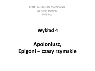 Krótki kurs historii matematyki Wojciech Domitrz MiNI PW Wykład 4 Apoloniusz, Epigoni – czasy rzymskie Apoloniusz z Pergi (gr. Ἀπολλώνιος ὁ Περγαῖος Apollonios ho Pergaios) (ok. 260 p.n.e. – ok. 190 p.n.e.) Wociech Domitrz Krótki Kurs Historii Matematyki Stożkowe (Conica gr. Κωνικά) Apoloniusza (8 ksiąg) Wociech Domitrz Krótki Kurs Historii Matematyki Pierwsze 4 księgi przetrwały w języku greckim Wyd. 1536 dla papieża Wociech Pawła III Krótki Kurs Historii Domitrz Matematyki Następne 3 księgi przetrwały w przekładzie arabskim Wociech Domitrz Krótki Kurs Historii Matematyki Równanie paraboli KL²=ML • LN ML/GL=BC/AB ML=GL•BC/AB KL²=GA•BC/AC•BC/AB•GL L N LN/GA=GN’/GA=BC/AC LN=GA•BC/AC Dobiera GF taki, że GF/GA=BC²/(AB•AC) A N’ M G L N K M K D B C H E Wtedy KL²=GF•LG KL=y, LG=x, GF=2p Wociech Domitrz Krótki Kurs Historii Matematyki y²=2px parabola Wociech Domitrz Krótki Kurs Historii Matematyki parabola Wociech Domitrz Krótki Kurs Historii Matematyki parabola Wociech Domitrz Krótki Kurs Historii Matematyki parabola : y²=2px παςαβολή tzn. przyłożenie F C |AB|=x |CB|=y |AH|=2p A x |BCFE|=|ABGH| y B E 2p H G D Wociech Domitrz Krótki Kurs Historii Matematyki Przyłożenie Z niedomiarem: Elipsa (z gr. ἔλλειψισ elleipsis ) • y²=2px –(p/a)x² Z nadmiarem: Hiperbola (z gr. ὑπερβολή ) • y²=2px +(p/a)x² Wociech Domitrz Krótki Kurs Historii Matematyki Przyrząd Archimedesa do rysowania elipsy (elipsograf) Autor: Alastair Rae en.wikipedia Autor: Zephyris en.wikipedia Wociech Domitrz Krótki Kurs Historii Matematyki Twierdzenie VII,12 • Suma kwadratów na średnicach sprzężonych elipsy jest równa sumie kwadratów na osiach głównych Wociech Domitrz Krótki Kurs Historii Matematyki Twierdzenie VII,12 • Suma kwadratów na średnicach sprzężonych elipsy jest równa sumie kwadratów na osiach głównych Wociech Domitrz Krótki Kurs Historii Matematyki Twierdzenie VII,12 • Suma kwadratów na średnicach sprzężonych elipsy jest równa sumie kwadratów na osiach głównych Wociech Domitrz Krótki Kurs Historii Matematyki Twierdzenie VII,12 • Suma kwadratów na średnicach sprzężonych elipsy jest równa sumie kwadratów na osiach głównych Wociech Domitrz Krótki Kurs Historii Matematyki Twierdzenie VII,12 • Suma kwadratów na średnicach sprzężonych elipsy jest równa sumie kwadratów na osiach głównych Wociech Domitrz Krótki Kurs Historii Matematyki Twierdzenie VII,12 • Suma kwadratów na średnicach sprzężonych elipsy jest równa sumie kwadratów na osiach głównych Wociech Domitrz Krótki Kurs Historii Matematyki Twierdzenie VII,13 • Różnica kwadratów na średnicach sprzężonych hiperboli jest równa różnicy kwadratów na osiach głównych Wociech Domitrz Krótki Kurs Historii Matematyki Twierdzenie VII,31 cytowane przez Newtona w De motu corporum in gyrum • Równoległobok zbudowany na dwóch średnicach sprzężonych elipsy lub paraboli ma stałe pole Wociech Domitrz Krótki Kurs Historii Matematyki Galileusz Autor: MichaelMaggs Edit by Richard Bartz en.wikipedia Wociech Domitrz Krótki Kurs Historii Matematyki Prawa Keplera (elipsa) Autor: Antonio González Fernández Gonfer en.wikipedia Wociech Domitrz Krótki Kurs Historii Matematyki Zastosowania Stożkowych • Galileusz: kamieo rzucony w próżni leci po paraboli • Kepler: planety układu słonecznego poruszają się po elipsach, i że w jednych z nich ognisk jest Słooce • Fermat i Kartezjusz w XVII w. : budowa podstaw geometrii analitycznej • Newton: opis i badania krzywych rzędu trzeciego • Newton: Podstawy matematyczne filozofii naturalnej Wociech Domitrz Krótki Kurs Historii Matematyki Klaudiusz Ptolemeusz (stgr. Κλαύδιος Πτολεμαῖος Klaudios Ptolemaios; ur. ok. 100, zm. ok. 168) Wociech Domitrz Krótki Kurs Historii Matematyki Almagest wyd.Wenecja 1496 Wociech Domitrz Krótki Kurs Historii Matematyki „Almagest” Ptolemeusza Tłumaczenie Georga Trebizonda z 1481 Wociech Domitrz Krótki Kurs Historii Matematyki Podstawowe elementy teorii Ptolemeusza A-epicykl B-ekwant C-deferent planeta Ziemia Wociech Domitrz Krótki Kurs Historii Matematyki Deferent i epicykl Merkurego Komentarz GeorgaTrebizonda do Almagestu z 1482 Wociech Domitrz Krótki Kurs Historii Matematyki System geocentryczny Ptolemeusza Wociech Domitrz Krótki Kurs Historii Matematyki Wszechświat wg. Ptolemeusza Wociech Domitrz Krótki Kurs Historii Matematyki Mapa świata wg. Ptolemeusza Wociech Domitrz Krótki Kurs Historii Matematyki Uproszczony ruch planet Wociech Domitrz Krótki Kurs Historii Matematyki Twierdzenie Ptolemeusza • W dowolnym czworokącie wpisanym w okrąg iloczyn długości przekątnych równy jest sumie iloczynów długości przeciwległych boków. B |AC|·|BD|=|AB|·|CD|+|AD|·|BC| A C Wociech Domitrz Krótki Kurs Historii Matematyki D Dowód twierdzenia Ptolemeusza K konstruujemy tak, że kąt KBC jest równy kątowi ABD ΔABK i ΔBDC są podobne: |AK|/|AB|=|CD|/|BD| czyli |AK||BD|=|AB||CD| ΔBCK i ΔBDA są podobne: |KC|/|BC|=|AD|/|BD| czyli |KC||BD|=|AD||BC| |AK||BD|+ |KC||BD |=|AB||CD| +|AD||BC| (|AK|+ |KC|)|BD |=|AB||CD| +|AD||BC| |AC||BD |=|AB||CD| +|AD||BC| Wociech Domitrz Krótki Kurs Historii Matematyki Tablice trygonometryczne Ptolemeusza Wociech Domitrz Krótki Kurs Historii Matematyki Tablice trygonometryczne Ptolemeusza Wociech Domitrz Krótki Kurs Historii Matematyki Tablice cięciw Ptolemeusza 98 60 109,5° 60 Wociech Domitrz Krótki Kurs Historii Matematyki Tablice cięciw Ptolemeusza |AC|·|BD|=|AB|·|CD|+|AD|·|BC| 120·|BC|= |AC|·|BD|-|AB|·|CD| 120·crd(β-α)= crd β·crd(90°-α)-crdα·crd(90°-β) Mając crd(72°) i crd(60°) otrzymujemy A crd(12°)= crd(72°-60°) C B β α 60 crd²(α/2)=60(120- crd(90°-α)) Mając crd(12°) otrzymujemy crd(6°), crd(3°), crd(1,5°), crd(3/4°) Wociech Domitrz Krótki Kurs Historii Matematyki 60 D Tablice cięciw