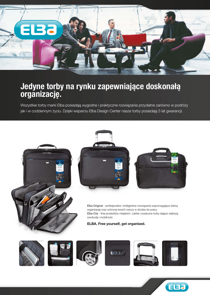-HG\QHWRUE\QDU\QNX]DSHZQLDMÇFHGRVNRQDîÇ RUJDQL]DFMÙ 6RYXRSJHDSNQAXL@QJH$KA@ONRH@C@IĘVXFNCMDHOQ@JSXBYMDQNYVHĘY@MH@OQYXC@SMDY@QłVMNVONCQłŤX I@JHVBNCYHDMMXLŤXBHT#YHĨJHVRO@QBHT$KA@#DRHFM"DMSDQM@RYDSNQAXONRH@C@IĘK@SFV@Q@MBIH Elba OriginalOQNEDRINM@KMDHHMSDKHFDMSMDQNYVHĘY@MH@VRONL@F@IĘBDCNAQĘ NQF@MHY@BIĨNQ@YNBGQNMĨSVNHBGQYDBYXVCQNCYDCNOQ@BX Elba CityKHMH@OQNCTJSłVLHDIRJHBG+DJJHDHONQĨBYMDSNQAXC@IĘBDVHĨJRYĘ RVNANCĨHLNAHKMNŌę ELBA. Free yourself, get organised. GALANTERIA SKÓRZANA AKTÓWKI 400, 401, 404 TORBY NA KOMPUTER 400, 402-405 TECZKI 404 XIV GALANTERIA SKÓRZANA aktówki / torby TORBA NA LAPTOPA LAP-10 JANPOL BIS ETUI NA TABLET JANPOL BIS Format - przystosowane do urządzenia o przekątnej 7” (na zamówienie inne formaty); etui wykonane z materiału skóropodobnego lub poliestru; wewnątrz 4 uchwyty; zamykane patką na rzep. cena netto 39,56 cena brutto 48,66 340108 (a) zł zł Grubość 6 cm; dwie duże przegrody w tym jedna z zabezpieczeniem na laptopa; dwie kieszonki na wizytówki; dwa uchwyty na długopisy; kieszonka na telefon komórkowy/i-phone; zewnętrzna kieszeń zamykana klapą; dwie wysuwane rączki na grzbiecie teczki; regulowany pasek na ramię. 340088 (a) czarna 340089 (a) brązowa cena netto 98,90 cena brutto 121,65 zł zł AKTÓWKA A4 BIZNES Z RĄCZKĄ Grubość 4 cm; kieszeń na dokumenty A4; kieszeń zamykana na zamek; płaska kieszeń; uchwyt na trzy długopisy; cztery kieszonki na wizytówki; kieszonka na pieczątkę; ring poczwórny na dokumenty; klip na dokumenty; rączka na grzbiecie teczki. Szerokość 4 cm; cztery duże przegrody; dwie kieszonki na wizytówki; dwa uchwyty na długopisy; rączka na grzbiecie teczki. 340004 (a) 340005 (a) 340006 (a) 340076 (a) 340077 (a) 340104 (a) 340078 (a) 340079 (a) 340080 (a) 340081 (a) 340082 (a) 340105 (a) 400 czarna brązowa ruda granatowa wiśniowa czerwona cena netto 70,33 cena brutto 86,51 zł zł AKTÓWKA BIUWAR A4 JANPOL BIS czarna brązowa ruda granatowa wiśniowa czerwona cena netto 68,13 cena brutto 83,80 zł zł przy zamawianiu proszę podawać numer katalogowy produktu XIV GALANTERIA SKÓRZANA aktówki / teczki AKTÓWKA PREMIER Z WYSUWANĄ RĄCZKĄ JANPOL BIS OKŁADKA KONFERENCYJNA 41D A4 JANPOL BIS Grubość 4 cm; kieszeń na dokumenty A4; kieszeń zamykana na zamek; płaska kieszeń; uchwyt na trzy długopisy; cztery kieszonki na wizytówki; kieszonka na telefon komórkowy; ring poczwórny na dokumenty; klip na dokumenty; dwie wysuwane rączki na grzbiecie teczki. Wykonana wewnątrz i z zewnątrz z materiału skóropodobnego; wewnętrzna część okładki wyposażona w klip metalowy oraz dwie kieszenie zakładkowe i kieszeń na wizytówkę; pośrodku miejsce na długopis. 340026 (a) 340027 (a) 340028 (a) 340029 (a) 340030 (a) 340106 (a) 340083 (a) 340084 (a) 340085 (a) 340086 (a) 340087 (a) 340107 (a) czarna brązowa ruda granatowa wiśniowa czerwona cena netto 85,71 cena brutto 105,42 zł zł czarna brązowa ruda granatowa wiśniowa czerwona cena netto 39,56 cena brutto 48,66 zł zł AKTÓWKA KALKULATOR A4 JANPOL BIS AKTÓWKA A4 BIZNESS JANPOL BIS Grubość 4 cm; kieszeń na dokumenty A4; kieszeń zamykana na zamek; płaska kieszeń; uchwyt na dwa długopisy; trzy kieszonki na wizytówki; kalkulator; ring poczwórny na dokumenty; klip na dokumenty; rączka na grzbiecie teczki. Grubość 4 cm; kieszeń na dokumenty A4; kieszeń zamykana na zamek; płaska kieszeń; uchwyt na trzy długopisy; cztery kieszonki na wizytówki; przezroczysta kieszonka na wizytówkę osobistą; ring poczwórny na dokumenty; klip na dokumenty. 340021 (a) 340022 (a) 340023 (a) 340024 (a) 340025 (a) 340103 (a) 340011 (a) 340012 (a) 340013 (a) 340014 (a) 340015 (a) 340102(a) czarny brąz rudy granat wiśnia czerwona przy zamawianiu proszę podawać numer katalogowy produktu cena netto 80,66 cena brutto 99,21 zł zł czarny brąz rudy granat wiśnia czerwona cena netto 59,34 cena brutto 72,99 zł zł 401 XIV GALANTERIA SKÓRZANA torby na laptopa TORBA NA LAPTOP ELBA ORIGINAL CLAMSHELL COMPUTER BAG Elastyczny system przegródek i kieszeni na dokumenty, które pomogą Ci posegregować swoje rzeczy; twarda wyściółka tej torby komputerowej została zaprojektowana specjalnie do przechowywania i ochrony laptopa do 16’’; wykonana z trwałego wodoodpornego materiału poliestrowego, torba chroni przed kurzem i wilgocią, dlatego wszystkie Twoje rzeczy są bezpieczne; ukryta przegródka niezastąpiona w podróży, doskonała do przechowywania paszportu lub karty pokładowej; w każdej chwili masz do niej łatwy dostęp; 5 lat gwarancji. 132536 (a) cena netto 446,23 cena brutto 548,86 zł zł TORBA NA LAPTOP ELBA ORIGINAL RANGE CLAMSHELL COMPUTER BAG Elastyczny system przegródek i kieszeni na dokumenty, które pomogą Ci posegregować swoje rzeczy; twarda wyściółka tej torby komputerowej została zaprojektowana specjalnie do przechowywania i ochrony laptopa do 16’’; wykonana z trwałego wodoodpornego materiału poliestrowego, torba chroni przed kurzem i wilgocią, dlatego wszystkie Twoje rzeczy są bezpieczne; ukryta przegródka niezastąpiona w podróży, doskonała do przechowywania paszportu lub karty pokładowej; w każdej chwili masz do niej łatwy dostęp; na laptop do 18”. 132538 (a) cena netto 465,72 cena brutto 572,84 Zawiera elastyczny system przegródek i kieszeni na dokumenty, które pomogą Ci posegregować swoje rzeczy i uwolnić swój umysł; trzy klinowa sekcja pomaga w porządkowaniu dokumentów, i daje dodatkowe 8 cm przestrzeni do przechowywania dokumentów; duża prywatna strefa, z wszytym sztywnym rozdzielaczem, elastycznym paskiem i kilkoma kieszeniami, pozwala dyskretnie nosić rzeczy osobiste; ukryta przegródka niezastąpiona w podróży, doskonała do przechowywania paszportu lub karty pokładowej; w każdej chwili masz do niej łatwy dostęp; na laptop do 18”; 5 lat gwarancji. 402 cena netto 582,19 cena brutto 716,09 Zawiera elastyczny system przegródek i kieszeni na dokumenty, k