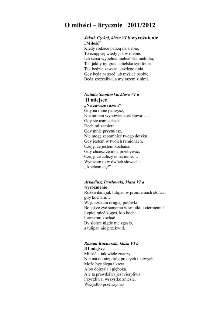 O miłości – lirycznie 2011/2012 Jakub Czekaj, klasa VI b wyróżnienie „Miłość” Kiedy rodzice patrzą na siebie, To czują się wtedy jak w niebie. Ich serca wypełnia niebiańska melodia, Tak jakby im grała anielska symfonia. Tak będzie zawsze, każdego dnia, Gdy będą patrzeć lub myśleć osobie, Będą szczęśliwi, a my razem z nimi. Natalia Smolińska, klasa VI a II miejsce „Na zawsze razem” Gdy na mnie patrzysz, Nie umiem wypowiedzieć słowa…… Gdy się uśmiechasz, Dech mi zamiera…. Gdy mnie przytulasz, Nie mogę zapomnieć twego dotyku. Gdy jestem w twoich ramionach, Czuję, że jestem kochana. Gdy chcesz ze mną przebywać, Czuję, że zależy ci na mnie…. Wyrażam to w dwóch słowach: „ kocham cię!” Arkadiusz Pawłowski, klasa VI a wyróżnienie Rozkwitam jak tulipan w promieniach słońca, gdy kocham… Więc szukam drugiej połówki. Bo jakże żyć samemu w smutku i cierpieniu? Lepiej mieć kogoś, kto kocha i samemu kochać…. By słońce nigdy nie zgasło, a tulipan nie przekwitł. Roman Kucharski, klasa VI b III miejsce Miłość – tak wiele znaczy. Nie ma do niej dróg prostych i łatwych. Może być ślepa i kręta Albo dojrzała i głęboka. Ale ta prawdziwa jest cierpliwa I życzliwa, wszystko zniesie, Wszystko przetrzyma- Chmury, burze, huragany…. Miłością człowiek żyje, Z miłości się rodzi. Pięknie jest żyć, Gdy się kogoś kocha I gdy kochanym się jest! Przemysław Fryderyk, klasa VI b I miejsce „Miłość” Miłość jest dawaniem. Miłość jest ufaniem, Cierpliwym znoszeniem życiowych bolączek, bardzo równym dzieleniem radości i smutku. Miłość to wielki trud, Który nie spada nam z nieba. Prawdziwą miłość codziennie zdobywać trzeba. Miłość to jedno serce i jeden serca ton, Ten ją zrozumie, Kto raz kochał I kochać umie! Katarzyna Heciak, klasa VI a „Jesteś moim marzeniem” Kiedy mrok cicho na ziemię opada, Nad łąkami snuje się welon z mgły. Do mego serca marzenie się wkrada, A tym marzeniem jesteś TY! Wieczorem cisza okryła świat, Gwiazdy zabłysły na niebie. Każdy na sercu ma jakiś kwiat. A ja mam w sercu CIEBIE! Angelika Mazurek, klasa VI a „Patrz w serce” Uwierz mi, Że gdy nawet śpię, To kocham cię. A gdy ciebie nie ma, Ratują mnie nasze wspomnienia. Nigdy nie patrz na urodę, Bo uroda z czasem minie, Ale popatrz w serce, Bo w nim wieczna miłość płynie. Wioletta Krzywicka, klasa VI a III miejsce *** Kocham cię bardzo, Bardziej niż myślisz. Ci co Tobą gardzą, Mówią, że mnie skrzywdzisz. Lecz jeśli mnie kochasz, Powiedz to szczerze. Nie będziesz żałował, A ja ci uwierzę. Nikola Schiewy, klasa VI a „Znak miłości” Moja miłość do ciebie Trwać będzie wiecznie. Kocham cię w dzień. Kocham cię w nocy. Jeśli ty mnie kochasz, Patrz mi głęboko w oczy. Codziennie w szkole omijasz mnie, Lecz ja zawsze będę kochała cię. Każdy twój ruch, każdy twój gest Oznacza to, że kochasz mnie. Tomasz Pieciul, klasa IV b wyróżnienie „Miłość” Miłość jest jak słońce, bo tu uczucie ciepłe i gorące. Jest jak uśmiech na twarzy Wtedy, gdy ci się coś miłego marzy. Jest kolorowa jak kwiaty na łące Zawsze przepiękne i pachnące. Miłość jest jak lot na paralotni, Bez niej bylibyśmy samotni. O miłości….. z humorem 2011/2012 Michał Kowalski, klasa VI a wyróżnienie „ O kociej miłości” Do myszki przyszedł kot. W ściankę stuka, słychać łomot. - Co tam u ciebie, myszko?Zamruczał rozkosznie - bo u mnie w porządku wszystko. Wyjdź z norki, na spacer ze mną chodź. -Nie! Nie! Ja kocham innego! Mojego przyjaciela, psa szaro – czarnego. - Ależ to zwykły kundel! - Cóż mój drogi, i on ,i ty ma cztery nogi, Ale serce ma szczere i wierne, w miłości stałe i niezmienne. Jagoda Marchewczyk, klasa VI b „Mysia miłość” Były dwie myszki, które się kochały I tygodniami za sobą ganiały. W poniedziałek się pokłóciły, A już we wtorek się pogodziły. W środę wspólnie pracowały, Ziarno na zimę sobie zbierały. W czwartek ogródek podlewały, Aby ich kwiatki nie omdlewały. W piątek drzewo piłowały, Razem trociny w worki zbierały. W sobotę zrobiły kąpanie wielkie, Żeby futerka ich były miękkie. Całą niedzielę odpoczywały, Bo się przez tydzień napracowały. I tak lata całe spędzały, Dwie myszki, co się po prosty bardzo kochały. Agata Ryżewska, klasa VI a „ Pora na przygodę z miłością w tle” Pewien chłopiec bardzo młody Szukał po świecie przygody. Był zaradny i przemiły, Panny bardzo go lubiły. - To nie dla mnie, drogie panie, Wyruszam z rana tuż przed świtaniem. Świat wprawdzie wielki, a ja nadal młody, Czekają na mnie wielkie przygody. Więc ruszył w pogoń za marzeniami, Wcześniej pożegnał się z damami. W świecie zabijał smoki oraz maszkary, Zwyciężał nawet senne koszmary. I to kochał najbardziej w świecie, Lecz w końcu oddał serce pięknej kobiecie. Daria Czafurska, klasa VI b „Wiersz o miłości?” Znam słonia i mrówkę, którzy w lesie spotkali borówkę. Kiedy się nią objadali, To się sobie zakochali. Słoń był duży, mrówka mała, A ich miłość krótkotrwała. Morał z wiersza płynie taki, dobierajcie się we właściwe pary kochane zwierzaki! Daria Czafurska, klasa VI b III miejsce „Żyrafa i klapki” Mam dla was opowieść taką O klapkach, co mieszkają z żyrafą. Klapki miały kaprys taki, że zechciały być na nogach żyrafy. Żyrafa nie zaprotestowała, bo chodzić w klapkach bardzo chciała. Razem wybrali się w podróż życia, wędrowali drogami nie do przebycia. Połączyło ich uczucie gorące Mocno lśniące jak słońce. Daria Cendrowska, klas VI b „Walentynki” Walentynki ma kolor czerwony, Jak rumieniec na twarzy dziewczyny. To dzień radości, święto miłości. Kupidynki celnie z łuków strzelają, a trafione strzałą miłości serduszka po niebie fruwają. W szkole poczta już ruszyła, W skrzynkach list