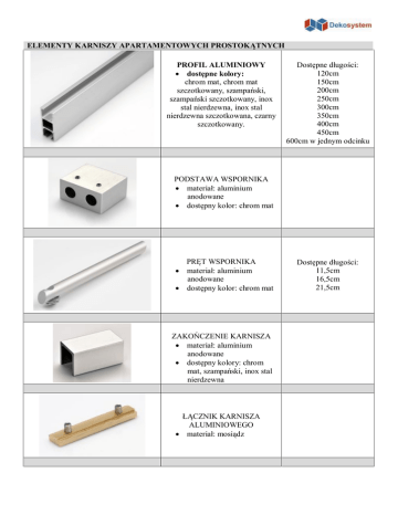 ELEMENTY KARNISZY APARTAMENTOWYCH PROSTOKĄTNYCH PROFIL ALUMINIOWY · dostępne kolory: chrom mat, chrom mat szczotkowany, szampański, szampański szczotkowany, inox stal nierdzewna, inox stal nierdzewna szczotkowana, czarny szczotkowany. Dostępne długości: 120cm 150cm 200cm 250cm 300cm 350cm 400cm 450cm 600cm w jednym odcinku PODSTAWA WSPORNIKA · materiał: aluminium anodowane · dostępny kolor: chrom mat PRĘT WSPORNIKA · materiał: aluminium anodowane · dostępny kolor: chrom mat ZAKOŃCZENIE KARNISZA · materiał: aluminium anodowane · dostępny kolory: chrom mat, szampański, inox stal nierdzewna ŁĄCZNIK KARNISZA ALUMINIOWEGO · materiał: mosiądz Dostępne długości: 11,5cm 16,5cm 21,5cm ELEMENTY KARNISZY APARTAMENTOWYCH PROSTOKĄTNYCH ŚRUBA Z NAKTĘTKĄ KWADRATOWĄ materiał stal ocynkowana WKRĘT DOCISKOWY M 4 x 4mm materiał: stal nierdzewna WKRĘT DOCISKOWY M 4 x 6mm materiał: stal nierdzewna WKRĘT DOCISKOWY M 4 x 10mm materiał: stal nierdzewna KLUCZ IMBUSOWY NOŚNIK SUFITOWY POJEDYNCZY materiał: aluminium anodowane w kolorze chrom mat NOŚNIK SUFITOWY PODWÓJNY materiał: aluminium anodowane w kolorze chrom mat HACZYK Z ROLKĄ materiał: tworzywo sztuczne ŻABKA OBROTOWA BEZBARWNA materiał: tworzywo sztuczne