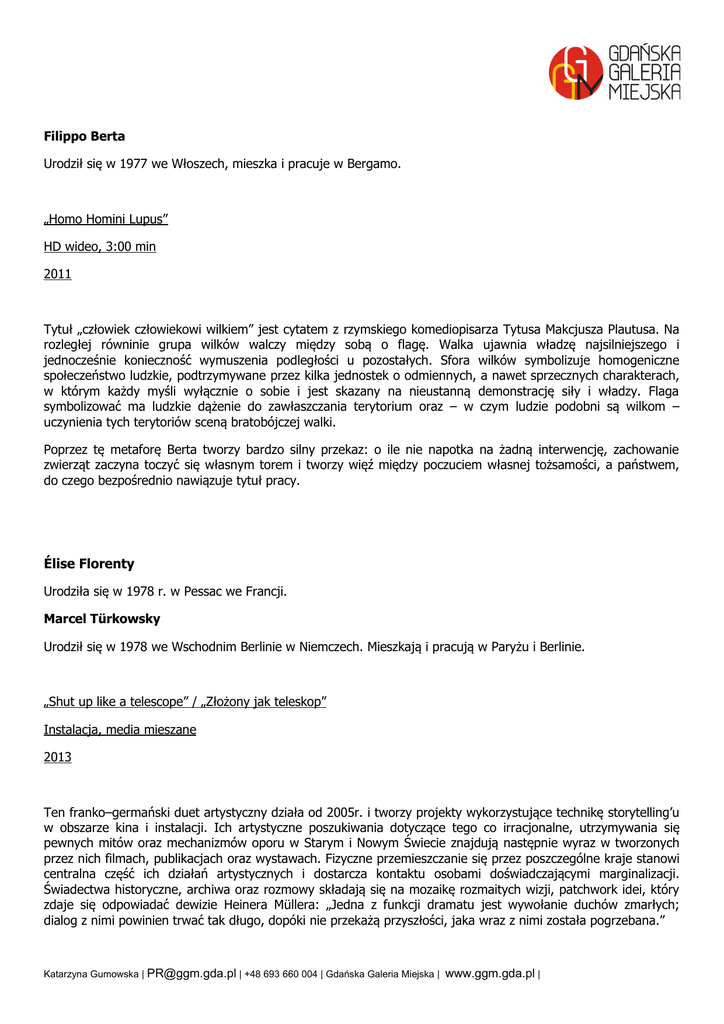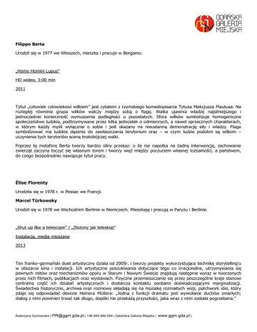 Filippo Berta Urodził się w 1977 we Włoszech, mieszka i pracuje w Bergamo. „Homo Homini Lupus” HD wideo, 3:00 min 2011 Tytuł „człowiek człowiekowi wilkiem” jest cytatem z rzymskiego komediopisarza Tytusa Makcjusza Plautusa. Na rozległej równinie grupa wilków walczy między sobą o flagę. Walka ujawnia władzę najsilniejszego i jednocześnie konieczność wymuszenia podległości u pozostałych. Sfora wilków symbolizuje homogeniczne społeczeństwo ludzkie, podtrzymywane przez kilka jednostek o odmiennych, a nawet sprzecznych charakterach, w którym każdy myśli wyłącznie o sobie i jest skazany na nieustanną demonstrację siły i władzy. Flaga symbolizować ma ludzkie dążenie do zawłaszczania terytorium oraz – w czym ludzie podobni są wilkom – uczynienia tych terytoriów sceną bratobójczej walki. Poprzez tę metaforę Berta tworzy bardzo silny przekaz: o ile nie napotka na żadną interwencję, zachowanie zwierząt zaczyna toczyć się własnym torem i tworzy więź między poczuciem własnej tożsamości, a państwem, do czego bezpośrednio nawiązuje tytuł pracy. Élise Florenty Urodziła się w 1978 r. w Pessac we Francji. Marcel Türkowsky Urodził się w 1978 we Wschodnim Berlinie w Niemczech. Mieszkają i pracują w Paryżu i Berlinie. „Shut up like a telescope” / „Złożony jak teleskop” Instalacja, media mieszane 2013 Ten franko–germański duet artystyczny działa od 2005r. i tworzy projekty wykorzystujące technikę storytelling’u w obszarze kina i instalacji. Ich artystyczne poszukiwania dotyczące tego co irracjonalne, utrzymywania się pewnych mitów oraz mechanizmów oporu w Starym i Nowym Świecie znajdują następnie wyraz w tworzonych przez nich filmach, publikacjach oraz wystawach. Fizyczne przemieszczanie się przez poszczególne kraje stanowi centralna część ich działań artystycznych i dostarcza kontaktu osobami doświadczającymi marginalizacji. Świadectwa historyczne, archiwa oraz rozmowy składają się na mozaikę rozmaitych wizji, patchwork idei, który zdaje się odpowiadać dewizie Heinera Müllera: „Jedna z funkcji dramatu jest wywołanie duchów zmarłych; dialog z nimi powinien trwać tak długo, dopóki nie przekażą przyszłości, jaka wraz z nimi została pogrzebana.” Katarzyna Gumowska | [email protected] | +48 693 660 004 | Gdańska Galeria Miejska | www.ggm.gda.pl | Podczas swojej rezydencji artyści stworzyli instalację opartą na opowieści i nawiązującą do napisanej przez nich krótkiego opowiadania. Łączy ona wątki różnych znanych europejskich bajek, które zdradzają zarówno marzenia jak i koszmary Europy. In Gdansk they display the fairytale at the gallery window, like an invitation to the audience to enter their world reflecting ideas on Europe. Marco Godoy Urodził się w 1986 w Madrycie, mieszka i pracuje w Madrycie i w Londynie. „Claiming the Echo” / „Domagając się echa” HD wideo, 5:30 min 2012 „Devaluing an Image” / „Dewaluacja obrazu” Instalacja 2011 Solfónica to nazwa chóru założonego w 2011 na bazie ruchu 15-M, który śpiewał na ulicach podczas wielu hiszpańskich demonstracji, i to chór właśnie jest głównym bohaterem „Claiming the Echo”. Chórzyści, śpiewając do partytur Henry Purcella, tworzą przekaz, niepozbawiony swoistego piękna: „Aby nie, nie reprezentowali nas”, „Wkrótce minie społeczny pokój” czy „Nazywają to demokracją, ale nią nie jest”. Pieśń jest bronią, pozbawionym przemocy środkiem służącym do zwrócenia uwagi na nasze bolączki. W instalacji „Devaluing an Image” Godoy posługuje się walutą euro jako środkiem artystycznym będącym najważniejszym symbolem Unii Europejskiej, który symbolizuje eliminację granic i wiarę we wspólną przyszłość. A jednak, każdy z krajów europejskich znaczy „swoje” euro własnym symbolem. Godoy pozbawił monety śladów tych przynależności. Wszystko inne co pozostaje, jest pozbawioną znaczenia walutą. Klara Hobza Urodzona w 1975 w Pilźnie w Republice Czeskiej, mieszka i pracuje w Berlinie. „Diving Through Europe” / „Nurkowanie przez Europę” Początek projektu 2010, spodziewane zakończenie – 2040 Trylogia wideo Katarzyna Gumowska | [email protected] | +48 693 660 004 | Gdańska Galeria Miejska | www.ggm.gda.pl | W 2010 roku artystka postanowiła zanurkować w Europę, planując trasę podróży od Rotterdamu, w dół do Renu, a następnie wzdłuż Menu do kanału Men – Dunaj, kończąc na ujściu rzeki do Morza Czarnego. Na cel projektu artystka wzięła udział w trzech kursach nurkowania, w której uczyła się życia pod wodą. Ustalany jest 20 – 30 dniowy harmonogram projektu, chociaż autorka nie wykluczała możliwości porażki całego przedsięwzięcia. Już przy pierwszej próbach wejścia do wody w porcie w Rotterdamie, między Morzem Północnym a Renem spotkał ją szereg tragikomicznych, slapstickowych sytuacji. Chwalebny cel stawiany sobie przez Hobzę – podjęcia prawdopodobnie pierwszej w historii próby przepłynięcia przez Europe pod wodą – ma znaczenie drugorzędne. Artystka w pierwszym rzędzie koncentruje się na samej próbie, która … ją do granic tego, co jest możliwe do osiągnięcia. Europę można zwiedzić znacznie szybciej innymi środkami lokomocji niż nurkowanie. Jednak Hobza podąża naturalnymi korytami meandrujących rzek przemierzając europejski krajobraz i nie porzuca swojego fantastycznego planu. Jest to prawdopodobnie najgłębsze z możliwych doświadczanie Europy. Lukas Hofer Urodził się w 1979 w Niemczech, mieszka i pracuje w Berlinie i w Nowym Jorku. „Melonflesh monument” / „Pomnik: Melonflesh” Instalacja, media mieszane 2013 Prace Lukasa Hofera oscylują między sztuka i architekturą. Jego instalacje, nierzadko ogromnych rozmiarach i zajmujące w związku z tym duże przestrzenie wypełniają liczne szczegóły. Można się im przyglądać z bliska. Hofer odnosi si