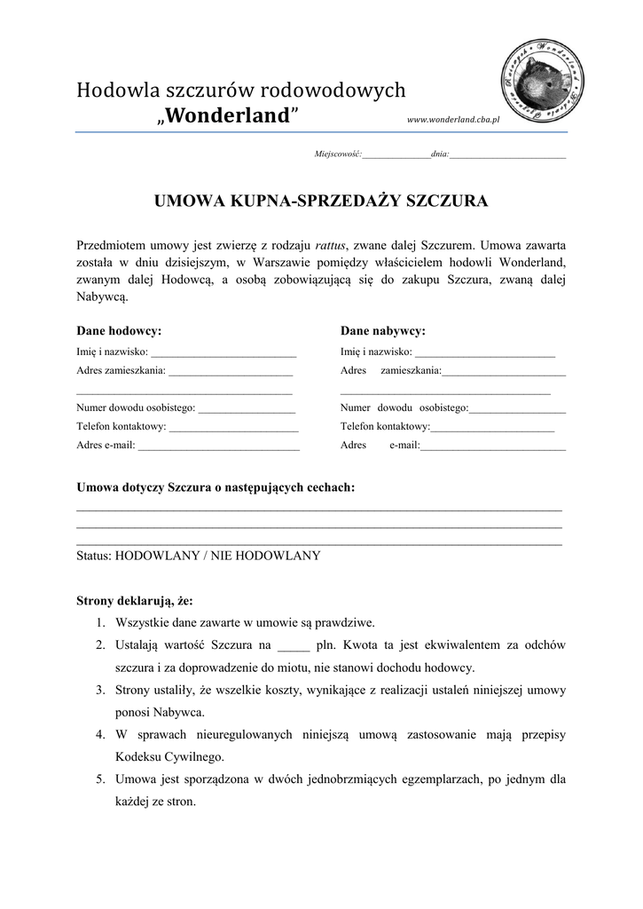 Hodowla szczurow rodowodowych „Wonderland” www.wonderland.cba.pl Miejscowość:________________dnia:___________________________ UMOWA KUPNA-SPRZEDAŻY SZCZURA Przedmiotem umowy jest zwierzę z rodzaju rattus, zwane dalej Szczurem. Umowa zawarta została w dniu dzisiejszym, w Warszawie pomiędzy właścicielem hodowli Wonderland, zwanym dalej Hodowcą, a osobą zobowiązującą się do zakupu Szczura, zwaną dalej Nabywcą. Dane hodowcy: Dane nabywcy: Imię i nazwisko: ___________________________ Imię i nazwisko: __________________________ Adres zamieszkania: _______________________ Adres ________________________________________ _______________________________________ Numer dowodu osobistego: __________________ Numer dowodu osobistego:__________________ Telefon kontaktowy: ________________________ Telefon kontaktowy:_______________________ Adres e-mail: ______________________________ Adres zamieszkania:_______________________ e-mail:___________________________ Umowa dotyczy Szczura o następujących cechach: ___________________________________________________________________________ ___________________________________________________________________________ ___________________________________________________________________________ Status: HODOWLANY / NIE HODOWLANY Strony deklarują, że: 1. Wszystkie dane zawarte w umowie są prawdziwe. 2. Ustalają wartość Szczura na _____ pln. Kwota ta jest ekwiwalentem za odchów szczura i za doprowadzenie do miotu, nie stanowi dochodu hodowcy. 3. Strony ustaliły, że wszelkie koszty, wynikające z realizacji ustaleń niniejszej umowy ponosi Nabywca. 4. W sprawach nieuregulowanych niniejszą umową zastosowanie mają przepisy Kodeksu Cywilnego. 5. Umowa jest sporządzona w dwóch jednobrzmiących egzemplarzach, po jednym dla każdej ze stron. Hodowca deklaruje, że: 1. Szczur w momencie wydawania do nowego domu jest zdrowy i dobrej kondycji, lub Nabywca został poinformowany o ewentualnych chorobach, czy problemach Szczura. 2. Szczur stanowi własność Hodowcy lub pochodzi z jego hodowli i jest wolny od wad prawnych oraz praw osób trzecich, nie toczy się żadne postępowanie, którego przedmiotem jest Szczur i nie jest on również przedmiotem zabezpieczenia. 3. W dniu odbioru, przenosi na rzecz Nabywcy własność Szczura, za kwotę równą wartości Szczura, ustalonej w niniejszej umowie. 4. Nie ponosi odpowiedzialności za ewentualne choroby, czy problemy Szczura, których objawy nie były widoczne i nie zostały zauważone przez żadną ze stron w dniu przekazania szczura. 5. Przez całe życie szczura, w miarę swoich możliwości, będzie służył radą w kwestii opieki, zdrowia i wychowania szczura. 6. Jeżeli Hodowca nie wywiąże się z postanowień niniejszej umowy, Nabywca będzie miał prawo zwrócić Szczura za kwotę równą wartości szczura ustalonej w niniejszej umowie lub zażądać rekompensaty w postaci połowy ceny szczura. Nabywca deklaruje, że: 1. Oświadczenie Hodowcy przyjmuje i potwierdza, że Szczura odbiera w dobrym stanie zdrowia i kondycji. 2. Zobowiązuje się do zapewnienia Szczurowi odpowiednich warunków życia, odpowiedniego żywienia, utrzymywania, pielęgnacji i opieki weterynaryjnej w przyszłości oraz do zdobycia wiedzy, która będzie do tego niezbędna. Będzie traktował Szczura z szacunkiem należnym żywemu zwierzęciu i nigdy nie przeznaczy go na pokarm. 3. Nie sprzeda, ani nie przekaże osobom trzecim Szczura. Jeśli z jakiegoś powodu nie będzie mógł się nim dłużej opiekować, zwróci się najpierw do Hodowcy, który ma w takiej sytuacji prawo pierwokupu, za kwotę nie wyższą niż 1/3 wartości Szczura ustalonej w niniejszej umowie. 4. Będzie regularnie informował Hodowcę o stanie zdrowia Szczura, w razie potrzeby udzieli dodatkowych informacji na jego temat, a także poinformuje Hodowcę o śmierci Szczura i o jej przyczynie. 5. Nigdy i pod żadnym pozorem, nie dopuści do rozmnożenia szczura, któremu Hodowca nadał status „NIE HODOWLANY”. Jeśli szczur otrzymał status „HODOWLANY” będzie mogła rozmnażać szczura na zasadach ustalonych z hodowcą, które są zapisane w „Ustaleniach dodatkowych”. 6. Jest osobą pełnoletnią lub uzyskał zgodę prawnego opiekuna na zakup Szczura. 7. Upewnił się, że w momencie zakupu nie istnieją żadne istotne przeciwskazania do przyjęcia pod swój dach Szczura. Przeciwwskazaniami takimi mogą być na przykład: rozpoznana alergia innego domownika, brak zgody właściciela mieszkania lub innych domowników na zakup Szczura, zakaz trzymania zwierząt w miejscu zamieszkania, brak środków na utrzymanie Szczura lub brak możliwości zapewnienia mu należytych warunków itp. 8. Nie ma nieszczerych intencji, nie chce oszukać Hodowcy, ani nie próbuje zataić ważnych dla Hodowcy informacji. 9. Nie będzie unikał kontaktu z Hodowcą i umożliwi Hodowcy sprawdzenie, czy postanowienia tej umowy są dotrzymywane. Jeśli dane kontaktowe Nabywcy ulegną zmianie, Hodowca zostanie o tym poinformowany. 10. Za niedochowanie lub nienależyte wykonanie któregokolwiek punktu postanowień umownych w każdym czasie, Hodowca może zażądać od każdego z nich kary umownej w wysokości 500pln, a także ma prawo do odkupu Szczura i całego jego potomstwa, za kwotę nie wyższą niż 1/3 wartości Szczura ustalonej w niniejszej umowie. Zapłata kary umownej nie zwalnia z dochodzenia innych roszczeń przez sprzedającego w tym np. roszczeń odszkodowawczych. Zapłata kary umownej nie zwalnia Nabywcy z dalszego dochowywania postanowień tej umowy. Ustalenia dodatkowe: ___________________________________________________________________________ ___________________________________________________________________________ ___________________________________________________________________________ ___________________________________________________________________________ ___________________________________________________________________________ _____