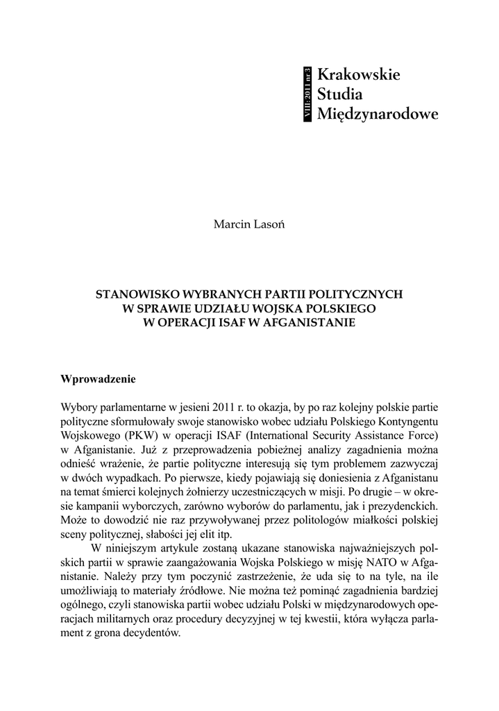 VIII: 2011 nr 3 Marcin Lasoń STANOWISKO WYBRANYCH PARTII POLITYCZNYCH W SPRAWIE UDZIAŁU WOJSKA POLSKIEGO W OPERACJI ISAF W AFGANISTANIE Wprowadzenie Wybory parlamentarne w jesieni 2011 r. to okazja, by po raz kolejny polskie partie polityczne sformułowały swoje stanowisko wobec udziału Polskiego Kontyngentu Wojskowego (PKW) w operacji ISAF (International Security Assistance Force) w Afganistanie. Już z przeprowadzenia pobieżnej analizy zagadnienia można odnieść wrażenie, że partie polityczne interesują się tym problemem zazwyczaj w dwóch wypadkach. Po pierwsze, kiedy pojawiają się doniesienia z Afganistanu na temat śmierci kolejnych żołnierzy uczestniczących w misji. Po drugie – w okresie kampanii wyborczych, zarówno wyborów do parlamentu, jak i prezydenckich. Może to dowodzić nie raz przywoływanej przez politologów miałkości polskiej sceny politycznej, słabości jej elit itp. W niniejszym artykule zostaną ukazane stanowiska najważniejszych polskich partii w sprawie zaangażowania Wojska Polskiego w misję NATO w Afganistanie. Należy przy tym poczynić zastrzeżenie, że uda się to na tyle, na ile umożliwiają to materiały źródłowe. Nie można też pominąć zagadnienia bardziej ogólnego, czyli stanowiska partii wobec udziału Polski w międzynarodowych operacjach militarnych oraz procedury decyzyjnej w tej kwestii, która wyłącza parlament z grona decydentów. 102 MARCIN LASOŃ Tekst oparty został na dostępnych źródłach. Szczególnie interesujące są programy partii politycznych, niestety, w większości wypadków niezbyt aktualne. Wymusza to także sięgnięcie po dokumentację obrad Sejmu RP i Komisji Obrony Narodowej, aby w ten sposób ustalić postawę poszczególnych partii. Istotne są także wypowiedzi polityków, szczególnie liderów partyjnych, które przy okazji wspomnianych wcześniej wydarzeń, zabierali głos w sprawie udziału PKW w misji afgańskiej. W literaturze przedmiotu temat ten przedstawiany jest zazwyczaj w sposób lakoniczny, ograniczający się do ogólnych stwierdzeń (np. B. Winid, Udział Polski w działaniach stabilizacyjnych w Afganistanie, „Polski Przegląd Dyplomatyczny” 2007, nr 1). Problem udziału parlamentu w procesie decyzyjnym Zacząć należy od kwestii podstawowej: jest nią określenie zakresu kompetencji parlamentu, związanych z decyzją o wysłaniu Wojska Polskiego w celu udziału w operacjach wojskowych poza granicami państwa. Przyjęta 17 grudnia 1998 r. ustawa mówi, że o użyciu sił zbrojnych za granicą państwa decyduje Prezydent RP na wniosek Rady Ministrów w następujących przypadkach: 1) udział w konflikcie zbrojnym lub dla wzmocnienia sił państwa albo państw sojuszniczych, 2) misja pokojowa. Natomiast na wniosek premiera, Prezydent RP wydaje postanowienie w sprawie ich udziału w akcji zapobieżenia aktom terroryzmu lub ich skutkom1. Dzięki tym zapisom parlament pozostaje wyłączony z procedury decyzyjnej, w jego kompetencji, zgodnie z artykułem 116 Konstytucji RP, jest bowiem podjęcie decyzji o stanie wojny i zawarciu pokoju. Afganistanowi nie wypowiedziano wojny, podobnie jak i Irakowi, w związku z tym w obu wypadkach parlament nie decydował ani w kwestii wysłania wojska do tych państw, ani przedłużania pobytu polskich kontyngentów w misjach stabilizacyjnych. Nie miał także bezpośredniego wpływu na wycofanie PKW Irak. Wspomniana ustawa z 1998 r. zobowiązuje tylko Prezydenta RP do niezwłocznego przekazania informacji o przyjętym postanowieniu marszałkom Sejmu i Senatu. Doświadczenia związane z misją iracką sprawiły, że w 2004 r. do Sejmu wpłynął projekt nowelizacji ustawy z 1998 r. o zmianie ustawy o zasadach użycia lub pobytu Sił Zbrojnych Rzeczypospolitej Polskiej poza granicami państwa, który proponował wprowadzenie Sejmu do grona decydentów. Ponadto precyzyjnie formułował, kiedy siły zbrojne mogą być użyte poza granicami państwa (gdy zwróci się o to ONZ, NATO lub państwo członkowskie ONZ)2. 1 Ustawa z 17 grudnia 1998 r. o zasadach użycia lub pobytu Sił Zbrojnych RP poza granicami państwa, Dz.U. 1998 r. Nr 162, poz. 1117. 2 Druk nr 3365, Projekt ustawy o zmianie ustawy o zasadach użycia lub pobytu Sił Zbrojnych Rzeczypospolitej Polskiej poza granicami państwa, Warszawa, 5 października 2004 r., www.sejm.gov.pl. STANOWISKO WYBRANYCH PARTII POLITYCZNYCH... 103 Nie został on jednak przyjęty. Nie była to ostatnia próba zmiany w procedurze decyzyjnej. Nad zmianami w tej materii debatowano na wspólnych obradach Komisji Obrony Narodowej i Spraw Zagranicznych 23 września 2009 r. Wtedy to poseł Ludwik Dorn przedstawił projekt ustawy o zmianie ustawy o zasadach użycia lub pobycie Sił Zbrojnych Rzeczypospolitej Polskiej poza granicami państwa, zakładający włączenie Sejmu do procedury decyzyjnej w sprawie wysyłania Wojska Polskiego na misje zagraniczne w dwóch pierwszych przypadkach, podawanych w ustawie z 1998 r. (udział w misjach pokojowych i w konflikcie zbrojnym toczącym się poza granicami Rzeczypospolitej Polskiej). W imieniu wnioskodawców proponował, by Rada Ministrów przed skierowaniem wniosku do Prezydenta RP, występowała do Sejmu o wyrażenie w drodze uchwały zgody, jeśli założony okres użycia sił zbrojnych przekracza 3 miesiące. Ponadto, zgodnie z projektem zasada ta obowiązywałaby także w wypadku przedłużania już trwających misji3. Podkreślić tu należy, że Sejm wyrażałby opinię, która nie byłaby wiążąca dla rządu (według konstytucjonalistów, wydanie zgody mogłoby bowiem naruszać zasadę trójpodziału władzy). Uzasadniano jednak, że już sama debata byłaby okazją do przedstawienia stanowiska głównych partii politycznych i tym samym do rozważenia decyzji, gdyby ich głos był inny niż Rady Ministrów. Co interesujące, L. Dorn za zasadne uznał zastrzeżenia rządu, że taka zmiana mogłaby wpłynąć na opóźnienie procesu decyzyjnego, dlatego w tym wzgl