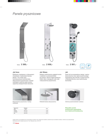 Panele prysznicowe Cena: 3 300,- Cena: 2 950,- Cena: 2 501,CLEANER CHROME EASYCLEAN Jet Inox Jet Glass Jet Efektownynierdzewnyoluksusowym charakterzeibezkompromisowej jakości.Trzystrefydysz rozmieszczonychpromieniście, deszczownicaprysznicowaifunkcja wodospadwgórnejczęścipanelu zapewniąniezapomnianedoznania. Szklanewykończeniewyglądakrucho isubtelniewprzeciwieństwie doprzeżyć,którychkąpieldostarczy. Osiemdyszmasującychcałeciało ideszczownicaprysznicowa. PanelJetmasprawdzonydesignioprócz deszczownicyorazwężaprysznicowego, wyposażonyjestrównieżwdyszeboczne zblokadąkierunkuoraztrzyfunkcyjną słuchawkę. Deszczownicaprysznicowaifunkcja wodospad Wielkoformatowadeszczownica Ochronaprzedkamieniemwodnym. Oznaczenie (typ) Rozmiary (mm) Cena Jet Inox 260x1610 3 300 Jet Glass 270x1500 2 950 Jet 290x1450 2 501 Wszystkie panele prysznicowewyposażone sąwbateriętermostatyczną. Uwaga!Panelenieposiadająpompwzmacniającychprzepływwody,efektywnośćdziałaniauzależnionajestoddziałaniainstalacjiiciśnieniaorazprzepustowości Standardowytermindostawywynosido14dni.Zalecanecenyz23%VAT. 104 Prysznice Długotrwała przyjemność i zadowolenie Piękny design nie pełni tylko funkcji estetycznej, ale gwarantuje także odporność całego mechanizmu, długą żywotność, niższe zużycie wody, łatwe czyszczenie i konserwację. SOFTRAIN CLEANER CHROME EASYCLEAN 256 SoftRain jest technologią, która umożliwia automatyczne zasysanie powietrza do prysznica, zmniejszając w ten sposób zużycie wody. Woda wzbogacona powietrzem zwiększa przyjemność kąpieli Do czyszczenia baterii użyj RAVAK Cleaner Chrome lub innego nieagresywnego środka, który nienaruszy powierzchniowej warstwy chromu. Funkcja łatwego czyszczenia drobnych dysz prysznica. Delikatnym ruchem ręki można zetrzeć osadzający się kamień wodny z powierzchni dysz. Prysznice nowość Deszczownica prysznicowa okrągłamosiężna Deszczownica prysznicowa okrągłamosiężna 300 mm 980.00 Cena: 200 mm 981.00 1144,- Cena: Cena: 148,- nowość średnica108mm 952.00 Cena: 86,- Słuchawka 3 funkcje średnica118mm 953.00 Cena: 62,- SłuchawkaMgła 3 funkcje średnica120mm 956.00 Cena: 105,- 703.00 długośćramienia20cm 70,- 704.00 długośćramienia30cm 90,- 705.00 długośćramienia50cm 111,- nowość Słuchawka Chrome 1 funkcja 957.00 Cena: 117,- Słuchawka owalna mini 1 funkcja Zużycie6,5l naminutę 954.00 Cena: Zestaw–wąż 150 cm, słuchawka, łącznikmały średnica68mm 901.00 Cena: 76,- 1144,- Ramięsufitowedomodelu 980.00, 981.00 a 982.00 702.00 Słuchawka 5 funkcjí kwadratowa300mm, 982.00 490,- Ramięboczne do typu 980.00, 981.00 i 982.00 Cena: Deszczownica Slim, Chrome 80,- Zestawprysznicowy-wąż zwytrzymałegotworzywa 150cm,słuchawka 3funkcje,drążek przesuwny - 70 cm nowość Zestaw prysznicowy przesuwny DS090.00 902.00 Cena: 330,- Cena: 1009,- UWAGA!Nowościdostępnebędąwsprzedażyod08/2015. Standardowytermindostawywynosido14dni. Zalecanecenyz23%VAT. 257 Akcesoria Wysoka jakość materiałów i długa żywotność Wybierz odpowiednie akcesoria do baterii wannowych, prysznicowych, podtynkowych i termostatycznych. Sprawdzone materiały i powierzchniowa warstwa chromu zapewnią długą żywotność. EASYTWIST CLEANER CHROME 258 EasyTwist zapobiega skręcaniu się węża umożliwiając swobodne okręcanie słuchawki prysznica. Do czyszczenia baterii i akcesoriów zalecamy RAVAK Cleaner Chrome lub inny nieagresywny środek czyszczący, który nie uszkodzi chromowanej powierzchni Akcesoria Wążprysznicowy 150 cm Wążprysznicowy 150 cm nierdzewny, jednozamkowy 911.00 Cena: z tworzywa sztucznego 912.50 Cena: 37,- Ścienneujście prysznica 701.00 Cena: 129,- 80,- Wążprysznicowy 150 cm SatinFlex z tworzywa sztucznego 913.00 Cena: 105,- EASYTWIST Mosiężnyuchwyt prysznicowy zpodłączeniem dowęża 706.00 Cena: 165,- nowość Uchwyt z tworzywa sztucznego 610.00 Cena: 10,- EASYTWIST Uchwyt prysznicowy pozycjonowany, Chrome, z przegubem 611.00 Cena: 55,- nowość Drążek z przesuwnym uchwytem prysznica–60cm Drążek z przesuwnym uchwytem prysznica, Chrome 70 cm 972.00 974.00 Cena: Cena: 97,- 242,- Drążek z przesuwnym uchwytem prysznica–90cm, obrotowy 973.00 Cena: 225,- Drążekprysznicowyodługości90cmdoceniąrodzinyzdziećmi. Możliwośćregulowaniawysokościumocowaniasłuchawki prysznicowejumożliwiprzyjemnyprysznicosobomoróżnym wzroście. Uwaga!Produkt974.00dostępnywsprzedażyod08/2015. Standardowytermindostawywynosido14dni.Zalecanecenyz23%VAT. 259