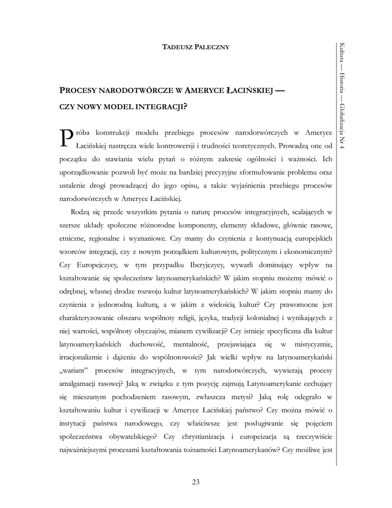 PROCESY NARODOTWÓRCZE W AMERYCE ŁACIŃSKIEJ — CZY NOWY MODEL INTEGRACJI? P róba konstrukcji modelu przebiegu procesów narodotwórczych w Ameryce Łacińskiej nastręcza wiele kontrowersji i trudności teoretycznych. Prowadzą one od początku do stawiania wielu pytań o różnym zakresie ogólności i ważności. Ich uporządkowanie pozwoli być może na bardziej precyzyjne sformułowanie problemu oraz ustalenie drogi prowadzącej do jego opisu, a także wyjaśnienia przebiegu procesów narodotwórczych w Ameryce Łacińskiej. Rodzą się przede wszystkim pytania o naturę procesów integracyjnych, scalających w szersze układy społeczne różnorodne komponenty, elementy składowe, głównie rasowe, etniczne, regionalne i wyznaniowe. Czy mamy do czynienia z kontynuacją europejskich wzorców integracji, czy z nowym porządkiem kulturowym, politycznym i ekonomicznym? Czy Europejczycy, w tym przypadku Iberyjczycy, wywarli dominujący wpływ na kształtowanie się społeczeństw latynoamerykańskich? W jakim stopniu możemy mówić o odrębnej, własnej drodze rozwoju kultur latynoamerykańskich? W jakim stopniu mamy do czynienia z jednorodną kulturą, a w jakim z wielością kultur? Czy prawomocne jest charakteryzowanie obszaru wspólnoty religii, języka, tradycji kolonialnej i wynikających z niej wartości, wspólnoty obyczajów, mianem cywilizacji? Czy istnieje specyficzna dla kultur latynoamerykańskich duchowość, mentalność, przejawiająca się w mistycyzmie, irracjonalizmie i dążeniu do wspólnotowości? Jak wielki wpływ na latynoamerykański „wariant” procesów integracyjnych, w tym narodotwórczych, wywierają procesy amalgamacji rasowej? Jaką w związku z tym pozycję zajmują Latynoamerykanie cechujący się mieszanym pochodzeniem rasowym, zwłaszcza metysi? Jaką rolę odegrało w kształtowaniu kultur i cywilizacji w Ameryce Łacińskiej państwo? Czy można mówić o instytucji państwa narodowego, czy właściwsze jest posługiwanie się pojęciem społeczeństwa obywatelskiego? Czy chrystianizacja i europeizacja są rzeczywiście najważniejszymi procesami kształtowania tożsamości Latynoamerykanów? Czy możliwe jest 23 Kultura — Historia — Globalizacja Nr 4 TADEUSZ PALECZNY Tadeusz Paleczny, Procesy narodotwórcze w Ameryce Łacińskiej… zastosowanie praw modelu westernizacji, globalizacji czy amerykanizacji w odniesieniu do kultur Ameryki Łacińskiej? Czy Stany Zjednoczone narzuciły Ameryce Łacińskiej koncepcję rozwoju „zależnego”? Czy ta koncepcja realizuje się poza gospodarką, państwem także w zakresie procesów narodotwórczych? Czy można charakteryzować relatywnie wysoce zintegrowane społecznie i zakulturowane społeczeństwa obywatelskie Ameryki Łacińskiej w kategoriach narodów-państw czy narodów-kultur? Porządkując zarówno postawione, jak i nie zadane pytania, wyodrębniam w tekście następujące obszary analizy: 1. Czy latynoamerykańskie kultury rdzenne, reprezentowane przez ludy autochtoniczne, mogą aktualnie rozwijać się w kierunku społeczeństw narodowych? Czy mamy raczej do czynienia z dominację więzi typu prenarodowego? Czy społeczeństwa latynoamerykańskie — przy całej ich złożoności — przekształcają się w zbiorowości względnie homogenicznej kultury narodowej, czy raczej heterogenicznej, pluralistycznej cywilizacji? Co dzieje się w procesach narodotwórczych z lokalnymi społecznościami ludów autochtonicznych, jak również z grupami etnicznymi utworzonymi przez imigrantów europejskich i azjatyckich? Czy kultury te ulegają homogenizacji, zanikowi i redukcji do tożsamości typu brazylijskiej czy meksykańskiej identyfikacji narodowej, czy raczej wyłaniają się nowe obszary więzi, charakteryzujące społeczeństwa złożone kulturowo, pluralistyczne? Czy w równym tempie i stopniu integrują się i nacjonalizują kategorie białych, jak i kolorowych Latynoamerykanów? 2. Jakie mechanizmy zadecydowały o przebiegu rozwoju procesów integracyjnych w krajach Ameryki Łacińskiej? Czy można wyodrębnić jakościowo odrębne fazy tych procesów? Czy iberyzacja i chrystianizacja należą do najważniejszych procesów kształtowania tożsamości kulturowej Latynoamerykanów? Jaką rolę w latynoamerykańskich procesach narodotwórczych odegrały zjawiska metysażu, indygenizmu, panindianizmu, czy też panamerykanizmu? 3. Czy społeczeństwa latynoamerykańskie są kontynuacją europejskich wzorców integracji, powielają występujące na starym kontynencie prawa procesów narodotwórczych? Czy wybierają i kształtują własną drogę więzi kulturowej, obywatelskiej i cywilizacyjnej? W jakim stopniu można mówić o istnieniu oryginalnych, odrębnych, wynikających z natury społeczeństw latynoamerykańskich praw procesów asymilacji? 24 Czy mamy w Ameryce Łacińskiej do czynienia z narodami? Jeżeli tak, to w jakim zakresie i sensie? Czy zróżnicowanie rasowe, etniczne i regionalne nie stanowi istotnej bariery w przekształcaniu się złożonych, wielokulturowych, wysoce niejednorodnych i zdezintegrowanych socjalnie, niestabilnych gospodarczo, rozwarstwionych strukturalnie społeczeństw obywatelskich w kultury narodowe? Jaki jest poziom etnocentryzmu i nacjonalizmu w ideologiach i tożsamościach Latynoamerykanów? Czy można mówić o opozycji pomiędzy europejskim monocentryzmem konserwatywnych elit politycznych i kulturowych białych mniejszości, a polimorfizmem, pluralizmem liberalnie zorientowanych mieszanych rasowo i „kolorowych” Latynoamerykanów? Wyznaczone przez cztery grupy pytań obszary analizy, pozwolą na uporządkowanie pojęć i opisu natury i przebiegu procesów narodotwórczych w Ameryce Łacińskiej. Naród czy społeczeństwo obywatelskie, kultura czy cywilizacja, wielokulturowość i pluralizm, czy monocentryzm i homogenizacja, konserwatywny czy liberalny model rozwoju, iberyzacja i przymusowy asymilacjonizm, czy integracja i dobrowolna akulturacja, 