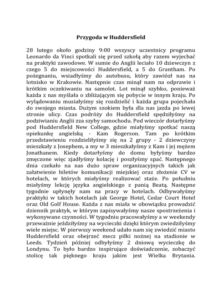 Przygoda w Huddersfield 28 lutego około godziny 9:00 wszyscy uczestnicy programu Leonardo da Vinci spotkali się przed szkołą aby razem wyjechać na praktyki zawodowe. W sumie do Anglii leciało 10 dziewczyn z czego 5 do miejscowości Huddersfield, a 5 do Grantham. Po pożegnaniu, wsiadłyśmy do autobusu, który zawiózł nas na lotnisko w Krakowie. Następnie czas minął nam na odprawie i krótkim oczekiwaniu na samolot. Lot minął szybko, ponieważ każda z nas myślała o zbliżającym się pobycie w innym kraju. Po wylądowaniu musiałyśmy się rozdzielić i każda grupa pojechała do swojego miasta. Dużym szokiem była dla nas jazda po lewej stronie ulicy. Czas podróży do Huddersfield spędziłyśmy na podziwianiu Anglii zza szyby samochodu. Pod wieczór dotarłyśmy pod Huddersfield New College, gdzie miałyśmy spotkać naszą opiekunkę angielską - Kam Rogerson. Tam po krótkim przedstawieniu rozdzieliłyśmy się na 2 grupy - 2 dziewczyny mieszkały z Josephem, a my w 3 mieszkałyśmy z Kam i jej mężem Jonathanem. Kiedy dotarłyśmy do domu byłyśmy bardzo zmęczone więc zjadłyśmy kolację i poszłyśmy spać. Następnego dnia czekało na nas dużo spraw organizacyjnych takich jak załatwienie biletów komunikacji miejskiej oraz złożenie CV w hotelach, w których miałyśmy realizować staże. Po południu miałyśmy lekcję języka angielskiego z panią Beatą. Następne tygodnie upłynęły nam na pracy w hotelach. Odbywałyśmy praktyki w takich hotelach jak George Hotel, Cedar Court Hotel oraz Old Golf House. Każda z nas miała w obowiązku prowadzić dziennik praktyk, w którym zapisywałyśmy nasze spostrzeżenia i wykonywane czynności. W tygodniu pracowałyśmy a w weekendy przeważnie jeździłyśmy na wycieczki dzięki którym zwiedziłyśmy wiele miejsc. W pierwszy weekend udało nam się zwiedzić miasto Huddersfield oraz obejrzeć mecz piłki nożnej na stadionie w Leeds. Tydzień później odbyłyśmy 2 dniową wycieczkę do Londynu. To było bardzo inspirujące doświadczenie, zobaczyć stolicę tak pięknego kraju jakim jest Wielka Brytania. Widziałyśmy Pałac Buckingham, Big Bena, a także oglądałyśmy panoramę Londynu z London Eye. Udało nam się zasmakować różnych potraw. Bardzo ciekawie było również w Muzeum Manadme Tussauds, gdzie oglądałyśmy figury woskowe sławnych ludzi. Kolejne weekendy spędziłyśmy na zwiedzaniu miast takich jak Leeds, Manchester, oraz York. Każda z nas była zachwycona atmosferą panującą w tych miastach. W hotelach pracowałyśmy jako pokojowe, kelnerki, recepcjonistki oraz pomoc kuchenna. Każda z nas była bardzo zadowolona z pracy, ponieważ pracownicy byli bardzo mili i pomocni, a my dużo się przy nich nauczyłyśmy. Gdy przyszedł czas powrotu wszystkim było bardzo smutno, gdyż te 5 tygodni minęły bardzo szybko. Po pożegnaniu z pracownikami i dyrekcjami hoteli pojechałyśmy pod Huddersfield New College aby pojechać razem na lotnisko Doncaster/Sheffield. Tam spotkałyśmy się z dziewczynami, które mieszkały w Grantham i razem wróciłyśmy do Polski. Każda z nas była bardzo zadowolona z czasu spędzonego w Anglii. Karolina Adamiec 3dt
