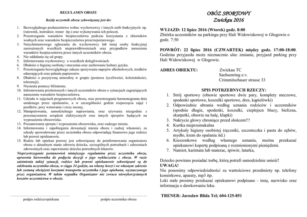 OBÓZ SPORTOWY Zwickau 2016 REGULAMIN OBOZU Każdy uczestnik obozu zobowiązany jest do: Bezwzględnego posłuszeństwa wobec wychowawcy i innych osób funkcyjnych: np. (ratownik, instruktor, trener itp.) oraz wykonywania ich poleceń. 2. Przestrzegania warunków bezpieczeństwa podczas korzystania z zbiorników wodnych oraz warunków bezpieczeństwa przeciwpożarowego. 3. Natychmiastowego zgłaszania do wychowawcy lub innej osoby funkcyjnej zauważonych wszelkich nieprawidłowościach oraz przypadków naruszenia warunków bezpieczeństwa przez innych uczestników obozu. 4. Nie oddalania się od grupy. 5. Informowania wychowawcy o wszelkich dolegliwościach. 6. Dbałości o higienę osobistą i otoczenia oraz zachowanie kultury języka. 7. Przestrzegania bezwzględnego zakazu spożywania napojów alkoholowych, środków odurzających oraz palenia papierosów. 8. Dbałości o pozytywną atmosferę w grupie (postawa życzliwości, koleżeńskości, tolerancji). 9. Niesienia pomocy bliźniemu. 10. Informowania przełożonych i innych uczestników obozu o sytuacjach zagrażających naruszeniu warunków bezpieczeństwa. 11. Udziału w zajęciach programowych obozu, oraz przestrzegania harmonogramu dnia ustalonego przez opiekunów, a w szczególności godzin rozpoczęcia zajęć i posiłków, pory wstawania i ciszy nocnej, 12. Manipulowania, samodzielnego naprawiania, oraz używania niezgodnie z przeznaczeniem urządzeń elektrycznych oraz innych sprzętów będących na wyposażeniu obozowiska. 13. Poszanowania sprzętu i wyposażenia obozowiska, oraz cudzego mienia. 14. Informowania i zapobiegania dewastacji mienia obozu i cudzej własności, za szkody spowodowane przez uczestnika obozu odpowiadają finansowo jego rodzice lub prawni opiekunowie. 15. Rodzic lub opiekun prawny jest zobowiązany do poinformowania organizatora obozu o aktualnym stanie zdrowia dziecka, szczególnych potrzebach i zaleceniach zdrowotnych oraz zapewnienie dziecku potrzebnych lekarstw. Nieprzestrzeganie postanowień niniejszego regulaminu przez uczestnika obozu, uprawnia kierownika do podjęcia decyzji o jego wykluczeniu z obozu. W razie zaistnienia takiej sytuacji, rodzice lub prawni opiekunowie zobowiązani są do odebrania uczestnika obozu, w ciągu 24 godzin, na własny koszt i we własnym zakresie lub zostaną obciążeni kosztami transportu uczestnika i jego opiekuna, wyznaczonego przez organizatora. W takim wypadku Organizator nie zwraca niewykorzystanych kosztów uczestnictwa w obozie. 1. …………………………………………. podpis rodzica/opiekuna …………………………………………. podpis uczestnika obozu WYJAZD: 12 lipiec 2016 (Wtorek) godz. 8:00 Zbiórka uczestników na parkingu przy Hali Widowiskowej w Głogowie o godz. 7:50 POWRÓT: 22 lipiec 2016 (CZWARTEK) między godz. 17:00-18:00. Godzina przyjazdu może nieznacznie ulec zmianie, przyjazd parking przy Hali Widowiskowej w Głogowie. ADRES OBIEKTU: 1. 2. 3. 4. 5. 6. 7. Zwickau TC Sachsenring e.v. Crimmitschauer strasse 33 SPIS POTRZEBNYCH RZECZY: Strój sportowy (obuwie sportowe dwie pary, komplety meczowe, spodenki sportowe, koszulki sportowe, dres, kąpielówki) Odpowiednie ubrania według uznania rodziców i uczestników (spodnie długie, spodenki, koszulki, cieplejsze bluzy, bielizna, skarpetki, obuwie na halę, klapki) Nakrycie głowy chroniące przed słońcem!!! Kurtka nieprzemakalna Artykuły higieny osobistej (ręczniki, szczoteczka i pasta do zębów, mydło, krem do opalania itd.) Kieszonkowe według własnego uznania, można przekazać opiekunowi kopertę podpisaną z rozmienionymi pieniędzmi. Namiot, karimata lub materac, śpiwór, latarka, Dziecko powinno posiadać torbę, którą potrafi samodzielnie unieść! UWAGA! Nie ponosimy odpowiedzialności za wartościowe przedmioty np. telefony komórkowe, aparaty, mp3 itp. Leki stałe prosimy przekazać opiekunowi podpisane - imię, nazwisko oraz informacja o dawkowaniu leku. TRENER: Jarosław Blida Tel; 604-125-851