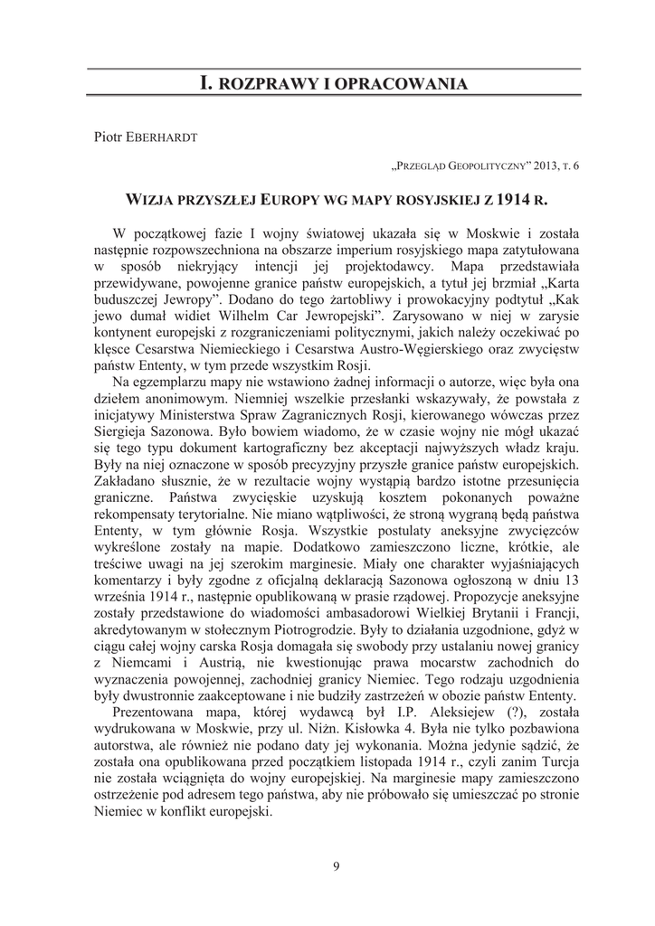 I. ROZPRAWY I OPRACOWANIA Piotr EBERHARDT „PRZEGLĄD GEOPOLITYCZNY” 2013, T. 6 WIZJA PRZYSZŁEJ EUROPY WG MAPY ROSYJSKIEJ Z 1914 R. W początkowej fazie I wojny światowej ukazała się w Moskwie i została następnie rozpowszechniona na obszarze imperium rosyjskiego mapa zatytułowana w sposób niekryjący intencji jej projektodawcy. Mapa przedstawiała przewidywane, powojenne granice państw europejskich, a tytuł jej brzmiał „Karta buduszczej Jewropy”. Dodano do tego żartobliwy i prowokacyjny podtytuł „Kak jewo dumał widiet Wilhelm Car Jewropejski”. Zarysowano w niej w zarysie kontynent europejski z rozgraniczeniami politycznymi, jakich należy oczekiwać po klęsce Cesarstwa Niemieckiego i Cesarstwa Austro-Węgierskiego oraz zwycięstw państw Ententy, w tym przede wszystkim Rosji. Na egzemplarzu mapy nie wstawiono żadnej informacji o autorze, więc była ona dziełem anonimowym. Niemniej wszelkie przesłanki wskazywały, że powstała z inicjatywy Ministerstwa Spraw Zagranicznych Rosji, kierowanego wówczas przez Siergieja Sazonowa. Było bowiem wiadomo, że w czasie wojny nie mógł ukazać się tego typu dokument kartograficzny bez akceptacji najwyższych władz kraju. Były na niej oznaczone w sposób precyzyjny przyszłe granice państw europejskich. Zakładano słusznie, że w rezultacie wojny wystąpią bardzo istotne przesunięcia graniczne. Państwa zwycięskie uzyskują kosztem pokonanych poważne rekompensaty terytorialne. Nie miano wątpliwości, że stroną wygraną będą państwa Ententy, w tym głównie Rosja. Wszystkie postulaty aneksyjne zwycięzców wykreślone zostały na mapie. Dodatkowo zamieszczono liczne, krótkie, ale treściwe uwagi na jej szerokim marginesie. Miały one charakter wyjaśniających komentarzy i były zgodne z oficjalną deklaracją Sazonowa ogłoszoną w dniu 13 września 1914 r., następnie opublikowaną w prasie rządowej. Propozycje aneksyjne zostały przedstawione do wiadomości ambasadorowi Wielkiej Brytanii i Francji, akredytowanym w stołecznym Piotrogrodzie. Były to działania uzgodnione, gdyż w ciągu całej wojny carska Rosja domagała się swobody przy ustalaniu nowej granicy z Niemcami i Austrią, nie kwestionując prawa mocarstw zachodnich do wyznaczenia powojennej, zachodniej granicy Niemiec. Tego rodzaju uzgodnienia były dwustronnie zaakceptowane i nie budziły zastrzeżeń w obozie państw Ententy. Prezentowana mapa, której wydawcą był I.P. Aleksiejew (?), została wydrukowana w Moskwie, przy ul. Niżn. Kisłowka 4. Była nie tylko pozbawiona autorstwa, ale również nie podano daty jej wykonania. Można jedynie sądzić, że została ona opublikowana przed początkiem listopada 1914 r., czyli zanim Turcja nie została wciągnięta do wojny europejskiej. Na marginesie mapy zamieszczono ostrzeżenie pod adresem tego państwa, aby nie próbowało się umieszczać po stronie Niemiec w konflikt europejski. 9 „Mapa przyszłej Europy. Jak ją nie zamierza widzieć Wilhelm „Car Europejski” Moskwa, 1914 r. Przypominany dokument kartograficzny nie miał więc charakteru oficjalnego, gdyż nie był sygnowany przez powołaną do tego instytucję państwową, dysponującą odpowiednimi pełnomocnictwami. Pomimo tego nie można go dyskwalifikować i odbierać mu wiarygodności historycznej. Powstał za wiedzą, a przypuszczalnie nawet z inspiracji naczelnych władz cywilnych i wojskowych Rosji, które nie ukrywały swoich zamierzeń politycznych i programów terytorialnych. Liczono na stosunkowo szybkie pokonanie Państw Centralnych. Po ich druzgocącej klęsce miała nastąpić weryfikacja granic politycznych, wiążąca się z przyłączeniem do Rosji nowych zdobyczy terytorialnych. Mapa więc jest ilustracją imperialnych planów Rosji wobec swoich przeciwników i sąsiadów. Realizacja tego programu uzależniona była od wyników wojny, która jednak nie przebiegała według optymistycznych przewidywań rosyjskiego sztabu generalnego. Porażka dwóch armii rosyjskich w Prusach Wschodnich oraz stopniowe wycofywanie się z terytorium Królestwa Polskiego zdezaktualizowało opracowany 10 projekt zmian terytorialnych w Europie. W miarę upływu czasu mapa traciła swą wartość polityczną i propagandową. Niepowodzenia na froncie i przesuwanie się armii niemieckiej na wschód wpływało na zmianę stanowiska władz rosyjskich. Trudna sytuacja wewnątrz kraju też działała tonująco na rosyjską elitę przywódczą. Coraz bardziej uzasadniona stawała się koncepcja powrotu do granic przedwojennych wg stanu z 1914 r. Przypominanie i imperialnych programach terytorialnych działało na szkodę interesów rosyjskich. Mapa więc została wycofana z obiegu publicznego i do niej już nie powracano. Strona rosyjska coraz bardziej zabiegała o zachowanie status quo granicznego. Dalsze wydarzenia związane z rewolucją i upadkiem caratu wpłynęły na jej całkowitą dezaktualizację. Zawarty pokój w Brześciu był potwierdzeniem pełnej katastrofy militarnej państwa rosyjskiego. W tak zmienionych warunkach mapa zatraciła swoją wartość polityczną. Została ona stosunkowo szybko zapomniana przez historyków i geografów. W bogatej literaturze przedmiotu odniesionej do wydarzeń związanych z wojną światową niewiele wspomina się o programach i zamierzeniach aneksyjnych Rosji. Nie miały bowiem one konsekwencji politycznych. Z tego też powodu uległa zatarciu wiedza o opublikowanej w 1914 r. mapie oraz jej wymowie ideowej i geopolitycznej. Przypuszczalnie pierwszym polskim badaczem, który podał to polityczne i kartograficzne działo ogólnej interpretacji naukowej był K. Rosen-Zawadzki1. W opublikowanym artykule zamieścił odbitkę mapy w dość prymitywnej technice czarno-białej. Nie jest ona zbyt wyraźna, gdyż ukazane rozgraniczenia są zamazane. Kartogram ten stał się w późniejszym czasie obiektem zainteresowania autora niniejszego artykułu, który skoncentrował uwagę wyłącznie na granic