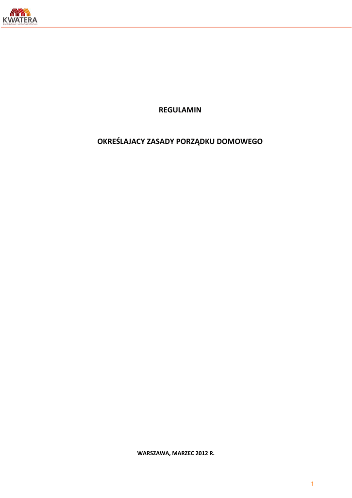 REGULAMIN OKREŚLAJACY ZASADY PORZĄDKU DOMOWEGO WARSZAWA, MARZEC 2012 R. 1 REGULAMIN OKREŚLAJACY ZASADY PORZĄDKU DOMOWEGO §1 PRZEPISY OGÓLNE 1. Lokal mieszkalny i pomieszczenie przynależne winny być użytkowane zgodnie z ich przeznaczeniem. 2. Osoby przebywające na terenie nieruchomości obowiązane są do zachowania ciszy w godzinach nocnych, tj. od godz. 22.00 do 6.00. W godzinach tych w szczególności należy powstrzymać się od głośnego odbioru radia i telewizji oraz zaprzestać głośnej gry na instrumentach muzycznych, a także głośnego śpiewu. W szczególnie uzasadnionych przypadkach Wojskowe TBS „KWATERA” Sp. z o.o.(dalej jako: WTBS) może ograniczyć korzystanie z dźwigu w godzinach 22.00 – 6.00, jeśli spowoduje to zakończenie zakłócania ciszy nocnej. 3. Mieszkańcy mogą korzystać z urządzeń lub pomieszczeń służących do użytku użytkowników mieszkań na warunkach określonych obowiązującymi przepisami, umową najmu oraz niniejszym regulaminem. 4. W okresie gwarancji mieszkańcy mają bezwzględny zakaz dokonywania jakichkolwiek napraw, usuwania usterek, wad oraz ingerencji w substancję budowlaną. Jakiekolwiek prace tego rodzaju wymagają uprzedniego zgłoszenia do WTBS i uzyskania jej pisemnej zgody. 5. W niedziele i święta zabrania się wykonywania remontów, zakłócających spokój innym mieszkańcom. 6. Trzepanie dywanów może odbywać się w miejscach do tego przeznaczonych w dni powszednie, w godzinach od 8.00 - 20.00. 7. Nie wolno trzepać dywanów, pościeli, ubrań itp. na balkonach, loggiach oraz w klatkach schodowych, korytarzach i w oknach. 8. Nieczystości pochodzące z gospodarstw domowych należy wrzucać do pojemników ustawionych w altanach śmietnikowych w taki sposób, aby nie zanieczyszczać altan. 9. Nieczystości dużych rozmiarów /tzw. gabaryty/ wywożone są w wyznaczonych terminach. Informacja o dniu i dacie podstawienia pojemników zostanie wywieszona na tablicach informacyjnych w budynku /ach/. Osoby pozbywające się gabarytów w innym terminie zobowiązane są pokryć koszty składowania i wywózki we własnym zakresie. Ustawianie gabarytów pod altaną śmietnikową poza wyznaczonymi terminami jest zabronione. 10. Nie wolno wyrzucać przez okno jakichkolwiek śmieci, niedopałków, papierosów itp. 11. Wykonywanie przez mieszkańców czynności mogących spowodować uszkodzenie ścian lub posadzek na klatkach schodowych jest niedopuszczalne. Odpowiedzialność za tego typu szkody ponoszą użytkownicy klatek schodowych budynku. 12. Niedopuszczalne jest wykonywanie przez mieszkańców czynności mogących spowodować zanieczyszczenie miejsc służących do wspólnego użytku takich jak: klatki schodowe, korytarze piwnic, ciągów komunikacyjnych w garażach wielostanowiskowych, w kabinach dźwigów (w przypadku jeżeli budynek jest wyposażony w takie urządzenie) oraz wokół budynków i przy zbiornikach na składowanie nieczystości itp. Jakiekolwiek szkody i zanieczyszczenia dokonane w nieruchomości przez użytkowników mieszkań lub ich gości naprawiane będą na ich koszt. 2 REGULAMIN OKREŚLAJACY ZASADY PORZĄDKU DOMOWEGO 13. Instalowanie anten telewizyjnych, radiowych nastąpić może tylko na podstawie uprzedniej pisemnej zgody WTBS. Koszt naprawy wszelkich uszkodzeń związanych z montażem anten ponosi użytkownik lokalu. 14. Niedozwolone jest prowadzenie hodowli zwierząt, drobiu, gołębi wewnątrz budynku jak i na terenie nieruchomości, z zastrzeżeniem pkt 15. 15. W lokalu mieszkalnym dozwolone jest posiadanie psów i kotów, o ile liczba tych zwierząt nie wskazuje na prowadzenie hodowli i nie powoduje zagrożenia zdrowia lub życia lub zakłócania spokoju mieszkańców. Posiadacze kotów i psów zobowiązani są do przestrzegania przepisów sanitarno - porządkowych. Poza teren lokalu psy wyprowadzane winny być w kagańcach i na smyczy. 16. Zabronione jest wykonywanie przez mieszkańców budynku jakichkolwiek zmian w elewacji zewnętrznej budynku, włączając zawieszanie na balkonach transparentów, szyldów, ogłoszeń itp., bez wcześniejszej pisemnej zgody WTBS. Za spowodowanie zniszczenia elewacji, ścian lub drzwi wejściowych odpowiedzialność, w tym odpowiedzialność materialną, ponoszą pełnoletni sprawcy lub rodzice (opiekunowie) małoletnich sprawców. 17. Nie jest dozwolone przechowywanie na balkonach przedmiotów oszpecających wygląd budynku. 18. Mieszkańcy obowiązani są do usuwania śmieci, a w zimie śniegu i lodu z balkonów i pomieszczeń przynależnych do lokali, z zachowaniem należytej ostrożności. 19. Nie jest dopuszczalne umieszczanie przez mieszkańców żadnych przedmiotów w miejscach wspólnego użytkowania takich jak bramy, klatki schodowe, podwórza. WTBS nie ponosi odpowiedzialności za utratę bądź uszkodzenie przedmiotów pozostawionych przez użytkowników w ww. miejscach. 20. Parkowanie pojazdów motocyklowych i samochodowych jest dopuszczalne tylko w miejscach wyznaczonych przez WTBS. W szczególności zabronione jest parkowanie samochodów w miejscach, które utrudniłoby swobodny dostęp do budynku pogotowiu ratunkowemu, Policji, Straży Pożarnej lub Straży Miejskiej. Nie jest dozwolone mycie, sprzątanie lub prowadzenie jakichkolwiek innych prac przy samochodzie na terenie nieruchomości. 21. Jazda pojazdów mechanicznych po chodnikach i ścieżkach jest zabroniona. 22. Motocykli, skuterów, motorowerów, rowerów i wózków nie wolno przechowywać w klatkach schodowych ani w korytarzach piwnic. 23. Plakatowanie, wywieszanie informacji, ogłoszeń, reklam, ofert w budynkach i na terenie osiedla mieszkaniowego - wymaga uprzedniej pisemnej zgody WTBS. 24. Skrzynki na rośliny, doniczki itp. umieszczane na parapetach okien, balkonach i logiach powinny być należycie zabezpieczone przed wypadnięciem. Podlewanie roślin umieszczonych na balkonach, logiach powinno odbywać się w taki sposób, aby strugi wody zmieszane z ziemią nie niszcz