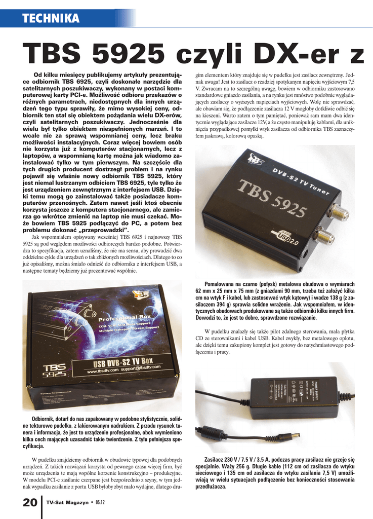 TECHNIKA TBS 5925 czyli DX-er z Od kilku miesięcy publikujemy artykuły prezentujące odbiornik TBS 6925, czyli doskonałe narzędzie dla satelitarnych poszukiwaczy, wykonany w postaci komputerowej karty PCI-e. Możliwość odbioru przekazów o różnych parametrach, niedostępnych dla innych urządzeń tego typu sprawiły, że mimo wysokiej ceny, odbiornik ten stał się obiektem pożądania wielu DX-erów, czyli satelitarnych poszukiwaczy. Jednocześnie dla wielu był tylko obiektem niespełnionych marzeń. I to wcale nie za sprawą wspomnianej ceny, lecz braku możliwości instalacyjnych. Coraz więcej bowiem osób nie korzysta już z komputerów stacjonarnych, lecz z laptopów, a wspomnianą kartę można jak wiadomo zainstalować tylko w tym pierwszym. Na szczęście dla tych drugich producent dostrzegł problem i na rynku pojawił się właśnie nowy odbiornik TBS 5925, który jest niemal lustrzanym odbiciem TBS 6925, tyle tylko że jest urządzeniem zewnętrznym z interfejsem USB. Dzięki temu mogą go zainstalować także posiadacze komputerów przenośnych. Zatem nawet jeśli ktoś obecnie korzysta jeszcze z komputera stacjonarnego, ale zamierza go wkrótce zmienić na laptop nie musi czekać. Może bowiem TBS 5925 podłączyć do PC, a potem bez problemu dokonać „przeprowadzki”. Jak wspomnia³em opisywany wczeœniej TBS 6925 i najnowszy TBS 5925 s¹ pod wzglêdem mo¿liwoœci odbiorczych bardzo podobne. Potwierdza to specyfikacja, zatem uznaliœmy, ¿e nie ma sensu, aby prowadziæ dwa oddzielne cykle dla urz¹dzeñ o tak zbli¿onych mo¿liwoœciach. Dlatego to co ju¿ opisaliœmy, mo¿na œmia³o odnieœæ do odbiornika z interfejsem USB, a nastêpne tematy bêdziemy ju¿ prezentowaæ wspólnie. gim elementem który znajduje siê w pude³ku jest zasilacz zewnêtrzny. Jednak uwaga! Jest to zasilacz o rzadziej spotykanym napiêciu wyjœciowym 7,5 V. Zwracam na to szczególn¹ uwagê, bowiem w odbiorniku zastosowano standardowe gniazdo zasilania, a na rynku jest mnóstwo podobnie wygl¹daj¹cych zasilaczy o wy¿szych napiêciach wyjœciowych. Wolê nie sprawdzaæ, ale obawiam siê, ¿e pod³¹czenie zasilacza 12 V mog³oby dotkliwie odbiæ siê na kieszeni. Warto zatem o tym pamiêtaæ, poniewa¿ sam mam dwa identycznie wygl¹daj¹ce zasilacze 12V, a ¿e czêsto manipulujê kablami, dla unikniêcia przypadkowej pomy³ki wtyk zasilacza od odbiornika TBS zaznaczy³em jaskraw¹, kolorow¹ opask¹. Pomalowana na czarno (połysk) metalowa obudowa o wymiarach 62 mm x 25 mm x 75 mm (z gniazdami 90 mm, trzeba też założyć kilka cm na wtyk F i kabel, lub zastosować wtyk kątowy) i wadze 138 g (z zasilaczem 394 g) sprawia solidne wrażenie. Jak wspomniałem, w identycznych obudowach produkowane są także odbiorniki kilku innych firm. Dowodzi to, że jest to dobre, sprawdzone rozwiązanie. W pude³ku znalaz³y siê tak¿e pilot zdalnego sterowania, ma³a p³ytka CD ze sterownikami i kabel USB. Kabel zwyk³y, bez metalowego oplotu, ale dziêki temu zakupiony komplet jest gotowy do natychmiastowego pod³¹czenia i pracy. Odbiornik, dotarł do nas zapakowany w podobne stylistycznie, solidne tekturowe pudełko, z lakierowanym nadrukiem. Z przodu rysunek tunera i informacja, że jest to urządzenie profesjonalne, obok wymieniono kilka cech mających uzasadnić takie twierdzenie. Z tyłu pełniejsza specyfikacja. W pude³ku znajdziemy odbiornik w obudowie typowej dla podobnych urz¹dzeñ. Z takich rozwi¹zañ korzysta od pewnego czasu wiêcej firm, byæ mo¿e urz¹dzenia te maj¹ wspólne korzenie konstrukcyjno – produkcyjne. W modelu PCI-e zasilanie czerpane jest bezpoœrednio z szyny, w tym jednak wypadku zasilanie z portu USB by³oby zbyt ma³o wydajne, dlatego dru- 20 TV-Sat Magazyn • 05.12 Zasilacz 230 V / 7,5 V / 3,5 A, podczas pracy zasilacz nie grzeje się specjalnie. Waży 256 g. Długie kable (112 cm od zasilacza do wtyku sieciowego i 135 cm od zasilacza do wtyku zasilania 7,5 V) umożliwiają w wielu sytuacjach podłączenie bez konieczności stosowania przedłużacza. TECHNIKA laptopem Z góry widoczne na zdjêciu nadruki (model, logo, nazwa), po bokach z jednej strony wejœcie zasilania 7,5 V, oraz wejœcie LNB IN i wyjœcie LOOP OUT (mimo niewielkich rozmiarów wbudowano przelotkê do drugiego odbiornika). Z przeciwnej strony gniazdo USB, czujnik zdalnego sterowania, oraz diody sygnalizuj¹ce: czerwona zasilanie, zielona lock sygna³u. Pozosta³e boki i spód s¹ wolne od gniazd. Pilot bez baterii waży 68 g, z bateriami (dwie baterie AAA) waży 90 g. Dolna część pokryta tworzywem przyjemnym w dotyku, zabezpieczającym przed wysunięciem się sterownika z ręki. Pilot różni się od tego, który stanowił wyposażenie dołączone do modelu TBS 6925. O ile górna część aż do klawiszy kolorowych jest identyczna, o tyle w dolnej części dołożono dziesięć nowych klawiszy funkcyjnych, w sumie jest ich szesnaście. Doœæ dok³adnie podajê wagê i rozmiary, poniewa¿ jeœli odbiornik bêdzie wykorzystywany jako zestaw mobilny z laptopem, s¹ to parametry doœæ istotne. W czasie pracy odbiornika zasilacz pobiera oko³o 6 W mocy. To bardzo niewiele i choæ moc ta jest zale¿na od pr¹du pobieranego przez konwerter, to nowoczesne konwertery, obci¹¿aj¹ zasilanie w bardzo niewielkim stopniu (single nawet poni¿ej 100 mA). TBS 5925 mo¿na pod³¹czyæ do ka¿dego portu USB 2.0. Nie ma znaczenia jego wydajnoœæ pr¹dowa, poniewa¿ odbiornik ma w³asne zasilanie. To z jednej strony, zaleta, ale z drugiej utrudnia skorzystanie w warunkach polowych, bez zasilania sieciowego. Krótka specyfikacja techniczna: Zakres czêstotliwoœci wejœciowych 950~2150 MHz Poziom sygna³u wejœciowego -69~ -23dBm n DVB-S2/DVB-S 8PSK QPSK 16APSK 32APSK Demodulator n Symbol Rate DVB-S QPSK 0.2~45Msps, DVB-S2 QPSK/8PSK 0.2~45Msps n Carrier Capture Range: ±10MHz n FEC dla DVB-S2 8PSK 3/5,2/3,3/4,5/6,8/9,9/10 n FEC dla DVB-S2 QPSK 1/2,3/5,2/3,3/4,4/5,5/6,8/9,9/10 n FEC dla DVB-S2 16PSK 
