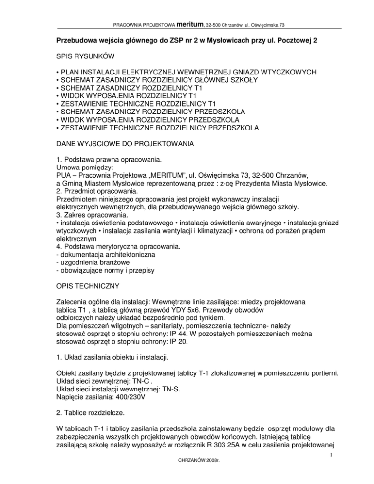 PRACOWNIA PROJEKTOWA meritum, 32-500 Chrzanów, ul. Oświęcimska 73 Przebudowa wejścia głównego do ZSP nr 2 w Mysłowicach przy ul. Pocztowej 2 SPIS RYSUNKÓW • PLAN INSTALACJI ELEKTRYCZNEJ WEWNETRZNEJ GNIAZD WTYCZKOWYCH • SCHEMAT ZASADNICZY ROZDZIELNICY GŁÓWNEJ SZKOŁY • SCHEMAT ZASADNICZY ROZDZIELNICY T1 • WIDOK WYPOSA.ENIA ROZDZIELNICY T1 • ZESTAWIENIE TECHNICZNE ROZDZIELNICY T1 • SCHEMAT ZASADNICZY ROZDZIELNICY PRZEDSZKOLA • WIDOK WYPOSA.ENIA ROZDZIELNICY PRZEDSZKOLA • ZESTAWIENIE TECHNICZNE ROZDZIELNICY PRZEDSZKOLA DANE WYJSCIOWE DO PROJEKTOWANIA 1. Podstawa prawna opracowania. Umowa pomiędzy: PUA – Pracownia Projektowa „MERITUM”, ul. Oświęcimska 73, 32-500 Chrzanów, a Gminą Miastem Mysłowice reprezentowaną przez : z-cę Prezydenta Miasta Mysłowice. 2. Przedmiot opracowania. Przedmiotem niniejszego opracowania jest projekt wykonawczy instalacji elektrycznych wewnętrznych, dla przebudowywanego wejścia głównego szkoły. 3. Zakres opracowania. • instalacja oświetlenia podstawowego • instalacja oświetlenia awaryjnego • instalacja gniazd wtyczkowych • instalacja zasilania wentylacji i klimatyzacji • ochrona od porażeń prądem elektrycznym 4. Podstawa merytoryczna opracowania. - dokumentacja architektoniczna - uzgodnienia branżowe - obowiązujące normy i przepisy OPIS TECHNICZNY Zalecenia ogólne dla instalacji: Wewnętrzne linie zasilające: miedzy projektowana tablica T1 , a tablicą główną przewód YDY 5x6. Przewody obwodów odbiorczych należy układać bezpośrednio pod tynkiem. Dla pomieszczeń wilgotnych – sanitariaty, pomieszczenia techniczne- należy stosować osprzęt o stopniu ochrony: IP 44. W pozostałych pomieszczeniach można stosować osprzęt o stopniu ochrony: IP 20. 1. Układ zasilania obiektu i instalacji. Obiekt zasilany będzie z projektowanej tablicy T-1 zlokalizowanej w pomieszczeniu portierni. Układ sieci zewnętrznej: TN-C . Układ sieci instalacji wewnętrznej: TN-S. Napięcie zasilania: 400/230V 2. Tablice rozdzielcze. W tablicach T-1 i tablicy zasilania przedszkola zainstalowany będzie osprzęt modułowy dla zabezpieczenia wszystkich projektowanych obwodów końcowych. Istniejącą tablicę zasilającą szkołę należy wyposażyć w rozłącznik R 303 25A w celu zasilenia projektowanej 1 CHRZANÓW 2008r. PRACOWNIA PROJEKTOWA meritum, 32-500 Chrzanów, ul. Oświęcimska 73 T-1. Tablicę zasilającą przedszkole należy zdemontować i w miejsce starej zabudować nową z osprzętem modułowym podłączając istniejące obwody. W tablicy tej przewidziano nowe obwody do zasilania oświetlenia i instalacji gniazd 230 V w pomieszczeniu kierownika przedszkola. 3. Instalacja oswietlenia podstawowego. Instalacje zaprojektowano przewodami miedzianymi typu YDYżo 3x1,5mm2 i izolacji 750 V, układanymi pod tynkiem. W pomieszczeniach sanitarnych, technicznych, należy stosować osprzęt o podwyższonym stopniu szczelności min. IP44. W pozostałych pomieszczeniach osprzęt zwykły o stopniu szczelności IP20. Obliczenia natężenia oświetlenia wykonano przy pomocy programu DIALUX. Można stosować oprawy innych firm, jednak z zachowaniem wskazanych parametrów stopień IP, typ odbłyśnika; nie mogą ulec zmianie. Wysokość instalowania łączników: 1.4 m od poziomu posadzki. W części przedszkolnej w sanitariatach należy wymienić oprawy według rysunku parteru i podłączyć do istniejącego obwodu. 4. Instalacja oświetlenia awaryjnego. 4.1. Osw. ewakuacyjne. Instalacje wykonać przewodem YDYżo 3x1.5 mm2 i izolacji 750 V. Oprawy umieścić na drogach ewakuacyjnych jak również nad wejściem głównym do holu i wyjściem ewakuacyjnym z klatki schodowej z prawej strony projektowanego wejścia. Lampy nad wejściami należy wyposażyć w piktogramy z zaznaczonym kierunkiem ewakuacji. Oprawy zasilane są z danego obwodu lamp oświetlenia użytkowego i załączają się automatycznie przy zaniku napięcia zasilania na czas 3godz. Na klatce schodowej na drodze ewakuacyjnej należy wymienić istniejącą oprawę na oprawę z modułem awaryjnym, oprawa ta pełnić będzie również funkcje lampy oświetlającej klatkę schodową podczas przebywania tam ludzi. 5. Instalacja świetlików i wentylatora dachowego W projekcie przewidziano wentylator dachowy, załączany włącznikiem z portierni. Zastosowano również otwierane elektrycznie świetliki dachowe. Otwieranie świetlików zostało podzielone na trzy grupy po trzy świetliki, otwierane niezależnie osobnymi przyciskami zainstalowanymi w pomieszczeniu portierni. 6. Instalacja gniazd wtyczkowych ogólnych. Instalacje wykonać przewodem YDYżo 3x2.5 mm2 i izolacji 750V. Przy instalowaniu gniazd należy zachować minimalny odstęp od rur stalowych, umywalki: - 0.6m. Wszystkie gniazda stosować z bolcem uziemiającym i blokadą przed włożeniem przypadkowego przedmiotu. Wysokości instalowania gniazd: • Gniazda hermetyczne IP 44: h= 1.1 m, • Gniazda IP 20: h = 0.3 m. 2 CHRZANÓW 2008r. PRACOWNIA PROJEKTOWA meritum, 32-500 Chrzanów, ul. Oświęcimska 73 7. Ochrona przed dotykiem bezpośrednim - ochrona podstawowa. W celu ochrony przed dotykiem bezpośrednim zastosowano : -izolacja przewodów na nap. 750 V -zastosowanie stopnie ochrony IP 44 dla pom. wilgotnych, oraz IP20 dla pozostałych, -uzupełnienie ochrony podstawowej: obwody końcowe zabezpieczono wyłącznikiem różnicowoprądowym , In = 0.03A Ochrona przed dotykiem posrednim – ochrona dodatkowa. W celu ochrony przed dotykiem pośrednim zastosowano: -samoczynne wyłączanie zasilania na skutek pojawienia się prądu zwarcia w uszkodzonym obwodzie za pomocą bezpieczników topikowych w czasie tv < 5 s – dla obwodów rozdzielczych , dla pozostałych obwodów odpowiednio w czasie: tv < 0,4 s, oraz tv < 0,2 s -Wszystkie obwody końcowe należy zabezpieczyć wyłącznikami nadmiarowoprądowymi serii S 300 o charakterystyce B. Układ sieci TN-C-S. -Połączenia wyrównawcze: przewód PE winien mie