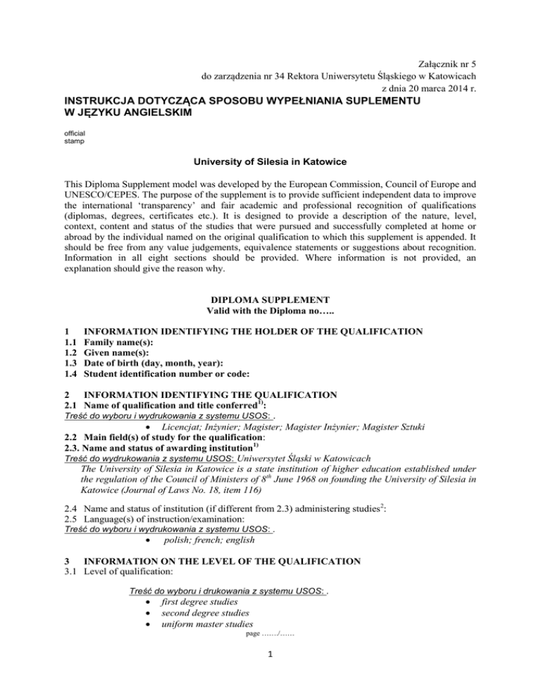 Załącznik nr 5 do zarządzenia nr 34 Rektora Uniwersytetu Śląskiego w Katowicach z dnia 20 marca 2014 r. INSTRUKCJA DOTYCZĄCA SPOSOBU WYPEŁNIANIA SUPLEMENTU W JĘZYKU ANGIELSKIM official stamp University of Silesia in Katowice This Diploma Supplement model was developed by the European Commission, Council of Europe and UNESCO/CEPES. The purpose of the supplement is to provide sufficient independent data to improve the international ‘transparency’ and fair academic and professional recognition of qualifications (diplomas, degrees, certificates etc.). It is designed to provide a description of the nature, level, context, content and status of the studies that were pursued and successfully completed at home or abroad by the individual named on the original qualification to which this supplement is appended. It should be free from any value judgements, equivalence statements or suggestions about recognition. Information in all eight sections should be provided. Where information is not provided, an explanation should give the reason why. DIPLOMA SUPPLEMENT Valid with the Diploma no….. 1 1.1 1.2 1.3 1.4 INFORMATION IDENTIFYING THE HOLDER OF THE QUALIFICATION Family name(s): Given name(s): Date of birth (day, month, year): Student identification number or code: 2 INFORMATION IDENTIFYING THE QUALIFICATION 2.1 Name of qualification and title conferred1): Treść do wyboru i wydrukowania z systemu USOS: . Licencjat; Inżynier; Magister; Magister Inżynier; Magister Sztuki 2.2 Main field(s) of study for the qualification: 2.3. Name and status of awarding institution1) Treść do wydrukowania z systemu USOS: Uniwersytet Śląski w Katowicach The University of Silesia in Katowice is a state institution of higher education established under the regulation of the Council of Ministers of 8th June 1968 on founding the University of Silesia in Katowice (Journal of Laws No. 18, item 116) 2.4 Name and status of institution (if different from 2.3) administering studies2: 2.5 Language(s) of instruction/examination: Treść do wyboru i wydrukowania z systemu USOS: . polish; french; english 3 INFORMATION ON THE LEVEL OF THE QUALIFICATION 3.1 Level of qualification: Treść do wyboru i drukowania z systemu USOS: . first degree studies second degree studies uniform master studies page ……./…… 1 3.2 Official length of programme: Treść do wyboru i wydrukowania z systemu USOS: 2 years (4 semesters) 3 years (6 semesters) 3,5 year (7 semesters) 5 years (10 semesters) 3.3 Access requirements: Treść do wyboru i wydrukowania z systemu USOS „świadectwo dojrzałości oraz pozytywne zakończenie postępowania kwalifikacyjnego”; “a maturity certificate and positive results of qualification proceedings”. 2. „egzamin / rozmowa kwalifikacyjna” - “examination / interview” 3. „dyplom ukończenia studiów inżynierskich oraz pozytywne zakończenie postępowania kwalifikacyjnego”; “a graduation certificate of engineering studies and positive results of qualification proceedings”. 4. „dyplom ukończenia studiów pierwszego stopnia oraz pozytywne zakończenie postępowania kwalifikacyjnego” - “a graduation certificate of first-cycle studies and positive results of qualification proceedings”. 1. 4 INFORMATION ON THE CONTENTS AND RESULTS GAINED3) 4.1 Mode of study: Treść do wyboru i wydrukowania z systemu USOS: full-time part-time 4.2 Programme requirements: Treść do wyboru i wydrukowania z systemu USOS: (tłumaczenie patrz punkty w Suplemencie w języku polskim) 1. „Learning outcomes for the course ……….… approved pursuant to the resolution ……../…… of the UŚ’s Senate on ….……….. . Programme of studies as defined by the Resolution number …….. of the Faculty Board ……………. on …………..”. 2. „Standards of education in accordance with the decree of the Minister of Science and Higher Education of 12 July 2007 on standards of education for particular fields of studies and levels of education as well as procedure of creating and conditions to be fulfilled by the higher education institution for running interdisciplinary and macro-field studies (the Journal of Laws No 164, item 1166). The standards define general requirements including the number of hours of classes and lectures, the profile of the graduate, the content of education presented in particular subjects divided into groups: general education, basic education, and field education as well as recommendations and requirements on serving apprenticeship." 4.3 Programme details – modules or units studied and the individual grades/marks/ECTS credits obtained: Uwaga: Tu jest wstawiona tabelka z przedmiotami ocenami tj. przedmiot / zajęcia / godziny / ocena / punkty ECTS Subject Classes/ hours Grade ECTS credit Type of activities code descriptionL-lecture; C-classes; FLC-foreign language class; Sseminar; Lab-laboratory; EX-examination; CR-credit Title of Master’s thesis: Diploma examination mark: Date of the examination: page ……./…… 2 4.4 Grading scheme and, if available, grade distribution guidance: Treść do wydrukowania z systemu USOS: According to the Regulations of the Studies at UŚ, the following grading scheme is applied for examinations and credits: - very good – 5.0 – A, - plus good – 4.5 – B, - good – 4.0 – C, - plus satisfactory – 3.5 – D, - satisfactory – 3.0 – E, - unsatisfactory (first-time examination or credit) – 2.0 – FX, - unsatisfactory (second-time or third-time examination or credit) – 2.0 – F. Graduation shall take place after a student had defended his/her diploma thesis and passed his/her diploma examination. An overall mark is entered in a graduation diploma and it is calculated in the following way: - up to 3.25 – satisfactory, - 3.26 to 3.75 – plus satisfactory, - 3.76 – 4.25 – good, - 4.25 – 4.60 – plus good, - 4.61 – 4.90 – very good, - over 4.91 – excellent. The basis to calculate the final gra