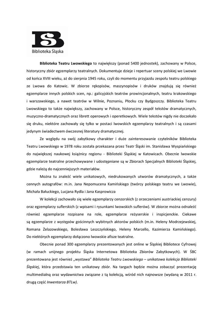 Biblioteka Teatru Lwowskiego to największy (ponad 5400 jednostek), zachowany w Polsce, historyczny zbiór egzemplarzy teatralnych. Dokumentuje dzieje i repertuar sceny polskiej we Lwowie od kooca XVIII wieku, aż do sierpnia 1945 roku, czyli do momentu przyjazdu zespołu teatru polskiego ze Lwowa do Katowic. W zbiorze rękopisów, maszynopisów i druków znajdują się również egzemplarze innych polskich scen, np.: galicyjskich teatrów prowincjonalnych, teatru krakowskiego i warszawskiego, a nawet teatrów w Wilnie, Poznaniu, Płocku czy Bydgoszczy. Biblioteka Teatru Lwowskiego to także największy, zachowany w Polsce, historyczny zespół tekstów dramatycznych, muzyczno-dramatycznych oraz librett operowych i operetkowych. Wiele tekstów nigdy nie doczekało się druku, niektóre zachowały się tylko w postaci lwowskich egzemplarzy teatralnych i są czasami jedynym świadectwem ówczesnej literatury dramatycznej. Ze względu na swój zabytkowy charakter i duże zainteresowanie czytelników Biblioteka Teatru Lwowskiego w 1978 roku została przekazana przez Teatr Śląski im. Stanisława Wyspiaoskiego do największej naukowej książnicy regionu - Biblioteki Śląskiej w Katowicach. Obecnie lwowskie egzemplarze teatralne przechowywane i udostępniane są w Zbiorach Specjalnych Biblioteki Śląskiej, gdzie należą do najcenniejszych materiałów. Można tu znaleźd wiele unikatowych, niedrukowanych utworów dramatycznych, a także cennych autografów: m.in. Jana Nepomucena Kamioskiego (twórcy polskiego teatru we Lwowie), Michała Bałuckiego, Lucjana Rydla i Jana Kasprowicza W kolekcji zachowało się wiele egzemplarzy cenzorskich (z orzeczeniami austriackiej cenzury) oraz egzemplarzy suflerskich (z wpisami i rysunkami lwowskich suflerów). W zbiorze można odnaleźd również egzemplarze rozpisane na role, egzemplarze reżyserskie i inspicjenckie. Ciekawe są egzemplarze z występów gościnnych wybitnych aktorów polskich (m.in. Heleny Modrzejewskiej, Romana Żelazowskiego, Bolesława Leszczyoskiego, Heleny Marcello, Kazimierza Kamioskiego). Do niektórych egzemplarzy dołączono lwowskie afisze teatralne. Obecnie ponad 300 egzemplarzy prezentowanych jest online w Śląskiej Bibliotece Cyfrowej (w ramach unijnego projektu Śląska Internetowa Biblioteka Zbiorów Zabytkowych). W ŚBC prezentowana jest również „wystawa” Biblioteka Teatru Lwowskiego – unikatowa kolekcja Biblioteki Śląskiej, która przedstawia ten unikatowy zbiór. Na targach będzie można zobaczyd prezentację multimedialną oraz wydawnictwa związane z tą kolekcją, wśród nich najnowsze (wydaną w 2011 r. drugą częśd Inwentarza BTLw).