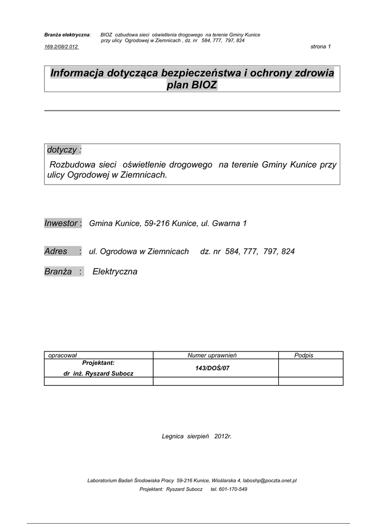 BranŜa elektryczna: BIOZ ozbudowa sieci oświetlenia drogowego na terenie Gminy Kunice przy ulicy Ogrodowej w Ziemnicach , dz. nr 584, 777, 797, 824 strona 1 169.2/08/2 012 Informacja dotycząca bezpieczeństwa i ochrony zdrowia plan BIOZ dotyczy : Rozbudowa sieci oświetlenie drogowego na terenie Gminy Kunice przy ulicy Ogrodowej w Ziemnicach. Inwestor : Gmina Kunice, 59-216 Kunice, ul. Gwarna 1 Adres : ul. Ogrodowa w Ziemnicach BranŜa : dz. nr 584, 777, 797, 824 Elektryczna opracował Numer uprawnień Projektant: dr inŜ. Ryszard Subocz Podpis 143/DOŚ/07 Legnica sierpień 2012r. Laboratorium Badań Środowiska Pracy 59-216 Kunice, Wioślarska 4, [email protected] Projektant: Ryszard Subocz tel. 601-170-549 BranŜa elektryczna: Plan BIOZ Rozbudowa sieci oświetlenie drogowego na terenie Gminy Kunice przy ulicach: śeglarska, Regatowa i Wioślarska na Osiedlu Północnym w Kunicach. strona 2 169.1/08/2012 1.Podstawa opracowania. Podstawą opracowania informacji dotyczącej bezpieczeństwa i ochrony zdrowia są: − Ustawa Prawo Budowlane z dnia 07.07.1994 z późniejszymi zmianami (art. 20 pkt. 1.1b;art. 21a pkt. 4.1a); − Rozporządzenie Ministra Infrastruktury z dnia 23.06.2003r w sprawie informacji dotyczącej bezpieczeństwa i ochrony zdrowia oraz planu bezpieczeństwa i ochrony zdrowia D.U. nr 120 poz. 1126 z 2003 2. Zakres robót . Wykonanie linii kablowej oświetlenia drogowego długość wykonywanej sieci wynosi 416 mb oraz 14 słupów oświetleniowych S0-6 z wysięgnikiem 1.5 m, w skład w/w robót wchodzą: a. roboty przygotowawcze i wytyczenie trasy, b. budowa linii kablowej oświetleniowej: − − − − − wykopy punktowe dla fundamentów słupowych i szafy oświetleniowej, wykopy liniowe dla linii kablowej, postawienie słupów typu oświetleniowych postawienie szafy oświetleniowej, montaŜ opraw oświetleniowych Elgo Acron 100 SR1 (70W) z kloszem PC na wysięgniku W-16 1,5m słupa, − układanie kabla YAKXS 4x35 mm2 w rowie kablowym, − osypanie postawionych fundamentów i zasypanie wykopów, zagęszczenie gruntu, − próby oraz pomiary pomontaŜowe, − przekazanie wybudowanego oświetlenia do Urzędu Gminy w Kunicach, − wykonanie powykonawcze inwentaryzacji geodezyjnej. 3. Kolejność realizacji poszczególnych obiektów. etap pierwszy − roboty przygotowawcze i pomiarowe, wytyczenie geodezyjne, organizacja ruchu etap drugi − budowa linii kablowej: wykopy punktowe i liniowe, układanie kabla YAKXS 4x35 mm2 , montaŜ szafy sterowania oświetleniem, stawianie słupów oświetleniowych, montaŜ opraw, pomiary pomontaŜowe, inwentaryzacja geodezyjna. 4. Wykaz istniejących obiektów budowlanych. Na terenie przewidzianym do budowy kablowej linii oświetleniowej występuje rozbudowana infrastruktura podziemna. Laboratorium Badań Środowiska Pracy 59-216 Kunice, Wioślarska 4, [email protected] Projektant: Ryszard Subocz tel. 0601-170-549 BranŜa elektryczna: Plan BIOZ Rozbudowa sieci oświetlenie drogowego na terenie Gminy Kunice przy ulicach: śeglarska, Regatowa i Wioślarska na Osiedlu Północnym w Kunicach. strona 3 169.1/08/2012 − − − − sieć kablowa nN, kablowa siećteletechniczna, sieć wodociągowa i kanalizacyjna, sieć gazowa. Planowana trasa linii kablowej oświetelnia ulicznego przebiega pod linią napowietrzną 20 kV wykonaną przewodami gołymi, przechodzącą nad drogą. Prace na tym odcinku naleŜy wykonać ręcznie. UWAGA. W związku ciągła rozbudową osiedla zaleca się, przed przystąpieniem do prac, wyjaśnienie w UG Kunice oraz, w ZUD Starostwo Legnica czy, w międzyczasie nie zgłoszona została lub wykonana rozbudowa infrastruktury w strefie planowanej inwestycji. 5. Wskazanie elementów zagospodarowania terenu lub działki, które mogą stwarzać zagroŜenie bezpieczeństwa i zdrowia ludzi oraz przewidywane zagroŜenia występujące w czasie realizacji robót budowlanych. Elementy stwarzające zagroŜenie: − roboty prowadzone w pasie drogowym związane z prowadzeniem wykopów pod fundamenty i linię kablową ( w szczególności na odcinku pod istniejacą linią napowietrzną 20 kV) i stawianiem słupów. ZagroŜenia dotyczące pracowników budowy oraz uŜytkowników pasa drogowego przy czynnym ruchu drogowym przez cały czas prowadzenia robót. W związku z powyŜszym waŜne jest: − odpowiednie oznakowanie i zabezpieczenie robót w czasie całego okresu prowadzenia robót, − prowadzenie robót według obowiązujących przepisów BHP. 6. Sposób prowadzenia instruktaŜu pracowników przed przystąpieniem do realizacji robót niebezpiecznych. Szkolenie i instruktaŜ pracowników przed przystąpieniem do wykonywania robót przy budowie sieci elektroenergetycznej oświetleniowej wykonuje kierownik budowy z uprawnieniami budowlanymi w tej specjalności z prowadzeniem ksiąŜki szkoleń na budowie, w której prowadzi sięzapisy tematu szkolenia. Kierować do danego rodzaju prac budowlanych czy transportowych pracowników o odpowiednich kwalifikacjach i doświadczeniu zawodowym. Stosować odpowiedni sprzęt i narzędzia do danego rodzaju robót. Kierownik budowy winien zabezpieczyć pracownikom odpowiedni sprzęt BHP i ubrania ochronne według rodzaju wykonywanych prac na budowie szczególnie tych niebezpiecznych. Przedmiotowe szkolenia pracowników wykonać naleŜy, gdy Laboratorium Badań Środowiska Pracy 59-216 Kunice, Wioślarska 4, [email protected] Projektant: Ryszard Subocz tel. 0601-170-549 BranŜa elektryczna: Plan BIOZ Rozbudowa sieci oświetlenie drogowego na terenie Gminy Kunice przy ulicach: śeglarska, Regatowa i Wioślarska na Osiedlu Północnym w Kunicach. strona 4 169.1/08/2012 − − pracownik po raz pierwszy wykonuje daną pracęna danym stanowisku – odcinku robót, przy zmianie stanowiska lub wykonywanych czynności na stanowisku pracy. Dotyczy to szczególnie robót: − − − − − montaŜowych z udziałem dźwigów i sprzętu cięŜkiego wykonywaniu robót sprzętem mechanicznym, elektronarzędz
