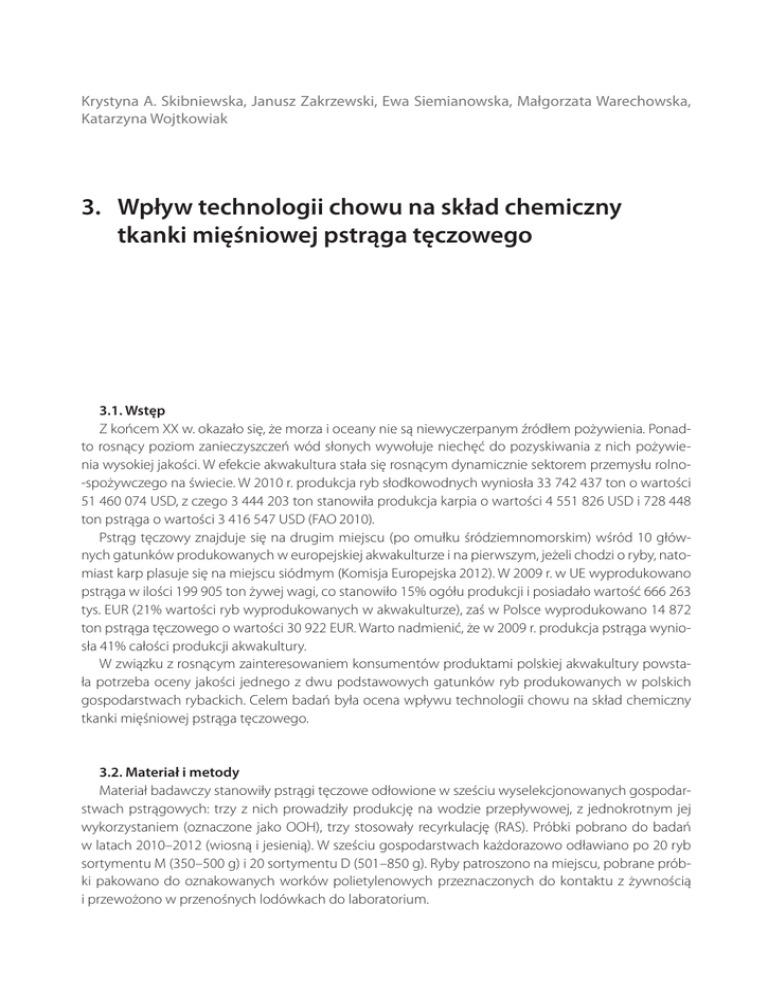 22 Krystyna A. Skibniewska, Janusz Zakrzewski, Ewa Siemianowska, Małgorzata Warechowska, Katarzyna Wojtkowiak Krystyna A. Skibniewska, Janusz Zakrzewski, Ewa Siemianowska, Małgorzata Warechowska, Katarzyna Wojtkowiak 3. Wpływ technologii chowu na skład chemiczny tkanki mięśniowej pstrąga tęczowego 3.1. Wstęp Z końcem XX w. okazało się, że morza i oceany nie są niewyczerpanym źródłem pożywienia. Ponadto rosnący poziom zanieczyszczeń wód słonych wywołuje niechęć do pozyskiwania z nich pożywienia wysokiej jakości. W efekcie akwakultura stała się rosnącym dynamicznie sektorem przemysłu rolno-spożywczego na świecie. W 2010 r. produkcja ryb słodkowodnych wyniosła 33 742 437 ton o wartości 51 460 074 USD, z czego 3 444 203 ton stanowiła produkcja karpia o wartości 4 551 826 USD i 728 448 ton pstrąga o wartości 3 416 547 USD (FAO 2010). Pstrąg tęczowy znajduje się na drugim miejscu (po omułku śródziemnomorskim) wśród 10 głównych gatunków produkowanych w europejskiej akwakulturze i na pierwszym, jeżeli chodzi o ryby, natomiast karp plasuje się na miejscu siódmym (Komisja Europejska 2012). W 2009 r. w UE wyprodukowano pstrąga w ilości 199 905 ton żywej wagi, co stanowiło 15% ogółu produkcji i posiadało wartość 666 263 tys. EUR (21% wartości ryb wyprodukowanych w akwakulturze), zaś w Polsce wyprodukowano 14 872 ton pstrąga tęczowego o wartości 30 922 EUR. Warto nadmienić, że w 2009 r. produkcja pstrąga wyniosła 41% całości produkcji akwakultury. W związku z rosnącym zainteresowaniem konsumentów produktami polskiej akwakultury powstała potrzeba oceny jakości jednego z dwu podstawowych gatunków ryb produkowanych w polskich gospodarstwach rybackich. Celem badań była ocena wpływu technologii chowu na skład chemiczny tkanki mięśniowej pstrąga tęczowego. 3.2. Materiał i metody Materiał badawczy stanowiły pstrągi tęczowe odłowione w sześciu wyselekcjonowanych gospodarstwach pstrągowych: trzy z nich prowadziły produkcję na wodzie przepływowej, z jednokrotnym jej wykorzystaniem (oznaczone jako OOH), trzy stosowały recyrkulację (RAS). Próbki pobrano do badań w latach 2010–2012 (wiosną i jesienią). W sześciu gospodarstwach każdorazowo odławiano po 20 ryb sortymentu M (350–500 g) i 20 sortymentu D (501–850 g). Ryby patroszono na miejscu, pobrane próbki pakowano do oznakowanych worków polietylenowych przeznaczonych do kontaktu z żywnością i przewożono w przenośnych lodówkach do laboratorium. 23 Wpływ technologii chowu na skład chemiczny tkanki mięśniowej pstrąga tęczowego Natychmiast po przywiezieniu z próbek pobierano wycinek tkanki mięśniowej od strony dorsalnej (grzbietowej) do brzusznej o szerokości ok. 10–15 cm, usuwano skórę i ości, siekano nożem i homogenizowano (typ PRO350 BIOEKO, czas: 40 s, prędkość: 11.000 rpm). Z tak przygotowanego materiału pobierano próbki do dalszych analiz. Oznaczono suchą masę całkowitą metodą wagową wg PN 62/A/86783, tzn. suszenie do stałej wagi w temperaturze 105°C, popiołowość metodą wagową w temperaturze 650°C, zawartość białka poprzez oznaczenie zawartości azotu ogólnego metodą Kjeldahla oraz przeliczenie na białko ogólne z zastosowaniem przelicznika wynoszącego 6,25, zgodnie z normami PN-A-04018:1975, PN-A-04018:1975/Az3:2002, a także tłuszcz ogółem metodą wagową po ekstrakcji metodą Folcha i wsp. (1957), polegającej na homogenizacji próbki kolejno z metanolem i chloroformem, odsączeniu homogenatu, przepłukaniu pozostałości mieszaniną chloroform: metanol (2 : 1), wysoleniu próbki, oddzieleniu warstwy lipidowej i oddestylowaniu rozpuszczalnika. Profil kwasów tłuszczowych w hydrolizacie tłuszczu uzyskanego według zmodyfikowanej metody Peiskera (Żegarska i wsp. 1991) oznaczono metodą chromatografii gazowej (Agilent Gas Chromatograph 6890N) z płomieniowym detektorem jonizacyjnym i 30-metrową kolumną kapilarną. Wyniki poddano analizie statystycznej z zastosowaniem oprogramowania STATISTICA for Windows v. 10 (StatSoft Inc.). Hipotezy statystyczne testowano na poziomie istotności α = 0,05. Istotność różnic między średnimi oceniono z pomocą testu Tukey’a. 3.3. Wyniki badań i ich omówienie Sucha masa całkowita należy do podstawowych parametrów stosowanych przy ocenie jakości produktów spożywczych (Başyiğit, Tekin-Özan 2013). Jej średnia zawartość w próbkach z poszczególnych gospodarstw została oznaczona w wąskich granicach 25,91–26,13%, a analiza statystyczna nie wykazała różnic zarówno pomiędzy poszczególnymi gospodarstwami, jak i pomiędzy technologiami (OOH – 25,99% i RAS – 26,10%) – ryc. 1. SUCHA MASA 27,0 26,5 26,0 25,5 25,0 Mediana 25%–75% Min-Maks 24,5 24,0 1 2 OOH 3 1 2 3 RAS Ryc. 1. Zawartość suchej masy (%) w tkance mięśniowej pstrągów z poszczególnych gospodarstw 24 Krystyna A. Skibniewska, Janusz Zakrzewski, Ewa Siemianowska, Małgorzata Warechowska, Katarzyna Wojtkowiak Kolejnym, ważnym parametrem oceny jakości produktu spożywczego jest zawartość popiołu ogólnego pozostającego po spaleniu próbki produktu (Vujadinović, Marjanović-Balaban 2012). Stanowi on całkowitą zawartość związków mineralnych pozostałą po spaleniu, bez względu na to, w jakiej postaci występowały one w produkcie. Skład i ilość tych substancji w mięsie zwierząt hodowlanych, w tym i pstrąga, zależy głównie od dostępności tych pierwiastków w paszy, od gatunku zwierząt, ich stanu fizjologicznego i wieku. Średnia zawartość popiołu w tkance mięśniowej ryb odłowionych w poszczególnych gospodarstwach zawarta była w przedziale 1,12–1,28%, przy czym zawartość popiołu w tkance mięśniowej ryb z technologii OOH wynosiła 1,20%, zaś z technologii RAS – 1,15%. Niemniej analiza statystyczna nie potwierdziła istotnego wpływu stosowanych technologii hodowli na zawartość składników mineralnych w mięsie pstrąga (ryc. 2).