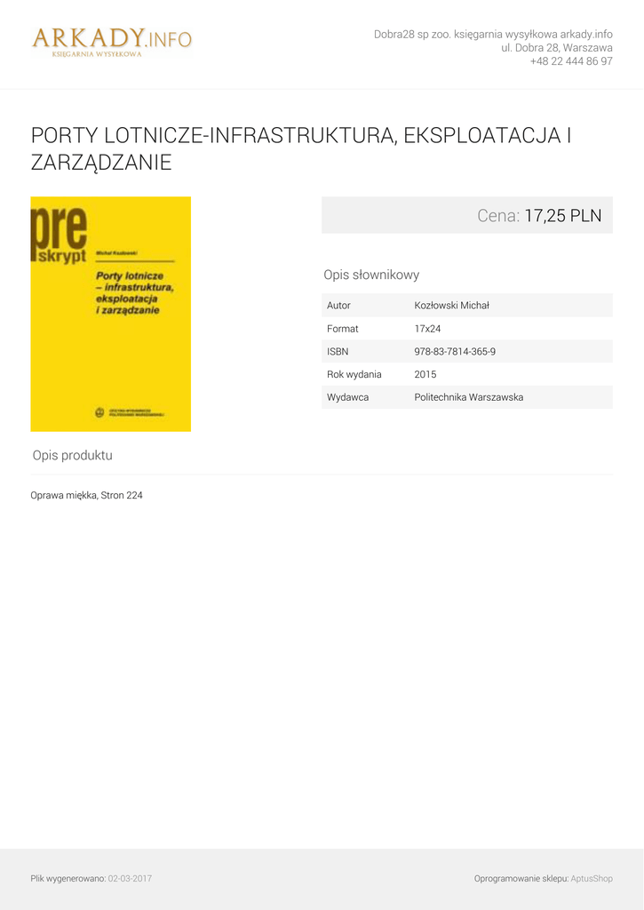 Dobra28 sp zoo. księgarnia wysyłkowa arkady.info ul. Dobra 28, Warszawa +48 22 444 86 97 PORTY LOTNICZE-INFRASTRUKTURA, EKSPLOATACJA I ZARZĄDZANIE Cena: 17,25 PLN Opis słownikowy Autor Kozłowski Michał Format 17x24 ISBN 978-83-7814-365-9 Rok wydania 2015 Wydawca Politechnika Warszawska Opis produktu Oprawa miękka, Stron 224 Plik wygenerowano: 02-03-2017 Powered by TCPDF (www.tcpdf.org) Oprogramowanie sklepu: AptusShop