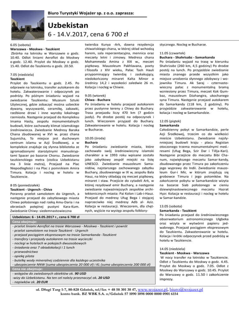 Biuro Turystyki Wojażer sp. z o.o. zaprasza: Uzbekistan 6 - 14.V.2017, cena 6 700 zł 6.05 (sobota) Warszawa - Moskwa - Taszkient Zbiórka na lotnisku w Warszawie o godz. 10.40. Odlot liniami Aeroflot do Moskwy o godz. 12.40. Przylot do Moskwy o godz. 15.40. Odlot do Taszkientu o godz. 20.50. 7.05 (niedziela) Taszkient Przylot do Taszkientu o godz. 2.45. Po odprawie na lotnisku, transfer autokarem do hotelu. Zakwaterowanie i odpoczynek po podróży. Po późnym śniadaniu wyjazd na zwiedzanie Taszkientu: Muzeum Sztuki Użytecznej, gdzie zobaczyć można uzbeckie dywany, wyszywanki, ceramikę, zabawki, rzeźbione drzwi i inne wyroby lokalnego rzemiosła. Następnie przejazd do Kompleksu Imama Hasty, zespołu monumentalnych budowli, które zachowały klimat islamskiego średniowiecza. Zwiedzanie Medresy Baraka Chana zbudowanej w XVI w. przez chana Sujunicha, To miejsce jest duchowym centrum islamu w Azji Środkowej, a w kompleksie znajduje się słynna biblioteka ze zgromadzonymi starożytnymi manuskryptami Spacer po bazarze Chorsu. Zwiedzanie taszkienckiego metra (stolica Uzbekistanu ma 3 linie metra), Przejazd na Plac Niepodległości i na Plac z pomnikiem Amira Timura. Kolacja i nocleg w hotelu w Taszkiencie. 8 05 (poniedziałek) Taszkient - Urgench - Chiva Poranny przelot samolotem do Urgench, a następnie przejazd do zabytkowego miasta Chiwa położonego nad rzeką Amu-Daria i na obrzeżach potężnej pustyni Kara-Kum. Zwiedzanie Chiwy: siedemnastowieczna twierdza Kunya -Ark, dawna rezydencja chiwańskiego chana, w której skład wchodzą harem, sala reperzentacyjna, mennica oraz meczety letni i zimowy. Medresa chana Mohammeda Amina z XIX w., meczet piątkowy. Mauzoleum Pakhlavana, poety i filozofa z XIV wieku, Pałac Tash Hauli przypominający twierdzę i zaskakujący, niedokończony minaret Kalta Minor o średnicy 14,2 i wysokości zaledwie 26 m. Kolacja i nocleg w Chiwie. 9.05 (wtorek) Chiwa - Buchara Po śniadaniu w hotelu przejazd autokarem przez pustynne tereny z Chiwy do Buchary. Trasa przejazdu liczy 470 km (7 godzin jazdy). Po drodze postój na odpoczynek i lunch. Wieczorem przyjazd do Buchary. Zakwaterowanie w hotelu. Kolacja i nocleg w Bucharze. 10.05 (środa) Buchara Po śniadaniu zwiedzanie miasta, które zachowało swój średniowieczny islamski charakter a w 1993 roku wpisane zostało jako zabytkowy zespół miejski na listę UNESCO. Zwiedzanie mauzoleum Samanidów, najstarszego zachowanego zabytku Buchary, zbudowanego w IX w, zespołu Bala Hauz, na który składają się meczet piątkowy, minaret i staw. Przejście do cytadeli Ark, w której rezydował emir Buchary, a następnie zwiedzanie najważniejszych zespołów architektonicznych miasta: Pai Kolon i Lab-i-Hauz. Przejazd do medresy Uług Bega i stojącej naprzeciwko niej medresy Adb al- Aziz. Kolacja w restauracji. Wieczorem, dla chętnych, wyjście na występ zespołu folklory- Uzbekistan: 6 - 14.05.2017 r., cena 6 700 zł Cena obejmuje: - przelot liniami Aeroflot na trasie Warszawa - Moskwa - Taszkient i powrót - przelot samolotem na trasie Taszkient - Urgench - przejazd pociągiem ekspresowym na trasie Samarkanda -Taszkient - transfery i przejazdy autokarem na trasie wycieczki - noclegi w hotelach w pokojach dwuosobowych - śniadania oraz 7 obiadokolacji i 1 lunch - przewodnictwo - opiekę pilota - butelkę wody mineralnej codziennie dla każdego uczestnika - ubezpieczenie NNW (suma ubezpieczenia 20 000 zł) i KL (suma ubezpieczenia 200 000 zł) Cena nie obejmuje: - wstępów do zwiedzanych obiektów ok. 90 USD -wizy do Uzbekistanu. Na ten cel należy przeznaczyć ok. 20 USD - napiwków ok. 20 EUR stycznego. Nocleg w Bucharze. 11.05 (czwartek) Buchara - Shahrisabz - Samarkanda Po śniadaniu wyjazd na trasę w kierunku Shahrizabz (260 km, 4,5 godziny) Po drodze postój na lunch. Po przyjeździe zwiedzanie miasta znanego przede wszystkim jako miejsce urodzenia słynnego zdobywcy i wojownika Timura. Ak Saraj - czternastowieczny pałac z monumentalną bramą wzniesiony przez Timura, meczet Kok Gumbaz, mauzoleum Dżahangira, ukochanego syna Timura. Następnie przejazd autokarem do Samarkandy (118 km, 2 godziny). Po przyjeździe zakwaterowanie w hotelu, kolacja i nocleg w Samarkandzie. 12.05 (piątek) Samarkanda Całodzienny pobyt w Samarkandzie, perle Azji Środkowej, trzecim co do wielkości mieście Uzbekistanu. Zwiedzanie najsłynniejszej budowli kraju - placu Registan otoczonego trzema monumentalnymi med.resami (Uług Bega, Szir Dar i Tillja-Kari). Następnie przejście do meczetu Bibi Chanum, największego meczetu Samar-kandy, zbudowanego przez Timura po zakończeniu jego wyprawy do Indii. Zwiedzanie mauzoleum Gur-i Mir, w którym znajdują się grobowce Timura i jego potomków. Na zakończenie pobytu w Samarkandzie wizyta na bazarze Siab położonego w cieniu dziewiętnastowiecznego meczetu Hazrat Hyzr. Kolacja w restauracji i nocleg w hotelu w Samar-kandzie. 13.05 (sobota) Samarkanda - Taszkient Po śniadaniu przejazd do średniowiecznego obserwatorium astronomicznego Ulgbeka oraz wizyta w wytwórni papieru jedwabnego. Przejazd pociągiem ekspresowym do Taszkientu. Zakwaterowanie w hotelu. Kolacja i krótki odpoczynek przed podróżą w hotelu w Taszkiencie. 14.05 (niedziela) Taszkient - Moskwa - Warszawa W nocy transfer na lotnisko w Taszkiencie. Odlot z Taszkientu do Moskwy o godz. 4.45. Przylot do Moskwy o godz. 7.05. Odlot z Moskwy do Warszawy o godz. 10.45. Przylot do Warszawy o godz. 11.50 i zakończenie imprezy. ul. Długi Targ 1-7, 80-828 Gdańsk, tel/fax + 48 58 301 38 47, www.wojazer.pl, [email protected] konto bank. BZ WBK S.A. o/Gdańsk 57 1090 1098 0000 0000 0901 6154