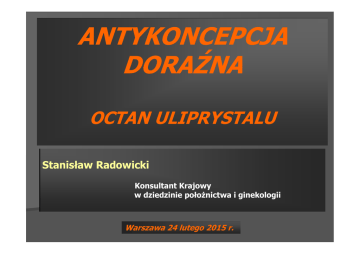 ANTYKONCEPCJA DORAŹNA OCTAN ULIPRYSTALU Stanisław Radowicki Konsultant Krajowy w dziedzinie położnictwa i ginekologii Warszawa 24 lutego 2015 r. Fizjologia cyklu miesiączkowego „Okno płodności” Cykl miesiączkowy - zapłodnienie Okno płodności Zapłodnienie możliwe: – – Czas przeżycia plemników – do 120 godz. Czas przeżycia oocyta 5 dni przed owulacją 1 – 2 dni po owulacji Najwyższy odsetek zapłodnień – 2 dni przed owulacją – 12 – 24 godz. po owulacji Antykoncepcja doraźna Antykoncepcja doraźna – jednorazowe użycie leku lub przyrządu medycznego po niezabezpieczonym stosunku płciowym w celu zapobieżenia powstania ciąży „emergency contraception” „post-coital contraception” „morning after pill” Gemzell-Danielson K. Contraception 2013 Antykoncepcja doraźna - wskazania Sytuacja kliniczna Wskazania do antykoncepcji doraźnej Stosunek bez zabezpieczenia Gwałt Ciąża nie jest planowana Brak efektywnego zabezpieczenia, Prezerwatywa Rozdarcie, zsunięcie się, nieprawidłowe użycie Doustna antykoncepcja Ominięcie 3 lub więcej kolejnych tabletek (30 – 35 mcg EE) lub 2 lub więcej (20 mcg EE) Pierścień domaciczny / plaster Nieprawidłowa aplikacja, opóźnienie założenia, zbyt wczesne usunięcie Tabletki „progestagen only” Zbyt późne przyjęcie jednej lub więcej tabletek lub ominięcie tabletki Antykoncepcja parenteralna (domięśniowa, podskórna) Powyżej 14 tyg. od ostatniego podania Depo Provera Wkładka domaciczna Wydalenie wkładki, nieprawidłowe jej ułożenie Stosunek przerywany Wytrysk nasienia do pochwy lub na zewnątrz genitalia Metody naturalne Nieprawidłowe wyliczenie dni płodnych Kapp N. Contraception 2015 Antykoncepcja doraźna Rodzaje antykoncepcji doraźnej – – – – Metoda Yuzpe Dwumetylostilbestrol Danazol Estrogeny (wysokie dawki) Estrogeny skoniugowane Etynyloestradiol – Progestageny Lewonorgestrel – Specyficzne modulatory receptora estrogenowego (SPRM) Mifepristol (RU 486) Octan uliprystalu (ellaOne) – Wkładka domaciczna Zawierająca miedź Leki dostępne w Polsce Antykoncepcja doraźna - metody Lewonorgestrel („Escapelle) – Syntetyczny progestagen – Może być stosowany do 72 godzin (skuteczność - 85%) – Dawka podstawowa - 1,5 mg p.o. – można podwyższyć do 3,0 mg – Przeciwwskazania choroby wątroby choroba Crohn’a zaburzenia wchłaniania leki indukujące aktywność enzymów wątrobowych (przeciwpadaczkowe, antyretrowirusowe, przeciwgrzybicze, antybiotyki) Kapp N. Contraception 2015 Antykoncepcja doraźna - metody Lewonorgestrel („Escapelle) Mechanizmy działania – – – – – – – – – Opóźnia dojrzewanie pęcherzyka Zatrzymuje rozwój pęcherzyka (podany przed wyrzutem LH) Nie zapobiega owulacji - podany w momencie rozpoczęcia wzrostu LH Nie wpływa na receptywność endometrium ? Nie wpływa na procesy zapłodnienia Nie wpływa na funkcję ciałka żółtego Nie wpływa na motorykę jajowodów Zmienia gęstość śluzu szyjkowego Podany w ciąży nie wpływa na jej przebieg i nie uszkadza płodu Lalitkumar P. Best. Pract. Res. Clin. Endo. Metab. 2014 Antykoncepcja doraźna - rodzaje Specyficzne modulatory receptora progesteronowego (SPRM) – Mifepriston (RU-486) Antagonista progesteronu Dawkowanie: 25 – 50 mg p.o. Do 120 godzin (skuteczność – 90%) Dostępny: Chiny, Rosja, Francja ? – Uliprystal octan („Ella One”) Dawkowanie: 30 mg tabl. p.o. Do 120 godzin (skuteczność – 98%) Lalitkumar P. Best. Pract. Res. Clin. Endo. Metab. 2014 Specyficzne modulatory receptora progesteronowego (SPRM) budowa chemiczna Asoprysnil Telapriston octan Uliprystal octan Onapriston Mifepriston Progesteron Antagonista Agonista SPRM Mezoprogestageny Bouchard P. Fertil. Steril. 2011 Mechanizm działania progesteronu połączenie progesteronu z receptorem zmiana konfiguracji receptora połączenie progesteronu z kompleksem białkowym połączenie z „progesterone response elements” - promotor genu docelowego połączenie z koaktywatorami Scaprin M.M. 2009 Selektywne modulatory receptora progesteronowego (SPRM) Wiązanie się z receptorem progesteronowym Scaprin M.M. 2009 Antykoncepcja doraźna Specyficzne modulatory receptora progesteronowego mechanizm działania Antykoncepcja doraźna octan uliprystalu Octan uliprystalu Doustna dawka jednorazowa - 30,0 mg Okres półtrwania – 32 godz. Stężenie maksymalne po: 0,5 – 3,0 godz. Łączy się z białkami krwi: 97,0 – 99,5% Wydalany – kał 90% mocz 10% Stężenie prolaktyny niewielki wzrost Obniżenie stężenia estradiolu i progesteronu Stężenie hormonów tarczycy (TSH, FT4) oraz ACTH – w granicach normy Murdoch M. Obstet. Gyn. 2014 Antykoncepcja doraźna Octan uliprystalu (1) Mechanizmy działania – Hamowanie pęknięcia pęcherzyka Podanie przed wyrzutem LH – 100% leczonych Średnica pęcherzyka ≥ 18 mm: pęknięcie pęcherzyka przesunięte o 5 – 6 dni Podanie z chwilą rozpoczęcia wyrzutu LH – 79% leczonych Podanie w dniu piku LH - pęknięcie pęcherzyka przesunięte o 24 – 48 godz. Zahamowanie pęknięcia pęcherzyka – 8% leczonych Lalitkumar P. Best. Pract. Res. Clin. Endo. Metab. 2014 Antykoncepcja doraźna Octan uliprystalu (2) Mechanizmy działania – W doustnej dawce jednorazowej (30,0 mg) nie wykazuje działania na endometrium – Podanie we wczesnej ciąży nie upośledza jej przebiegu i nie wpływa na rozwój płodu – Odsetek ciąż po leczeniu 1,4% Lalitkumar P. Best. Pract. Res. Clin. Endo. Metab. 2014 Antykoncepcja doraźna Octan uliprystalu Działania niepożądane – – – – Wydłużenie cyklu miesiączkowego o 1 – 2 dni (86%) Bóle głowy (19%) Bolesne miesiączki (12%) Nudności (10%) Lalitkumar P. Best. Pract. Res. Clin. Endo. Metab. 2014 Antykoncepcja doraźna Uliprystal a masa ciała Glasier A. Contraception 2011 Antykoncepcja doraźna - uwagi praktyczne Antykoncepcja doraźna uwagi praktyczne Po podaniu antykoncepcji doraźnej zaleca się stosowani