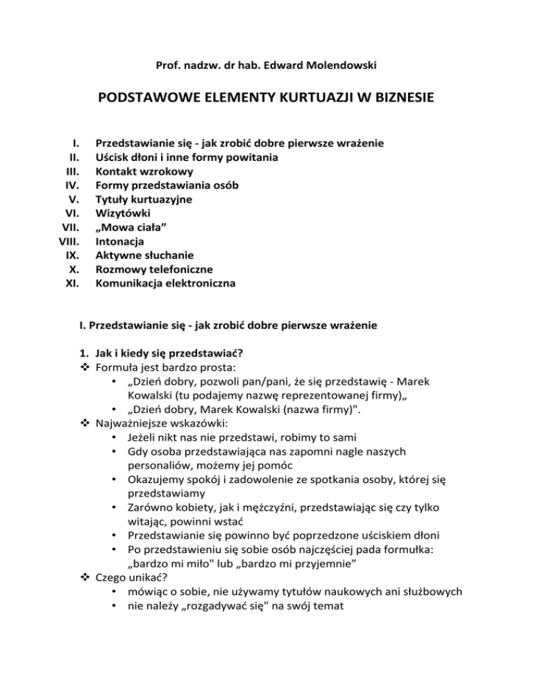 Prof. nadzw. dr hab. Edward Molendowski PODSTAWOWE ELEMENTY KURTUAZJI W BIZNESIE I. II. III. IV. V. VI. VII. VIII. IX. X. XI. Przedstawianie się - jak zrobid dobre pierwsze wrażenie Uścisk dłoni i inne formy powitania Kontakt wzrokowy Formy przedstawiania osób Tytuły kurtuazyjne Wizytówki „Mowa ciała” Intonacja Aktywne słuchanie Rozmowy telefoniczne Komunikacja elektroniczna I. Przedstawianie się - jak zrobid dobre pierwsze wrażenie 1. Jak i kiedy się przedstawiad? Formuła jest bardzo prosta: • „Dzieo dobry, pozwoli pan/pani, że się przedstawię - Marek Kowalski (tu podajemy nazwę reprezentowanej firmy)„ • „Dzieo dobry, Marek Kowalski (nazwa firmy)". Najważniejsze wskazówki: • Jeżeli nikt nas nie przedstawi, robimy to sami • Gdy osoba przedstawiająca nas zapomni nagle naszych personaliów, możemy jej pomóc • Okazujemy spokój i zadowolenie ze spotkania osoby, której się przedstawiamy • Zarówno kobiety, jak i mężczyźni, przedstawiając się czy tylko witając, powinni wstad • Przedstawianie się powinno byd poprzedzone uściskiem dłoni • Po przedstawieniu się sobie osób najczęściej pada formułka: „bardzo mi miło" lub „bardzo mi przyjemnie” Czego unikad? • mówiąc o sobie, nie używamy tytułów naukowych ani służbowych • nie należy „rozgadywad się" na swój temat II. Uścisk dłoni i inne formy powitania 1. Jaki jest prawidłowy uścisk dłoni? Prawidłowy uścisk dłoni jest ciepły, serdeczny, zdecydowany i krótki. • Taki uścisk mówi: „Cieszę się, że cię spotkałem„ Nie można ściskad czyjejś dłoni, używając obu swoich (uścisk „na rękawiczkę") 2. • • • • • • • • • • • • • Błędy najczęściej popełniane przy powitaniu: „Zwiędła" dłoo podana jakby do pocałunku Dłoo podana na sztywnej, wyprostowanej ręce i słaby uścisk Podanie wilgotnej, zimnej dłoni Dziadek do orzechów„ Zbyt długie „pompowanie„ Całowanie w rękę Odsuwanie się i podchodzenie zbyt blisko swego rozmówcy Wyrywanie swojej ręki przy długotrwałym „pompowaniu". Całowanie w policzki Powitanie „na niedźwiedzia” Dotykanie Nieprzyjęcie czyjegoś uścisku Noszenie ostrego pierścienia na prawej dłoni 3. • • • • Najważniejsze wskazówki: Kto pierwszy wyciąga dłoo do powitania? W jakiej kolejności należy ściskad dłonie? W jakich sytuacjach powinno się ściskad dłoo? Kiedy nie należy inicjowad uścisku dłoni? III. Kontakt wzrokowy 1. Prawidłowy kontakt wzrokowy W biznesie wzrok mówiącego powinien padad prosto w oczy lub w okolice oczu rozmówcy 2. Niewłaściwy kontakt wzrokowy Wzrok skierowany poniżej linii oczu nie powinien towarzyszyd kontaktom służbowym. Świadczy bowiem o tym, że myśli naszego rozmówcy odbiegają od głównego tematu rozmowy IV. Formy przedstawiania osób 1. Podstawowe zasady: • W kręgach biznesu przedstawianie osób odbywa się na podstawie precedencji • Płed nie ma wpływu na kolejnośd w przedstawianiu • Zawsze zwracamy się do osoby o wyższej randze i przedstawiamy jej osobę o niższej randze Przykład: „Panie prezesie, pozwoli pan przedstawid sobie: Pani Iwona Kwiecioska, kierownik Działu Transportu firmy XYZ” 2. Inne ważne zasady, o których warto pamiętad: • Podczas prezentacji osoba przedstawiająca nie powinna używad gestów • Osoba niepubliczna przedstawiana jest osobie publicznej o dużej randze społecznej • Menedżer przedstawiany jest klientowi, bez względu na stanowisko klienta • Jeżeli mamy do czynienia z osobami o tej samej randze, można zastosowad zasady etykiety towarzyskiej lub przedstawiad osoby w kolejności alfabetycznej • Podczas przedstawiania, oprócz wymienienia imion, nazwisk, stanowisk i tytułów, ważne jest dodanie czegoś na temat tych osób, aby ułatwid im zainicjowanie rozmowy • Jeśli osoba przedstawiająca popełniła błąd, wymieniając imiona, nazwiska, stanowiska lub nazwy reprezentowanych firm, należy to natychmiast skorygowad • Jeśli osoba przedstawiająca zrobiła błąd w kolejności przedstawiania nie zwracamy na to uwagi • Jeżeli większa grupa osób jest w pomieszczeniu i wchodzi kolejny gośd, to bez względu na jego rangę - przedstawiamy go osób będącym już na miejscu • Jeśli przedstawiamy sobie dwie osoby, z których jedną znamy tylko z nazwiska, a drugą z imienia i nazwiska, traktujemy obie osoby tak samo, wymieniając same nazwiska • Jeśli natomiast znamy tylko imiona, sprawa staje się trudniejsza, trzeba się do tego przyznad i poprosid osoby przedstawiane o pomoc 3. Tytułowanie • Podczas przedstawiania, nawiązywania rozmowy niezmiernie ważna jest wiedza, jak zwracad się do poznanych osób. Na tym polu bardzo często zdarzają się błędy. I to nie tylko związane z nieznajomością tytułów kurtuazyjnych • Kiedy wobec tego możemy sobie pozwolid na mniej oficjalne formy? Trzeba spokojnie poczekad na dogodny moment - czasami następuje on po kilku spotkaniach, a bywa i tak, że dopiero po kilku latach znajomości. Propozycja mówienia sobie po imieniu może wyjśd od osoby stojącej wyżej w hierarchii, nigdy na odwrót. Jeżeli nam nie odpowiada zwracanie się do siebie po imieniu, możemy kontynuowad oficjalną formę, dając w ten sposób do zrozumienia, że ta będzie właściwsza. V. Tytuły kurtuazyjne OSOBA Papież Król Prezydent RP Żona/Mąż Prezydenta Premier Żona/Mąż Premiera Minister Zona/Mąż Ministra Ambasador nadzwyczajny i pełnomocny TYTUŁY Wasza Świątobliwośd, Ojcze Święty Wasza Królewska Mośd Panie Prezydencie Pani Prezydent (Wasza) Ekscelencjo Pani/Panie Panie Premierze Pani Premier (Wasza) Ekscelencjo Pani/Panie UWAGI Nie „Świętobliwośd - ta forma jest rzadka Forma „Ekscelencjo" używana jest tylko przez obywateli innych paostw Nie: „Pani Prezydentowo" ta forma jest błędna Forma „Ekscelencjo" używana jest tylko przez obywateli innych paostw Panie Ministrze Pani