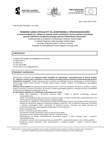 Śrem, dnia 24.07.2013r. Znak sprawy:PPP.0962.1.3.3.2013 PEŁNIENIE FUNKCJI SPECJALISTY DS. MONITORINGU I SPRAWOZDAWCZOŚCI w ramach projektu pn. „Wsparcie rozwoju szkół i przedszkoli z terenu powiatu śremskiego poprzez wdrożenie zmodernizowanego systemu doskonalenia nauczycieli”, realizowanego ze środków Europejskiego Funduszu Społecznego, w ramach Programu Operacyjnego Kapitał Ludzki, Priorytet III Wysoka jakość systemu oświaty, Działanie 3.5 Kompleksowe wspomaganie rozwoju szkół ZAMAWIAJĄCY: Poradnia Psychologiczno-Pedagogiczna w Śremie ul. Marciniaka 2 63-100 Śrem tel. 61/ 28 34 864 e-mail: [email protected] PRZEDMIOT ZAMÓWIENIA: Przedmiotem zamówienia jest pełnienie funkcji specjalisty ds. monitoringu i sprawozdawczości w ramach projektu pn. „Wsparcie rozwoju szkół i przedszkoli z terenu powiatu śremskiego poprzez wdrożenie zmodernizowanego systemu doskonalenia nauczycieli”. Projekt realizowany jest ze środków Europejskiego Funduszu Społecznego w ramach Programu Operacyjnego Kapitał Ludzki, Priorytet III Wysoka jakość systemu oświaty, Działanie 3.5 Kompleksowe wspomaganie rozwoju szkół. Głównym celem projektu jest podniesienie jakości funkcjonowania systemu doskonalenia nauczycieli w powiecie śremskim poprzez stworzenie w okresie od VIII 2013r. do VII 2015r. planów wspomagania spójnych z rozwojem 29 szkół i 9 przedszkoli w obszarach wymagających szczególnego wsparcia. Do obowiązków specjalisty ds. monitoringu i sprawozdawczości należy: nadzór nad prawidłową i terminową realizacją zadań i działań w zakresie monitoringu, ewaluacji i sprawozdawczości, nadzór nad prawidłowym dokumentowaniem realizacji projektu w zakresie monitoringu i sprawozdawczości oraz monitorowanie i ewaluacja działań w zakresie realizacji projektu, opracowanie we współpracy z koordynatorem projektu Powiatowego Programu Wspomagania (PPW opracowany zostanie po zakończeniu diagnozy w placówkach objętych wsparciem. Jest to dokument zawierający informację o realizacji wspomagania szkół i przedszkoli na poziomie powiatu. Dokument ten będzie podstawą do monitorowania procesu wspomagania prowadzonego na terenie powiatu.), bieżący monitoring PPW, pomoc w rekrutacji uczestników projektu, opracowanie narzędzi monitoringu i ewaluacji dla potrzeb projektu, opracowanie wzoru dokumentów projektu, zgodnie z wytycznymi POKL, przedstawianie na bieżąco Koordynatorowi sprawozdań ustnych o stanie realizacji zadań i wynikłych nieprawidłowościach, prowadzenie i nadzór nad sprawozdawczością w systemie PEFS – gromadzenie danych o uczestnikach projektu, zarządzanie danymi osobowymi osób uczestniczących w projekcie zgodnie z ustawą o ochronie danych osobowych, Projekt „Wsparcie rozwoju szkół i przedszkoli z terenu powiatu śremskiego poprzez wdrożenie zmodernizowanego systemu doskonalenia nauczycieli” współfinansowany przez Unię Europejską w ramach Europejskiego Funduszu Społecznego - opracowywanie i przekazywanie do koordynatora okresowych raportów z realizacji projektu, dokonywanie analizy osiąganych wskaźników postępu rzeczowego realizacji projektu, pomiar produktów wytworzonych w ramach projektu, wykonywanie innych zadań związanych z realizacją projektu, zgodnie z potrzebami oraz możliwościami. Czas pracy: nienormowany, ok. 25 godzin w miesiącu Forma zatrudnienia: umowa zlecenie WARUNKI UDZIAŁU W POSTĘPOWANIU: Oferenci muszą spełniać następujące warunki: wykształcenie wyższe magisterskie z przygotowaniem pedagogicznym, doświadczenie zawodowe w pracach związanych z przygotowywaniem raportów, zestawień i analiz w administracji publicznej, zaangażowanie i dyspozycyjność. Mile widziane doświadczenie związane z przygotowaniem projektu lub zarządzaniem projektem na etapie jego realizacji. TERMIN REALIZACJI ZAMÓWIENIA: Od daty podpisania umowy do dnia 31.07.2015r. SPOSÓB OBLICZANIA WYNAGRODZENIA: 1. 2. 3. 4. 5. 6. 7. 8. Podana w ofercie kwota wynagrodzenia musi uwzględniać wszystkie wymagania Zamawiającego określone w niniejszym zapytaniu oraz obejmować wszelkie koszty (m.in. koszty połączeń teleinformatycznych: telefon, Internet; koszty delegacji, ipt.), jakie poniesie Wykonawca z tytułu należnej oraz zgodnej z obowiązującymi przepisami realizacji usługi. Oferta winna uwzględniać cenę brutto jednej godziny pracy oraz ostateczne miesięczne wynagrodzenie brutto. Kwota zawarta w ofercie musi być określona jednoznacznie i jest kwotą ostateczną i stałą. W sytuacji gdy Wykonawcą ubiegającym się o wykonanie usługi będzie osoba fizyczna, wobec której Zamawiający będzie miał obowiązek ubezpieczenia społecznego (składki społeczne i składki na Fundusz Pracy), wynagrodzenie należne Wykonawcy zostanie określone poprzez pomniejszenie kwoty wskazanej w formularzu oferty o kwotę składek finansowanych i opłacanych przez płatnika składek. W sytuacji gdy Wykonawcą ubiegającym się o wykonanie usługi będzie osoba fizyczna wobec której Zamawiający nie będzie miał obowiązku ubezpieczenia społecznego (składki społeczne i składki na Fundusz Pracy) wynagrodzenie należne Wykonawcy nie będzie ulegało pomniejszeniu o kwotę składek finansowych i opłacanych przez płatnika składek. Osoby wymienione w punkcie 4 i 5 zobowiązane będą przed podpisaniem umowy do złożenia stosownego oświadczenia. W przypadku osób wymienionych w punkcie 4 i 5 Zamawiający naliczy i odprowadzi zaliczkę na podatek dochodowy od wypłacanego wynagrodzenia. W przypadku gdy Wykonawcą ubiegającym się o wykonanie usługi będzie osoba fizyczna prowadząca działalność gospodarczą cena musi uwzględniać stawkę podatku VAT i zostanie potraktowana jako cena brutto. Projekt „Wsparcie rozwoju szkół i przedszkoli z terenu powiatu śremskiego poprzez wdrożenie zmodernizowanego systemu doskonalenia nauczycieli” współfinansowany przez Unię Europejską w ramach Europejskiego Fund