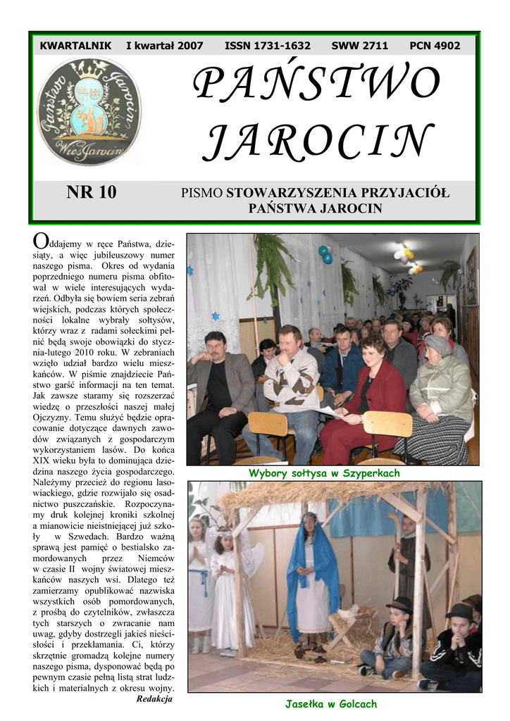 KWARTALNIK I kwartał 2007 ISSN 1731-1632 SWW 2711 PCN 4902 PAŃSTWO JAROCIN NR 10 PISMO STOWARZYSZENIA PRZYJACIÓŁ PAŃSTWA JAROCIN O ddajemy w ręce Państwa, dziesiąty, a więc jubileuszowy numer naszego pisma. Okres od wydania poprzedniego numeru pisma obfitował w wiele interesujących wydarzeń. Odbyła się bowiem seria zebrań wiejskich, podczas których społeczności lokalne wybrały sołtysów, którzy wraz z radami sołeckimi pełnić będą swoje obowiązki do stycznia-lutego 2010 roku. W zebraniach wzięło udział bardzo wielu mieszkańców. W piśmie znajdziecie Państwo garść informacji na ten temat. Jak zawsze staramy się rozszerzać wiedzę o przeszłości naszej małej Ojczyzny. Temu służyć będzie opracowanie dotyczące dawnych zawodów związanych z gospodarczym wykorzystaniem lasów. Do końca XIX wieku była to dominująca dziedzina naszego życia gospodarczego. Należymy przecież do regionu lasowiackiego, gdzie rozwijało się osadnictwo puszczańskie. Rozpoczynamy druk kolejnej kroniki szkolnej a mianowicie nieistniejącej już szkoły w Szwedach. Bardzo ważną sprawą jest pamięć o bestialsko zamordowanych przez Niemców w czasie II wojny światowej mieszkańców naszych wsi. Dlatego też zamierzamy opublikować nazwiska wszystkich osób pomordowanych, z prośbą do czytelników, zwłaszcza tych starszych o zwracanie nam uwag, gdyby dostrzegli jakieś nieścisłości i przekłamania. Ci, którzy skrzętnie gromadzą kolejne numery naszego pisma, dysponować będą po pewnym czasie pełną listą strat ludzkich i materialnych z okresu wojny. Redakcja Wybory sołtysa w Szyperkach Jasełka w Golcach Nr 10 I kwartał 2007 2 Nowo wybrani sołtysi z poszczególnych sołectw Domostawa Golce Jarocin Katy Cieśla Józef Ludian Edward Małek Tadeusz Wala Andrzej Kutyły Startek Zbigniew Majdan Golczański Ogłoszenie wyników wyborów na Sołtysa w Jarocinie Bielak Stanisław Mostki Szwedy Szyperki Zdziary Sroka Jan Nosek Jadwiga Podpora Janusz Dziurda Michał _______________________PAŃSTWO JAROCIN________________________ Nr 10 I kwartał 2007 3 Wybory sołtysów W okresie od 17 stycznia do 16 lutego 2007 r. we wszystkich dziesięciu sołectwach gminy Jarocin odbyły się zebrania wiejskie zorganizowane przez wójta gminy celem wyboru sołtysów i rad sołeckich na nową, czteroletnią kadencję 2006-2010. Aby zebranie w danym sołectwie było prawomocne i władne do podejmowania uchwał a zwłaszcza tej najważniejszej – o wyborze sołtysa i rady sołeckiej musiała brać w nim udział odpowiednia liczba osób, zgodna z uchwalonym statutem. Gdyby w zebraniu nie wzięła odpowiednia liczba osób, to w niektórych sołectwach zebranie mogłoby się odbyć po upływie 30 minut (Golce, Kutyły, Szwedy i Zdziary), a w innych do 14 dni po pierwszym terminie. Wszędzie frekwencja jednak dopisała i zebrania odbyły się bez przeszkód w pierwszym terminie. Najwięcej osób przyszło na zebranie w Jarocinie, najmniej w Kutyłach, ale procentowo w stosunku do liczby uprawnionych mieszkańców najwięcej w Katach (30,25%) a najmniej w Domostawie (10,14 %). W każdym zebraniu uczestniczył wójt gminy Zbigniew Walczak, który otwierał je i prowadził do momentu wyboru przewodniczącego zebrania oraz pracownik gminy odpowiedzialny za stronę techniczną i protokół. Wszędzie porządek formalny zebrania był podobny. W czasie, gdy komisje skrutacyjne zajmowały się przygotowywaniem kart do głosowania (wszystkie wybory były bowiem tajne) a następnie ustalaniem wyników głosowania, wójt zapoznawał zebranych z budżetem gminy na 2007 r. ze szczególnym uwzględnieniem wydatków danego sołectwa. W przerwach tych odbywała się także dyskusja o problemach sołeckich. W czasie zebrań zostało sformułowanych przez mieszkańców wiele wniosków dotyczących problemów poszczególnych sołectw celem ich rozwiązania przez władze gminy w bieżącej kadencji. Komisja skrutacyjna podczas wyborów na sołtysa w sołectwie Szwedy W sołectwie Szwedy mieszkańcy wiele pytali na temat przygotowywanej w ich sołectwie inwestycji pn. kanalizacja sanitarna wsi, której realizacja rozpocznie się w br., byli zainteresowani także sprzedażą działek budowlanych w swoim sołectwie oraz zdecydowali, którą działkę przeznaczają pod planowaną w przyszłości budowę świetlicy. W Szyperkach apelowali o pozostawienie szkoły i domagali się budowy boiska sportowego, na działce, którą wspólnota gruntowa przekazała gminie już dwa lata temu na ten właśnie cel. W Domostawie mieszkańcy domagali się dokończenia budowy chodnika oraz położenia asfaltowego dywanika na drodze do cmentarza. Mieszkańcy Kutył zgłaszali potrzebę modernizacji drogi przez wioskę, bo ta żużlowo–pyłowa wykonana po kanalizacji, w czasie letniej suszy bardzo się kurzy, natomiast jesienią i wiosną się rozjeżdża i powstają głębokie doły wypełnione wodą. Chcą również aby ogrodzić oczko wodne zwane „bagienkiem” usytuowane na działce wspólnoty gruntowej. Na zebraniu w Golcach poruszany był problem wskazania priorytetu inwestycji w sołectwie tzn. czy składać wniosek na modernizację drogi gminnej Górka – Dębowe, czy może przygotować projekt kanalizacji wsi i złożyć wniosek o dofinansowanie projektu wspólnie z gminą Ulanów, co rokuje dużą szansę uzyskania dofinansowania. Wydaje się naturalną kolejnością budowa kanalizacji przed modernizacją dróg, które podczas wykopów kanalizacyjnych w wielu miejscach mogą ulec dewastacji. W Majdanie Golczańskim mieszkańcy Kniei domagali się budowy kanalizacji sanitarnej w tym przysiółku, inni budowy oświetlenia ulicznego w przysiółku Brzozówka oraz budowy chodnika z kostki na odcinku od szkoły w kierunku drogi Jarocin–Golce. W Jarocinie była poruszona sprawa budowy gazociągu oraz potrzeby istnienia Gminnej Spółki Wodnej. W pierwszym przypadku wójt zobowiązał się do rozeznania w gminie, ilo