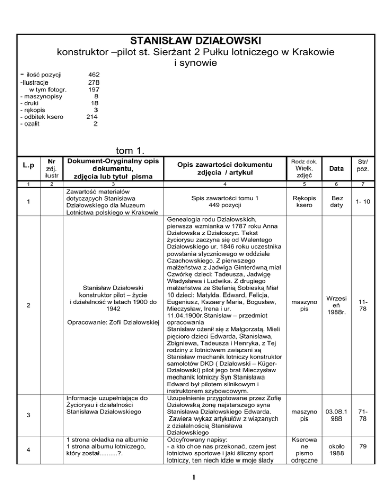 STANISŁAW DZIAŁOWSKI konstruktor –pilot st. SierŜant 2 Pułku lotniczego w Krakowie i synowie - ilość pozycji -Ilustracje w tym fotogr. - maszynopisy - druki - rękopis - odbitek ksero - ozalit 462 278 197 8 18 3 214 2 tom 1. L.p 1 1 2 Nr zdj. ilustr Dokument-Oryginalny opis dokumentu, zdjęcia lub tytuł pisma Opis zawartości dokumentu zdjęcia / artykuł 2 3 Zawartość materiałów dotyczących Stanisława Działowskiego dla Muzeum Lotnictwa polskiego w Krakowie Stanisław Działowski konstruktor pilot – Ŝycie i działalność w latach 1900 do 1942 Opracowanie: Zofii Działowskiej 3 4 Informacje uzupełniające do śyciorysu i działalności Stanisława Działowskiego 1 strona okładka na albumie 1 strona albumu lotniczego, który został..........?. Wielk. zdjęć Data Str/ poz. 4 5 6 7 Spis zawartości tomu 1 449 pozycji Rękopis ksero Bez daty 1- 10 maszyno pis Wrzesi eń 1988r. 1178 maszyno pis 03.08.1 988 7178 Kserowa ne pismo odręczne około 1988 79 Genealogia rodu Działowskich, pierwsza wzmianka w 1787 roku Anna Działowska z Działoszyc. Tekst Ŝyciorysu zaczyna się od Walentego Działowskiego ur. 1846 roku uczestnika powstania styczniowego w oddziale Czachowskiego. Z pierwszego małŜeństwa z Jadwiga Ginterówną miał Czwórkę dzieci: Tadeusza, Jadwigę Władysława i Ludwika. Z drugiego małŜeństwa ze Stefanią Sobieską Miał 10 dzieci: Matylda. Edward, Felicja, Eugeniusz, Kszaery Maria, Bogusław, Mieczysław, Irena i ur. 11.04.1900r.Stanisław – przedmiot opracowania Stanisław oŜenił się z Małgorzatą. Mieli pięcioro dzieci Edwarda, Stanisława, Zbigniewa, Tadeusza i Henryka, z Tej rodziny z lotnictwem związani są Stanisław mechanik lotniczy konstruktor samolotów DKD ( Działowski – KügerDziałowski) pilot jego brat Mieczysław mechanik lotniczy Syn Stanisława Edward był pilotem silnikowym i instruktorem szybowcowym. Uzupełnienie przygotowane przez Zofię Działowską Ŝonę najstarszego syna Stanisława Działowskiego Edwarda. Zawiera wykaz artykułów z wiązanych z działalnością Stanisława Działowskiego Odcyfrowany napisy: - a kto chce nas przekonać, czem jest lotnictwo sportowe i jaki śliczny sport lotniczy, ten niech idzie w moje ślady 1 Rodz dok. /Stanisław Działowski sierŜ. Pil 2p.l./ - W dowód pamięci kochanemu Edziowi za trudy w2łoŜone w moje wyszkolenie szybowcowe i urzeczywistnienie młodzieńczych marzeń, oprawił ten Album / podpis nieczytelny/ 5 1 6 7 8 9 2 3 4 Lew Ŝółty czerwonego muru niby wychodzący, w lewo tarczą obrócony, w przednich łapach trzyma koło Ŝelazne albo prawdę, jakie na stołach stawiają, z hełmu i korony takiŜ lew tylko trochę więcej widać jak na tarczy To herb rodziny Działowskich Działowscy Stanisław Działowski st. SierŜ. Małgorzata Działowska- Ŝona Stanisława Małgorzata i Stanisław Działowski 10 Świadectwo chrztu St. Działowskiego ur. w 1900roku w Mielcu w. 22.07.1915 Proboszcz ka.Pawlikowski FR. Imperium: Austria Regnum: Galiciae Districtus : Mielec Nrus. 13 11 1915 Świadectwo przynaleŜności do gminy w mielcu Stanisława Działowskiego 12 5 13 6 14 7 15 8 16 17 Stanisław Działowski rok1915ma 15lat w domu rodziców w Mielcu 9 16 letni Stanisław Działowski w wojsku austriackim 10 Stanisław Działowski 80 i str. odwr. Jednobarwny zarys wielkiego ( z labrami i klejnotem) herbu Prawdzic Druk wypukły Ok 1988 Opis herbu, rodowód i koligacje rodu Działowskich od protoplasty Mikołaja 1464 rok Zdjęcia stojącego Stanisława Działowskiego w mundurze galowym z czterema medalami, odznaką pilota i 2Pułku lotniczego u boku kordzik. Nieco wypłowiałe zdjęcie portretowe w sepii Małgorzata i Stanisław Działowscy przy awionetce DKD- III Oryginalny dokument Testimonium Ortus Et Baptismi Pater Valentinus Działowski en Joanna et Mirianna Ciuchucińska Mater Stephania Sobieska En Jacobo et Salomea GraŜkiewicz. Patrini ipsorumque conditio Joseph Beryński, Anna Beryński Obstetrix: Maria Swider Odręcznie napisany dokument, w którym Zarząd miasta Mielca potwierdza przynaleŜność Stanisława Działowskiego do gminy miasta Mielca Dokument podpisał Komisarz Rządowy Na dokumencie są dwie pieczęcie Sucha i Kauczukowa. Wyblakłe zdjęcie stojącego przed wejściem do domu St. Działowskiego z kotem na ręku. Piętnastoletni St. Działowski siedzi na parkowej ławce i gra instrumencie zbliŜonym do lutni –mandoliny. Wyblakłe zdjęcie legitymacyjne St. Działowskiego Piętnastoletni St. Działowski siedzi na parkowej ławce i gra instrumencie zbliŜonym do lutni –mandoliny Portret „amerykański” St. Działowskego w austriackim mundurze. Na kołnierzu odznaka przynaleŜności do oddziału lotn9iczego Portret „amerykański” st. Działowskiego Druk powielac zowy Ok 1988 81 Foto 14x9 Ok. 1928 82a Foto 14x9 Ksero 12x17 Ok. 1928 82b 1927 82c Blankiet 30 x 210 opłata 1 korona 22.07 1915 83 30x21 opłata 30 halerzy 23.07 1915 84 Foto 9x6 1915 85a 1915 85b 1915 85c Foto 6x4,5 1915 85d Repr. Foto 24x18 1916 86 Foto 1917 87a 2 Foto b.d. jakości 9x6 Foto 5x4 w mundurze austriackim 1917 w mundurze austriackim i z naszytymi polskimi węŜykami na kołnierzu i austriackimi gwiazdkami Zdjęcie modelu wykonanego prawdopodobnie przez St. Działowskiego. Model z austriackimi pasami, wyglądem zbliŜony do Fokkera DIII. elipsa 9x6 18 11 „Gotowy do lotu” zdjęcie wykonane 22.20,1917r. przez fotografa Wiktora Jadowskiego z mielca kolegi Stanisława Działowskiego 19 12 Stanisław Działowski Zdjęcia Działowskiego w batle dresie z krawatem 20 13 Stanisław Działowski z kolegami Trzej lotnicy z bałabajką, skrzypcami i mandolina w polskich mundurach pozują do zdjęcia przed Albatrosem? Foto owal sepia 5x4 Foto Sepia 8x11 Uszkodzone (brak ok.10% pow. Zdjęcia i wypłowiałe) zdjęcie 5osód ustawionych w szeregu Zdjęcie Walentego Działowskiego, ojca Stanisława wykonane z popękanej kliszy 21 14 22 15 Walenty Działowski z kulą, Ksawera Działowska, Stan