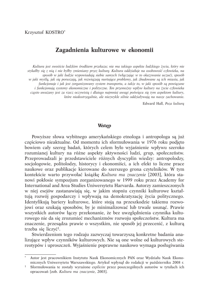 Krzysztof KOSTRO* Zagadnienia kulturowe w ekonomii Kultura jest swoiście ludzkim środkiem przekazu; nie ma takiego aspektu ludzkiego życia, który nie stykałby się z nią i nie byłby zmieniany przez kulturę. Kultura oddziałuje na osobowość człowieka, na sposób w jaki ludzie wypowiadają siebie samych (włączając w to okazywanie uczuć), sposób w jaki myślą, jak się poruszają, jak rozwiązują nurtujące problemy, jak zbudowane są ich miasta, jak funkcjonuje i jak jest zorganizowany system transportu, a także to, w jaki sposób są powiązane i funkcjonują systemy ekonomiczne i polityczne. Ten przemożny wpływ kultury na życie człowieka często uważany jest za rzecz oczywistą i dlatego najmniej uwagi poświęca się tym aspektom kultury, które niedostrzegalnie, ale niezwykle silnie oddziaływają na nasze zachowanie. Edward Hall, Poza kulturą Wstęp Powyższe słowa wybitnego amerykańskiego etnologa i antropologa są już częściowo nieaktualne. Od momentu ich sformułowania w 1976 roku podjęto bowiem cały szereg badań, których celem było wyjaśnienie wpływu szeroko rozumianej kultury na różne aspekty aktywności ludzi, grup, społeczeństw. Przeprowadzali je przedstawiciele różnych dyscyplin wiedzy: antropolodzy, socjologowie, politolodzy, historycy i ekonomiści, a ich efekt to liczne prace naukowe oraz publikacje kierowane do szerszego grona czytelników. W tym kontekście warto przywołać książkę Kultura ma znaczenie [2003], która stanowi pokłosie sympozjum zorganizowanego w 1999 roku przez Academy for International and Area Studies Uniwersytetu Harvarda. Autorzy zamieszczonych w niej esejów zastanawiają się, w jakim stopniu czynniki kulturowe kształtują rozwój gospodarczy i wpływają na demokratyzację życia politycznego. Identyfikują bariery kulturowe, które stoją na przeszkodzie takiemu rozwojowi oraz szukają sposobów, by je minimalizować lub trwale usunąć. Prawie wszystkich autorów łączy przekonanie, że bez uwzględnienia czynnika kulturowego nie da się zrozumieć mechanizmów rozwoju społeczeństw. Kultura ma znaczenie, przesądza prawie o wszystkim, nie sposób jej przecenić, z kulturą trzeba się liczyć. Stwierdzeniom tego rodzaju zazwyczaj towarzyszą konkretne badania analizujące wpływ czynników kulturowych. Nie są one wolne od kulturowych stereotypów i uproszczeń. Wyjaśnienie poprawne naukowo wymaga posługiwania * Autor jest pracownikiem Instytutu Nauk Ekonomicznych PAN oraz Wydziału Nauk Ekonomicznych Uniwersytetu Warszawskiego. Artykuł wpłynął do redakcji w październiku 2008 r. Sformułowania te zostały wyrażone explicite przez poszczególnych autorów w tytułach ich opracowań [zob. Kultura ma znaczenie, 2003]. 28 GOSPODARKA NARODOWA Nr 3/2009 się „solidnymi” zmiennymi kulturowymi oraz identyfikacji ścisłego związku między „kulturową” przyczyną a gospodarczym skutkiem. Tymczasem trudności w ilościowym ujęciu zmiennych kulturowych i związków przyczynowo‑skutkowych łączących je z parametrami gospodarczymi powodują, że analizy odwołujące się do kultury nie dają jednoznacznej odpowiedzi na pytanie, co powoduje rozwój gospodarczy. Kronika sukcesów i porażek jest długa i urozmaicona; w przywołanej wyżej książce Richard Shweder napisał [Kultura ma znaczenie, 2003, s. 263]: Sycylia w XV wieku, Holandia w XVI, Japonia dziś – badacze społeczni mogą swobodnie wybierać ludy, kultury lub narody i przytaczać wiarygodne powody ich ekonomicznej porażki lub sukcesu. (...) Spróbujmy za Davidem Landesem (1998) i jego monumentalną historią gospodarczą świata wyliczyć wszystkie możliwe czynniki warunkujące bogactwo. Odpowiedzmy na pytanie: Czy któryś z tych czynników jest wystarczający do wytworzenia ekonomicznego bogactwa? Odpowiedź jest przecząca. A czy któryś z tych czynników jest przynajmniej konieczny? O ile powody konkretnych osiągnięć ekonomicznych są identyfikowane, to ogólne przyczyny sukcesu gospodarczego pozostają nie odkryte. Dobrą tego ilustracją jest zamieszanie wokół kultury krajów Azji. Lucian Pye, kolejny uczestnik sympozjum na Uniwersytecie Harvarda, zastanawiając się nad tym, czy czynniki kulturowe stanowią właściwe źródło wyjaśnienia rozwoju gospodarczego poszczególnych narodów, przywołuje przykład azjatyckich krajów, które w okresie kilku dziesięcioleci przeszły z fazy skrajnej stagnacji do dynamicznego wzrostu gospodarczego, by następnie doświadczyć kryzysów i popaść w stan zapaści (efekt dynama i domina) [Kultura ma znaczenie, 2003, s. 362‑378]. Zagadkę stanowi to, że mimo tych przemian fundamenty kultur owych krajów pozostały w tym czasie niezmienne. Autor formułuje dwie hipotezy, które wyjaśniają, jak te same wartości kulturowe mogły prowadzić do tak skrajnie odmiennych rezultatów. Po pierwsze, niezmienne wartości kulturowe funkcjonowały w różnych okolicznościach, co sprawiło, iż czynniki, które wcześniej generowały korzystne efekty, z czasem zmieniły w nowych uwarunkowaniach swój charakter, tworząc niepożądane skutki. Po drugie, wartości kulturowe nie są jednorodne, składają się z wiązek wartości; każda z tych wartości zależnie od okoliczności może różnie wpływać na bieg życia społecznego i dawać odmienne rezultaty. Niezależnie od trudności, na jakie napotykają badania kulturowe, przekonanie o tym, że zjawiska gospodarcze są determinowane czynnikami wyrosłymi z kultury ma w ekonomii długą historię. Już Adam Smith opisywał życie gospodarcze jako złożony proces, głęboko zakorzeniony w tradycji i obyczajach społeczeństwa. Niekwestionowanym autorytetem nadal pozostaje Max Weber; mimo że jego koncepcje jakością i charakterem odbiegają od aktualnie prowadzonych badań, nadal są chętnie przywoływane, zwłaszcza te stanowiące treść książki Etyka protestancka a duch kapitalizmu. Wynikać to może z dwóch powodów