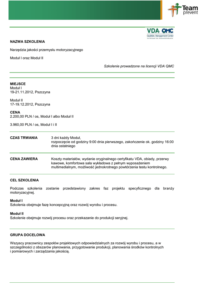 NAZWA SZKOLENIA Narzędzia jakości przemysłu motoryzacyjnego Moduł I oraz Moduł II Szkolenie prowadzone na licencji VDA QMC MIEJSCE Moduł I 19-21.11.2012, Pszczyna Moduł II 17-19.12.2012, Pszczyna CENA 2.200,00 PLN / os, Moduł I albo Moduł II 3.960,00 PLN / os, Moduł I i II CZAS TRWANIA 3 dni każdy Moduł, rozpoczęcie od godziny 9:00 dnia pierwszego, zakończenie ok. godziny 16:00 dnia ostatniego CENA ZAWIERA Koszty materiałów, wydanie oryginalnego certyfikatu VDA, obiady, przerwy kawowe, komfortowa sala wykładowa z pełnym wyposażeniem multimedialnym, możliwość jednokrotnego powtórzenia testu kontrolnego. CEL SZKOLENIA Podczas szkolenia motoryzacyjnej. zostanie przedstawiony zakres faz projektu specyficznego dla branży Moduł I Szkolenia obejmuje fazę koncepcyjną oraz rozwój wyrobu i procesu. Moduł II Szkolenie obejmuje rozwój procesu oraz przekazanie do produkcji seryjnej. GRUPA DOCELOWA Wszyscy pracownicy zespołów projektowych odpowiedzialnych za rozwój wyrobu i procesu, a w szczególności z obszarów planowania, przygotowanie produkcji, planowania środków kontrolnych i pomiarowych i zarządzania jakością. PROGRAM SZKOLENIA Narzędzi jakości przemysłu motoryzacyjnego, cz I ZAKRES SZKOLENIA: APQP / Planowanie projektu (VDA 4.3); fazy 1 i 2, Analiza systemu, FMEA wyrobu, Prototypowy plan kontroli, Ćwiczenia praktyczne do wybranych metod Narzędzi jakości przemysłu motoryzacyjnego, cz II ZAKRES SZKOLENIA: APQP / Planowanie projektu (VDA 4.3); fazy 3 i 4, Analiza systemu pomiarowego MSA, Przydatność środków kontrolnych i procesu kontroli VDA 5, Zdolność procesu Pp i Ppk, ewentualnie Cp i Cpk, PPF (VDA 2) i PPAP, Karty kontrolne / SPC, Metoda 8D, Ćwiczenia praktyczne do wybranych metod, Sprawdzenie postępów: pisemny test wyboru po południu trzeciego dnia. UWAGA: Po pozytywnym wyniku egzaminu (na koniec trzeciego dnia Modułu II) uczestnik otrzymuje certyfikat VDA z numerem rejestracji wraz z kartą „Automotive Core Tools Proffesional” i odpowiadającym jej wpisem do bazy danych VDA. Team Prevent Poland Sp. z o.o. ul. Warowna 8 PL 43-200 Pszczyna phone: +48 32 73 38 219 fax: +48 32 21 25 091 www.teamprevent.pl