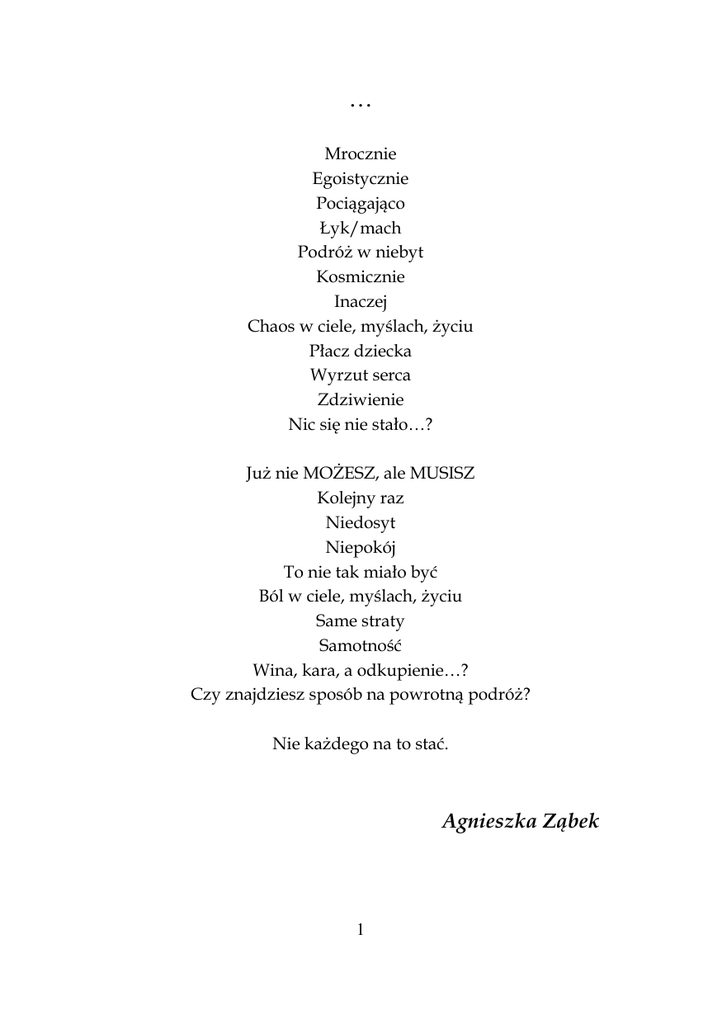 … Mrocznie Egoistycznie Pociągająco Łyk/mach Podróż w niebyt Kosmicznie Inaczej Chaos w ciele, myślach, życiu Płacz dziecka Wyrzut serca Zdziwienie Nic się nie stało…? Już nie MOŻESZ, ale MUSISZ Kolejny raz Niedosyt Niepokój To nie tak miało być Ból w ciele, myślach, życiu Same straty Samotność Wina, kara, a odkupienie…? Czy znajdziesz sposób na powrotną podróż? Nie każdego na to stać. Agnieszka Ząbek 1 Ach te nałogi… Wino, wódka, piwo, sex, co to właściwie dzisiaj jest? Pytasz mnie... Nie warto! Bo to jest coś czym dzisiaj żyje się. A młodzi ludzie-tu i tam (bar, pub, lub inne miejsca odwiedzają wszak). Bawić się chcą! Jeden łyk promili barwy twego życia umili. Mówią. Czy, aby na pewno? Wierzą, że TAK. Najlepiej w żyłę sobie daj! Ciężki kaliber -powiadasz, jak strzał w tarczę trzymając giwerę dwa. Pytasz jaka kula przebije tarczę? Odpowiem -promile. Łykasz kolejny łyk, trunek przejmuje kontrole. Zabawa trwa, a rano co? KAC .Nie przejmujesz się. Dalej brniesz...Zatracasz się! Wygrywa co? NAŁÓG no! A gdzie wizje, gdzie repertuar Mehoffera i Wyspiańskiego, gdzie Leonardo da Vinci? No powiedz sama dziewczyno, czy po promilach już to widziałaś i tym się właśnie pałałaś? Nie, nie widziałaś bo wiatraki w głowie miałaś. Piją dużo, palą, kłócą się, a potem smucą. Wódka, piwo, sex, dochodzi jeszcze Facebook i net. Eh... już to NAŁÓG jest. Joanna Pączek 2 Nadzieja Nadszedł nowy dzień i jak każdy kolejny stanowi życia test jest pozytywny, wszystko zmienił jeden ręki gest. Z tym momentem jesteś w innym świecie szczęśliwy, wolny i spełniony choć zniewolony – zrelaksowany, bardzo roztargniony… Znów Ty – Ona i cztery ściany w jej ramiona oplatany budują radości te chwile trudne i momenty złudne To chwila szczęścia? Która w swej klatce zamyka swego więźnia on wciąż, tego co się dzieje jest nieświadomy, nie może w sobie pozbierać myśli złożonych Patrzy w jej oczy, widzi iż ją doskonale zna lecz jak na imię jej? Jakoś na A. kolejny gest ręki zakończył myśli i męki Zakończył walkę i mózg jak świeczka zgasnął… ukojony w letargu po prosty zasnął Jutro kolejny dzień walki ducha z ciałem przeciwko cieczy chyba tylko sen doraźnie tę walkę uleczy… Piotr Cielesta 3 ECCE HOMO Finis coronat opus? Na obraz i podobieństwo czyje byt inferalny z niebytu otchłani zrodzony we łzach pocie i krwi czego marne symulakrum odbiciem substancji materialnej marność z czym istotowo zjednoczona? Finis coronat opus? Demiurgicznej siły dzieło chybione Płód poroniony na wegetację w otchłani kloaki skazany Apokalipsa codzienna dokonana Pandemonium w tkance co na wskroś zbolałym wrzodem skorodowana urzeczywistnione Nie trawa na wietrze tchnieniem kołysana a pokos pokłosia orkanem zmiażdżony 4 Odpad nieodnawialny Energii źródło wyczerpane Dualizmu żywe zaprzeczenie Świątyni iluzorycznej profanum Majestat upodlony Czara goryczy przelana Vitam regit fortuna non sapientia a ta toczy się jak chce na pochwałę głupoty istotowo wcielonej Finis coronat opus? Choćbym nawet szedł po czeluści dnie zła się nie ulęknę Bo zło jest we mnie Oto człowiek – homo sapiens fossilis Żywa skamielina Chodzący trup Bez szans na zmartwychwstanie…? Piotr Cielesta 5 Czterdzieści procent (40 %) W Twoim ciele walczą bestie, przyzywają trwogi, smutki, szukasz drogi, by je zniszczyć, sprawić, aby ból był krótki. Lecz alkohol to nie wyjście, chce być twoim przyjacielem, jednak nim się opamiętasz, staniesz się zniszczenia celem. Sposób najprostszy Wódę porzucić, nałóg wyjściem być nie musi, znaleźć oparcie w bliskich osobach i pieśń zwycięstwa zanucić. Radosław Bigaj 6 DŻIN Z Butelki Każdy szuka świata z bajki, fajne ciuchy, buty z Najki, życie jednak nie jest dobre, rzadko bywa takie szczodre. DŻIN życzenia spełni szybko, jednak Ty mu oddasz wszystko. Szybko zniknie, jak swe dary, pozostaną po nim opary. Łatwo znaleźć następnego, podszlifować swoje ego. Ale cena jest straszliwa, żona dzieci, dom też bywa. Czy Twa psycha jest tak mocną, by przechytrzyć zmorę nocną? Jeśli tak, to niechaj znika, niech DŻIN wraca do czajnika!!! Radosław Bigaj 7 Stop nałogom Koleżanko i kolego, zapamiętaj wierszyk ten: zdrowie trzeba pielęgnować, o nie bardzo troszczyć się. Bo, gdy będziesz o nie dbał, będziesz długie życie miał. Jeśli alkohol będziesz spożywał i agresję okazywał to alkohol - dziwna rzecz odbierze Ci do życia chęć. Dopalacze są nie lepsze każdy Ci to powie wreszcie. Papierosy są szkodliwe, a zarazem dokuczliwe. W nich zawarta nikotyna to nałogu jest przyczyna. A, gdy z nich dym będziesz wdychał i choroby napotykał to nie będzie dobrze z Tobą, lepiej pracuj już nad sobą. Nie chodź razem z palaczami. Rzuć palenie i bądź z nami! 8 Zamiast narkotyki brać, alkoholu dużo pić to na spacer teraz idź! A na dobre wyjdzie Ci. Porzuć picie i palenie, a włącz zdrowe myślenie. Konsekwencja z tego duża, nasz organizm jest jak burza. Pogrzmi troszkę i przestanie, jeśli zaczniesz dobre odżywianie. Zapamiętaj słowa te: Papierosy i alkohol zatruwają Twoje zdrowie. Każdy Ci to mądrze powie, a więc słuchaj nas, bo jest na to teraz czas. Abyś zdrowy zawsze był i z uśmiechem w pełni żył ... Gabriela Augustynek 9 Nałogi Nie tłumacz że takie jest życie, Nie mów, że tak musi być. Bo wiem, że głęboko, tak skrycie Jesteś jeszcze dawnym kimś. Kimś kto ma silną wolę Walczy, by stać się silniejszym, Lecz dziś zmieniłeś swą rolę, To nałóg nad Tobą zwyciężył. Nie mów że inni tak robią, Przecież swój rozum masz, Bo może z następną dobą Skończy się Twój czas. Wiktoria Kosowska 10 W ciemności A co będzie, gdy tam pójdzie? Może szczęście i atrakcje? Może smutek? Może kaźnie? Po co czynić w ciemności kroki? Aby racje udowodnić? Bo dorosłym chcesz się