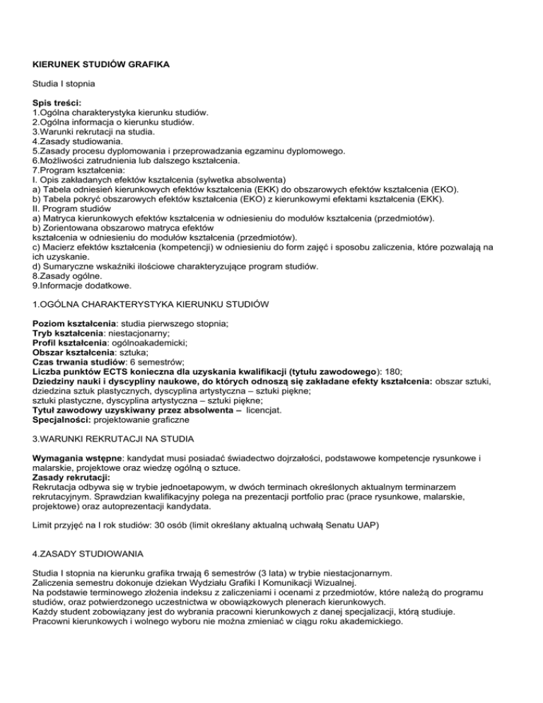 KIERUNEK STUDIÓW GRAFIKA Studia I stopnia Spis treści: 1.Ogólna charakterystyka kierunku studiów. 2.Ogólna informacja o kierunku studiów. 3.Warunki rekrutacji na studia. 4.Zasady studiowania. 5.Zasady procesu dyplomowania i przeprowadzania egzaminu dyplomowego. 6.Możliwości zatrudnienia lub dalszego kształcenia. 7.Program kształcenia: I. Opis zakładanych efektów kształcenia (sylwetka absolwenta) a) Tabela odniesień kierunkowych efektów kształcenia (EKK) do obszarowych efektów kształcenia (EKO). b) Tabela pokryć obszarowych efektów kształcenia (EKO) z kierunkowymi efektami kształcenia (EKK). II. Program studiów a) Matryca kierunkowych efektów kształcenia w odniesieniu do modułów kształcenia (przedmiotów). b) Zorientowana obszarowo matryca efektów kształcenia w odniesieniu do modułów kształcenia (przedmiotów). c) Macierz efektów kształcenia (kompetencji) w odniesieniu do form zajęć i sposobu zaliczenia, które pozwalają na ich uzyskanie. d) Sumaryczne wskaźniki ilościowe charakteryzujące program studiów. 8.Zasady ogólne. 9.Informacje dodatkowe. 1.OGÓLNA CHARAKTERYSTYKA KIERUNKU STUDIÓW Poziom kształcenia: studia pierwszego stopnia; Tryb kształcenia: niestacjonarny; Profil kształcenia: ogólnoakademicki; Obszar kształcenia: sztuka; Czas trwania studiów: 6 semestrów; Liczba punktów ECTS konieczna dla uzyskania kwalifikacji (tytułu zawodowego): 180; Dziedziny nauki i dyscypliny naukowe, do których odnoszą się zakładane efekty kształcenia: obszar sztuki, dziedzina sztuk plastycznych, dyscyplina artystyczna – sztuki piękne; sztuki plastyczne, dyscyplina artystyczna – sztuki piękne; Tytuł zawodowy uzyskiwany przez absolwenta – licencjat. Specjalności: projektowanie graficzne 3.WARUNKI REKRUTACJI NA STUDIA Wymagania wstępne: kandydat musi posiadać świadectwo dojrzałości, podstawowe kompetencje rysunkowe i malarskie, projektowe oraz wiedzę ogólną o sztuce. Zasady rekrutacji: Rekrutacja odbywa się w trybie jednoetapowym, w dwóch terminach określonych aktualnym terminarzem rekrutacyjnym. Sprawdzian kwalifikacyjny polega na prezentacji portfolio prac (prace rysunkowe, malarskie, projektowe) oraz autoprezentacji kandydata. Limit przyjęć na I rok studiów: 30 osób (limit określany aktualną uchwałą Senatu UAP) 4.ZASADY STUDIOWANIA Studia I stopnia na kierunku grafika trwają 6 semestrów (3 lata) w trybie niestacjonarnym. Zaliczenia semestru dokonuje dziekan Wydziału Grafiki I Komunikacji Wizualnej. Na podstawie terminowego złożenia indeksu z zaliczeniami i ocenami z przedmiotów, które należą do programu studiów, oraz potwierdzonego uczestnictwa w obowiązkowych plenerach kierunkowych. Każdy student zobowiązany jest do wybrania pracowni kierunkowych z danej specjalizacji, którą studiuje. Pracowni kierunkowych i wolnego wyboru nie można zmieniać w ciągu roku akademickiego. 5.ZASADY PROCESU DYPLOMOWANIA I PRZEPROWADZANIA EGZAMINU DYPLOMOWEGO Warunkiem realizacji praktycznej pracy dyplomowej z wybranego przedmiotu kierunkowego jest zaliczenie z tego przedmiotu w toku studiów minimum dwóch semestrów, włączając semestr dyplomowy. Student może być dopuszczony do obrony dyplomu po uzyskaniu absolutorium, czyli wypełnieniu wszystkich przewidzianych programem studiów warunków, w tym zaliczeniu wszystkich przedmiotów, odbyciu obowiązkowych plenerów studenckich. Praca dyplomowa na poziomie studiów licencjackich powinna składać się z części praktycznej i teoretycznej. Zaleca się, aby część teoretyczna miała związek z częścią praktyczną/artystyczną. Zakres licencjackiej pracy dyplomowej obejmuje: – wykonanie i przedstawienie pracy praktycznej związanej z kierunkiem studiów i specjalnością oraz prezentacja portfolio – przygotowanie i przedłożenie pracy teoretycznej zawierającej przypisy i ilustracje, około 15 stron związanej treścią z praca praktyczną – oprawa pracy: (paragraf 56 z regulaminu studiów) 6.MOŻLIWOŚCI ZATRUDNIENIA LUB DALSZEGO KSZTAŁCENIA Absolwent legitymujący się dyplomem licencjata może pracować jako grafik w agencji reklamowej, drukarni, branży projektowej lub jako freelancer a także jako animator kultury. Uzyskanie tytułu licencjata upoważnia do kontynuacji studiów na poziomie magisterskim w macierzystej uczelni, a także na innych uczelniach artystycznych i nieartystycznych w Polsce i za granicą. 7.PROGRAM KSZTAŁCENIA Ogólne informacje związane z programem kształcenia (ogólne cele kształcenia): Zdobycie ogólnej wiedzy dotyczącej tworzenia; dzieła graficznego, projektowania graficznego oraz podstawowej wiedzy z zakresu kompozycji plastycznej, zagadnień dotyczących technologii i warsztatu graficznego także obsługi graficznych programów komputerowych, przygotowania projektu graficznego do druku, prezentowania i wystawiania zarówno dzieła jak i projektu graficznego. Absolwent po ukończeniu studiów licencjackich na kierunku Grafika pogłębia świadomość artystyczną, rozwija kompetencje społeczne, jest artystą przygotowanym do samodzielnej pracy twórczej oraz potrafi łączyć tę pracę ze znajomością jej społecznych i rynkowych uwarunkowań. I. OPIS ZAKŁADANYCH EFEKTÓW KSZTAŁCENIA: a) Tabela odniesień kierunkowych efektów kształcenia (EKK) do obszarowych efektów kształcenia (EKO) Nazwa kierunku studiów: Grafika Obszar kształcenia: sztuka Poziom kształcenia: studia I stopnia – licencjat Tryb kształcenia: niestacjonarny Profil kształcenia : ogólnoakademicki Symbol EFEKTY KSZTAŁCENIA DLA KIERUNKU GRAFIKA Po ukończeniu studiów pierwszego stopnia na kierunku GRAFIKA absolwent: Odniesienie do efektów kształcenia dla obszaru kształcenia w zakresie sztuki, w dziedzinie sztuki plastyczne WIEDZA K_W01 posiada ogólną wiedzę dotyczącą tworzenia; dzieła graficznego, projektowania graficznego oraz podstawową wiedzę z zakresu kompozycji plastycznej A1_W10 K_W02 zna podstawowe zagadnienia dotycząc