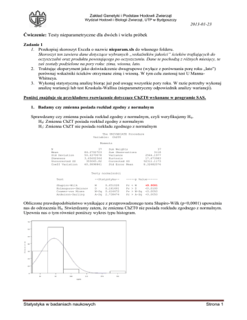 Zakład Genetyki i Podstaw Hodowli Zwierząt Wydział Hodowli i Biologii Zwierząt, UTP w Bydgoszczy 2013-01-23 Ćwiczenie: Testy nieparametryczne dla dwóch i wielu próbek Zadanie 1 1. Przekopiuj skoroszyt Excela o nazwie nieparam.xls do własnego folderu. Skoroszyt ten zawiera dane dotyczące wybranych „wskaźników jakości” ścieków trafiających do oczyszczalni oraz produktu powstającego po oczyszczeniu. Dane te pochodzą z różnych miesięcy, te zaś zostały podzielone na pory roku: zima, wiosna, lato. 2. Traktując eksperyment jako doświadczenie dwugrupowe (wyłącz z porównania porę roku „lato”) porównaj wskaźniki ścieków otrzymane zimą i wiosną. W tym celu zastosuj test U MannaWhitneya. 3. Wykonaj statystyczną analizę biorąc już pod uwagę wszystkie pory roku. W razie potrzeby wykonaj analizę wariancji lub test Kruskala-Wallisa (nieparametryczny odpowiednik analizy wariancji). Poniżej znajduje się przykładowe rozwiązanie dotyczące ChZT0 wykonane w programie SAS. 1. Badamy czy zmienna posiada rozkład zgodny z normalnym Sprawdzamy czy zmienna posiada rozkład zgodny z normalnym, czyli weryfikujemy H 0. H0: Zmienna ChZT posiada rozkład zgodny z normalnym H1: Zmienna ChZT nie posiada rozkładu zgodnego z normalnym The UNIVARIATE Procedure Variable: ChZT0 Moments N Mean Std Deviation Skewness Uncorrected SS Coeff Variation 37 84.2702703 50.6379078 3.65602344 355065.82 60.0898841 Sum Weights Sum Observations Variance Kurtosis Corrected SS Std Error Mean 37 3118 2564.1977 17.673983 92311.1173 8.32482076 Testy normalności Test --Statystyka-- -----p Value------ Shapiro-Wilk Kolmogorov-Smirnov Cramer-von Mises Anderson-Darling W D W-Sq A-Sq Pr Pr Pr Pr 0.651028 0.181491 0.416672 2.738474 < > > > W D W-Sq A-Sq <0.0001 <0.0100 <0.0050 <0.0050 Obliczone prawdopodobieństwo wynikające z przeprowadzonego testu Shapiro-Wilk (p<0,0001) upoważnia nas do odrzucenia H0. Stwierdzamy zatem, że zmienna ChZT0 nie posiada rozkładu zgodnego z normalnym. Upewnia nas o tym również poniższy wykres typu histogram. Statystyka w badaniach naukowych Strona 1 Zakład Genetyki i Podstaw Hodowli Zwierząt Wydział Hodowli i Biologii Zwierząt, UTP w Bydgoszczy 2013-01-23 2. Obliczamy miary położenia klasyczne i pozycyjne ChZT0 pora lato N wiosna zima 16 13 8 Mean 73.89 110.56 62.30 Median 69.70 94.80 61.05 Q1 50.80 72.70 47.05 Q3 93.20 116.50 67.20 Std 28.78 72.27 19.40 3. Porównujemy pory roku a) b) Statystyka w badaniach naukowych Strona 2 Zakład Genetyki i Podstaw Hodowli Zwierząt Wydział Hodowli i Biologii Zwierząt, UTP w Bydgoszczy 2013-01-23 c) Wyniki: Test sum rang Wilcoxona jest odpowiednikiem testu U Mann-Whitney’a Porównujemy poziom ocenianych wskaźników ścieków między zimą i wiosną. Weryfikujemy zatem hipotezę zerową zakładającą, iż rozkład ChZT stwierdzony zimą i wiosną jest taki sam: H0: F(x) = G(x); H1: F(x) ≠ G(x) F(x), G(x) – dystrybuanta ChZT zimą i wiosną Wcześniej z importowanego pliku nieparam należy utworzyć podzbiór zawierający dane dotyczące zimy i wiosny. Powyższy efekt uzyskamy na drodze Budowy zapytań. The NPAR1WAY Procedure Wilcoxon Scores (Rank Sums) dla zmiennej ChZT0 klasyfikowanej wg zmiennej pora Suma Oczekiwane Odch. std. Średnia pora N ocen poniżej H0 poniżej H0 ocena zima 8 48.0 88.0 13.803726 6.000000 wiosna 13 183.0 143.0 13.803726 14.076923 Dla więzów użyto ocen przeciętnych. Wilcoxon Two-Sample Test Statystyka 48.0000 Normal Approximation Z One-Sided Pr < Z Two-Sided Pr > |Z| -2.8615 0.0021 0.0042 t Approximation One-Sided Pr < Z Two-Sided Pr > |Z| 0.0048 0.0096 Z includes a continuity correction of 0.5. Kruskal-Wallis Test Chi-kwadrat Stopień swobody Pr > Chi-kwadrat 8.3971 1 0.0038 Otrzymane prawdopodobieństwo pozwala odrzucić H0. Stwierdzamy zatem, że poziom ChZT0 jest statystycznie różny zimą i wiosną. Statystyka w badaniach naukowych Strona 3 Zakład Genetyki i Podstaw Hodowli Zwierząt Wydział Hodowli i Biologii Zwierząt, UTP w Bydgoszczy 2013-01-23 Test Kruskal-Wallis Tym razem bierzemy pod uwagę wszystkie pory roku. Sprawdzamy czy pora roku wpływa statystycznie na uzyskane pomiary. Weryfikujemy hipotezę zerową zakładającą, iż rozkład ChZT w k populacjach jest taki sam: H0: F1(x) = F2(x) =... = Fk(x) H1: F1(x) ≠ F2(x) ≠...≠ Fk(x) F1(x), F2(x), Fk(x) – dystrybuanty rozpatrywanych populacji. The NPAR1WAY Procedure Wilcoxon Scores (Rank Sums) dla zmiennej ChZT0 klasyfikowanej wg zmiennej pora Suma Oczekiwane Odch. std. Średnia pora N ocen poniżej H0 poniżej H0 ocena zima 8 99.0 152.0 27.101522 12.375000 wiosna 13 333.0 247.0 31.428741 25.615385 lato 16 271.0 304.0 32.615146 16.937500 Dla więzów użyto ocen przeciętnych. Kruskal-Wallis Test Chi-kwadrat Stopień swobody Pr > Chi-kwadrat 8.4354 2 0.0147 Wartość testu Kruskal-Wallis wynosi 8,4354. Obliczone prawdopodobieństwo (p<0,0147) umożliwia odrzucenie H0. Wyniki analizy pozwalają tym samym stwierdzić, że pora roku wpływa statystycznie istotnie na poziom badanego wskaźnika. Zadanie 2. Sprawdź czy noszenie przez 2 tygodnie szkieł kontaktowych wpłynęło na zmianę grubości rogówki oka ludzkiego? (oczy.xls) Statystyka w badaniach naukowych Strona 4